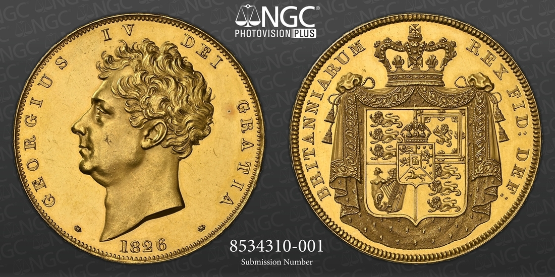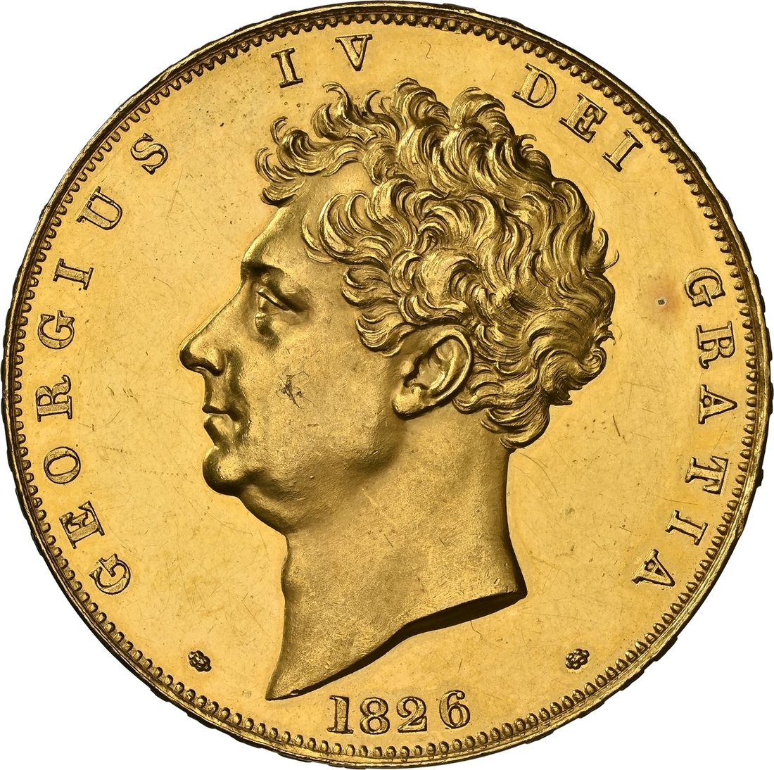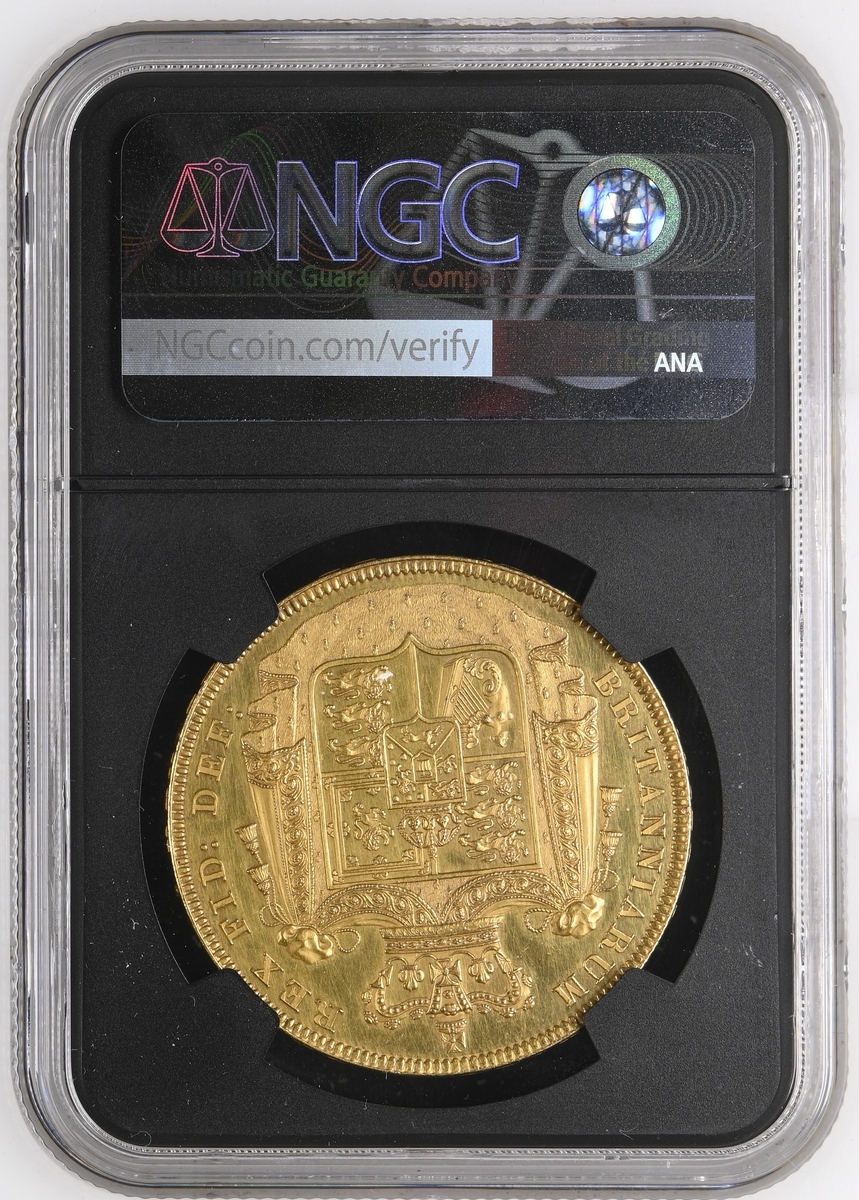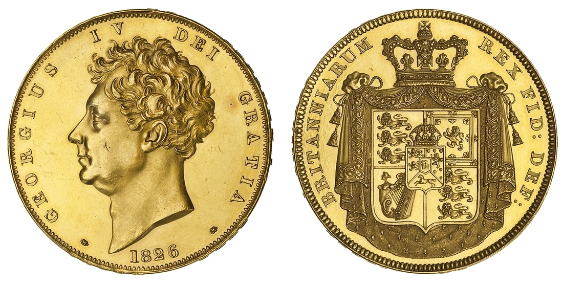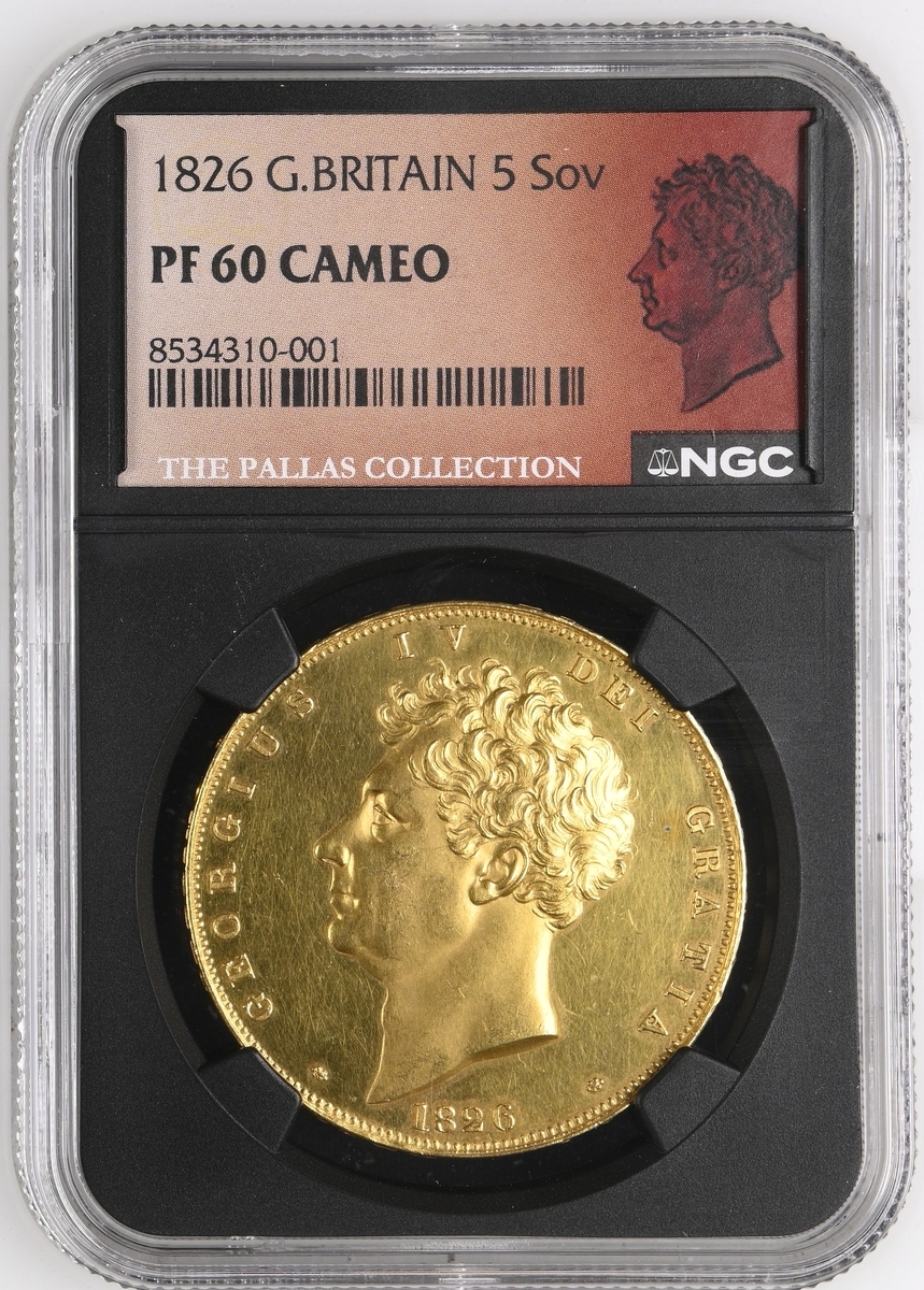 (g) NGC PF60 | George IV (1820-1830), Pattern Five Pounds, 1826 SEPTIMO, 'Wide 6' in date, struck in ternary 22ct "Red Gold" Alloy, GEORGIUS IV DEI GRATIA, bare head left, rev. BRITANNIARUM REX FID: DEF:, crowned shield in mantle, seven semée of hearts, DECUS ET TUTAMEN * ANNO REGNI SEPTIMO * in raised lettering downwards on edge, 39.905g [615.8grns], 6h (L&S 27; W&R 213; Hocking 1906; S.3797), light cabinet friction in otherwise brilliant original fields, some minor contact points on cheek and a toning spot by G of GRATIA, otherwise a pleasingly bold extremely fine, presumed only 400 struck, in NGC Black 'Pallas' holder, conservatively graded PF60 (Cert. #8534310-001)