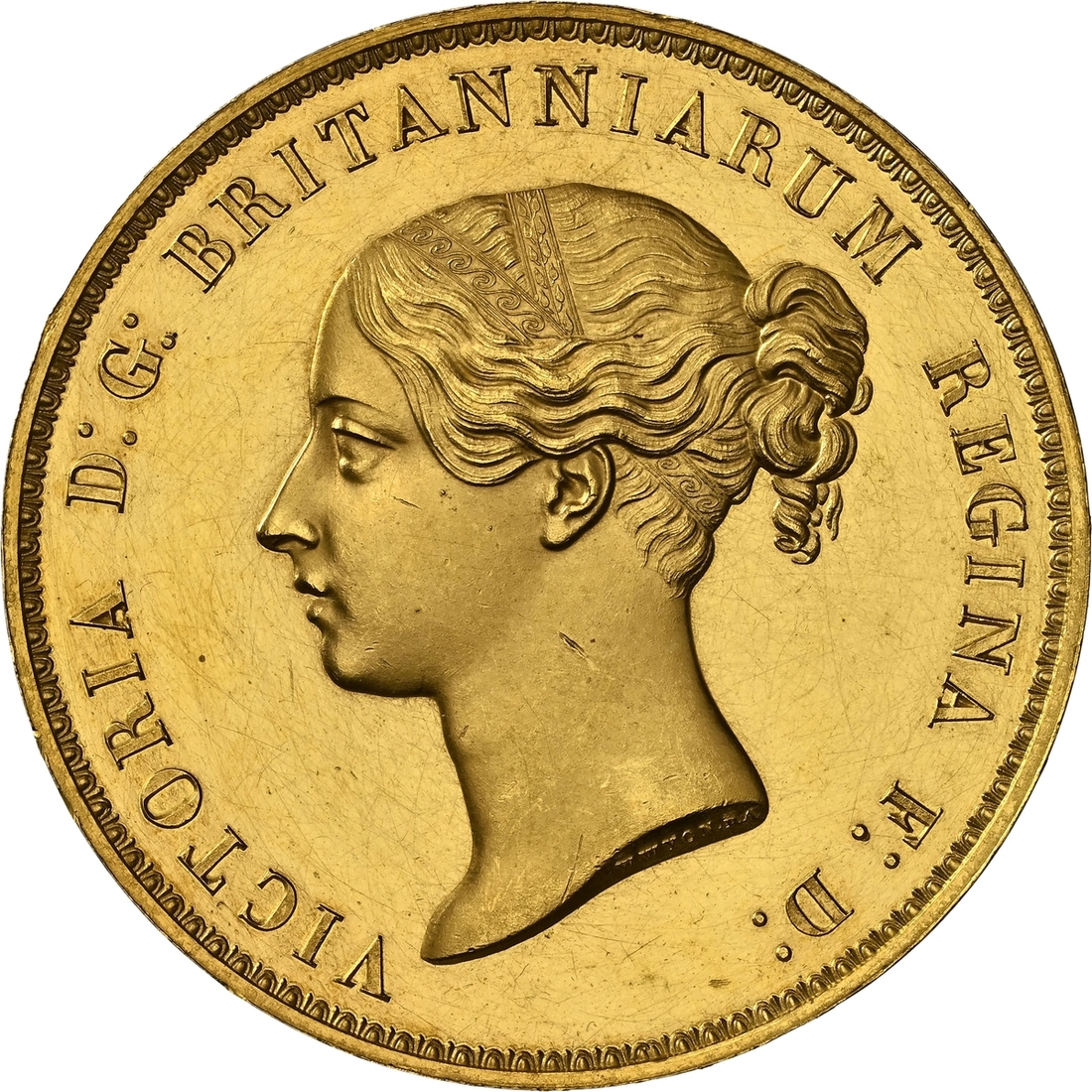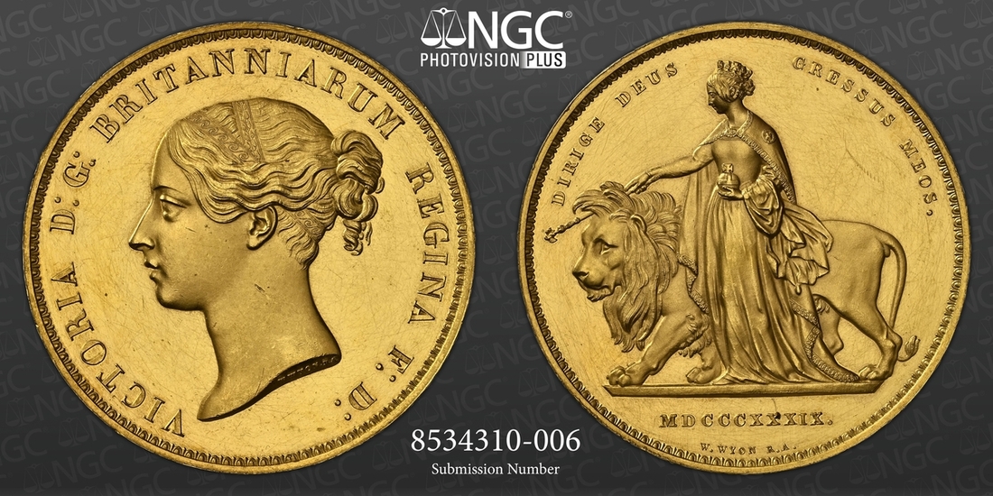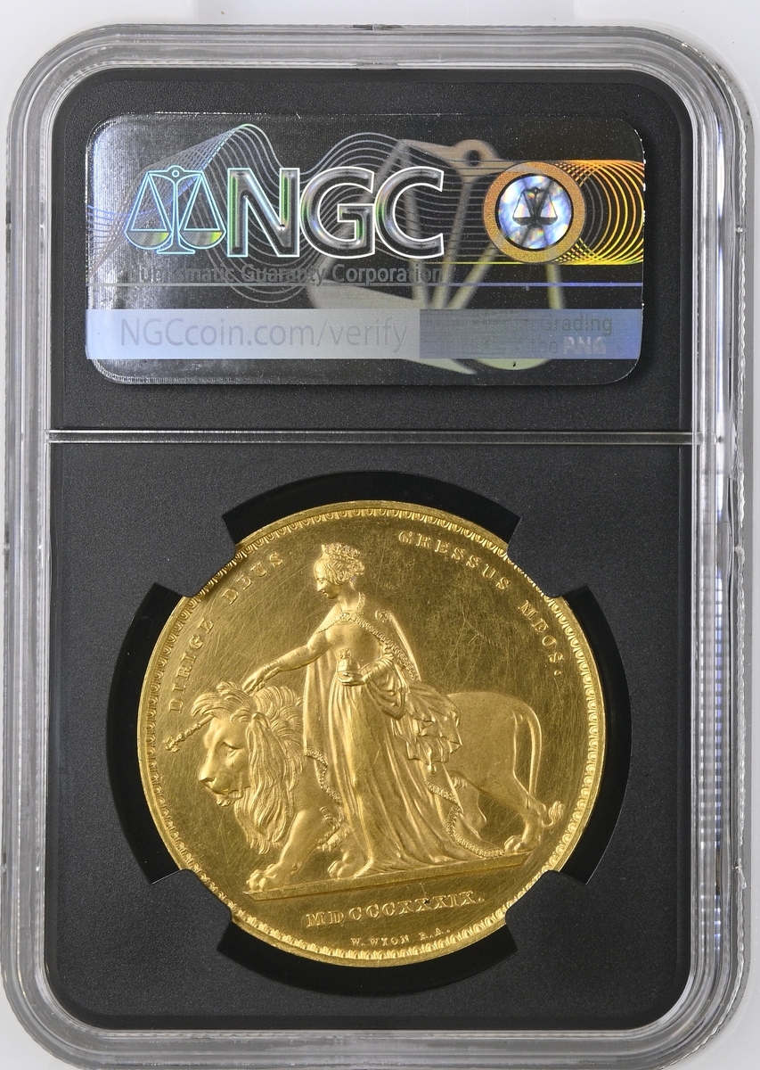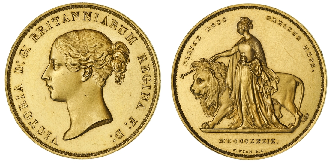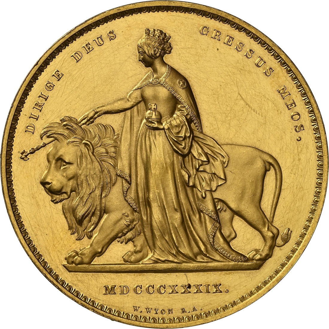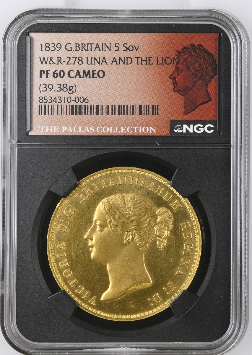 (g) NGC PF60 CAM | Victoria (1837-1901), Pattern Five-Pounds, 1839 TERTIO, "Una and the Lion", by William Wyon, VICTORIA D: G: BRITANNIARUM REGINA F: D: young diademed head left scroll-garnished fillet (6 / 3), one eleven-leaved floral-garnished fillet, W. WYON R.A. on truncation, rev. en médaille, DIRIGE DEUS GRESSUS MEOS. Queen Victoria leading the British Lion, wearing Mantle and Badge of the Most Noble Order of the Garter; an allegory of Edmund Spenser's 'Faerie Quene', DECUS ET TUTAMEN * ANNO REGNI TERTIO * in raised lettering upwards between 'wire-rims' on edge, 39.282g [606.21grns], 12h (Montagu 1559; Murdoch 490-491; Nobleman 237-238; Douglas-Morris 229; L&S 17; W&R 278; EGC II, 1050 [R4]; Hill F23; GH 106; S.3851), minor contact marks on portrait and lightly wiped in antiquity, nevertheless a most attractively bold extremely fine, an undisputed icon of British Numismatics, in NGC Black 'Pallas' holder, sympathetically graded PF60 CAMEO (Cert. #8534310-006)