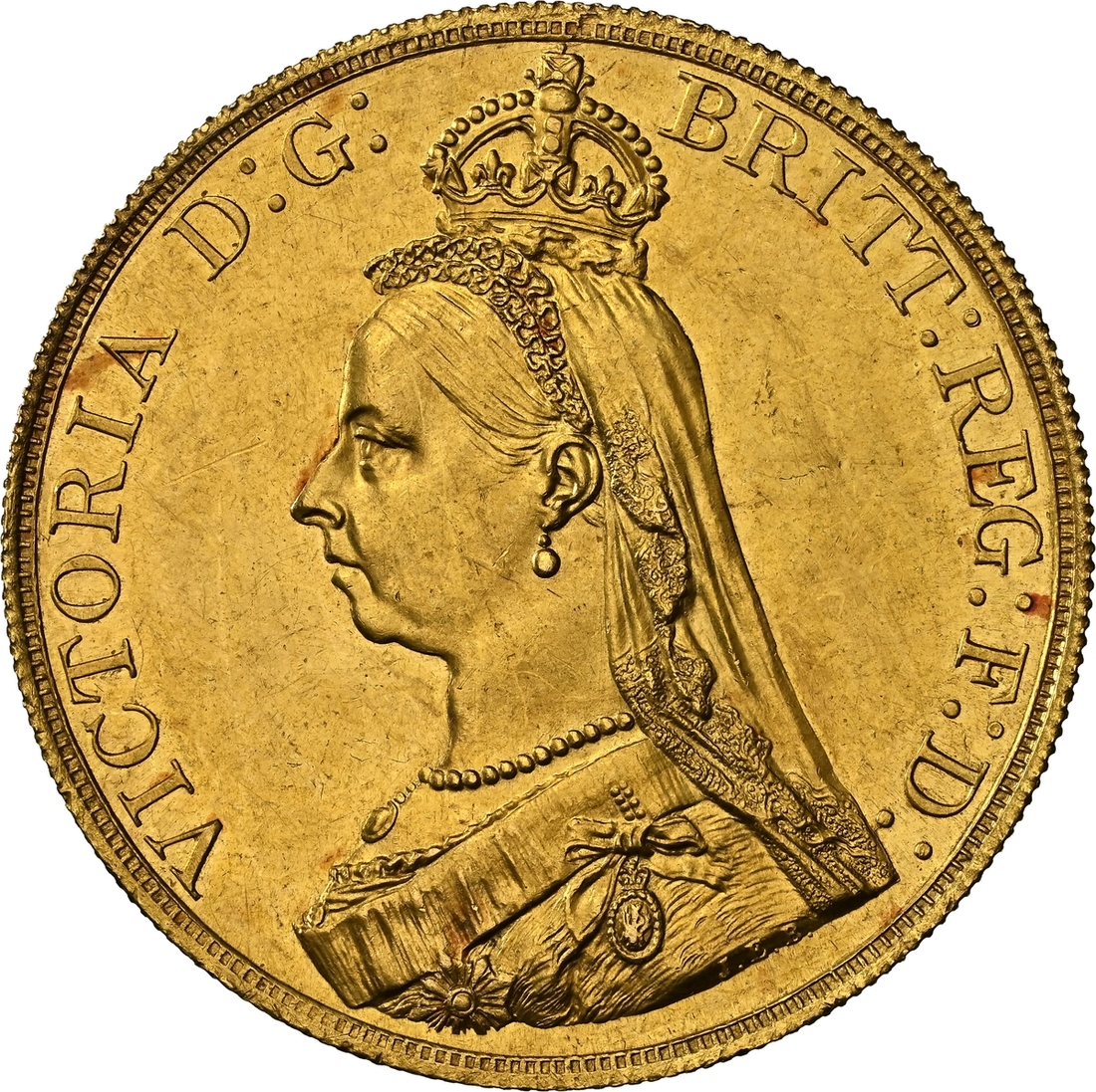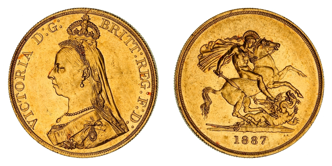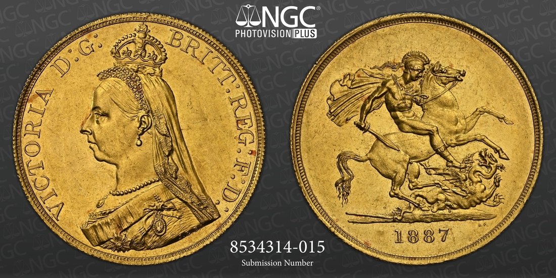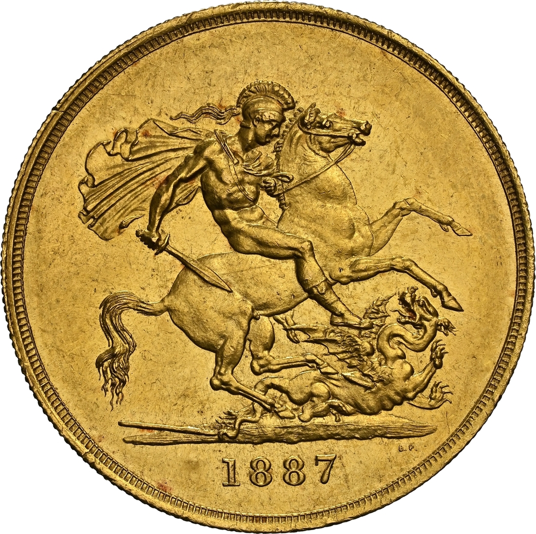 (g) NGC AU58 | Victoria (1837-1901), 'Golden Jubilee' Five-Pounds, 1887, crowned 'Jubilee' bust left, rev. St George and Dragon, edge milled, 39.884g, 12h (MCE -; EGC II, 1307; Schneider II, 653; Hill F30; GH 112; Stratos 203; S.3864), small scratch before nose, with spots of tone, otherwise lustrous, an attractively bold extremely fine, in NGC Black 'Pallas' holder, conservatively graded AU58 (Cert. #8534314-015)