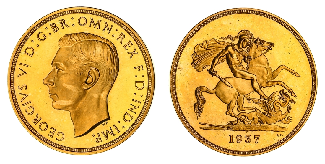 (g) NGC PF63 UCAM | George VI (1936-1952), Coronation 'Specimen' Proof Five-Pounds, 1937, bare head left, rev. St. George and Dragon, edge plain, 39.98g*, 12h (L&S 1; W&R 435; Schneider II, 670; Hill F40; EGC 1454; S.4074), some patchiness to otherwise sharper cameo portrait, a choicer example of this Modern scarcity, much as struck, in NGC Black 'Pallas' holder, graded PROOF 63 ULTRA CAMEO (Cert. #8534329-007)