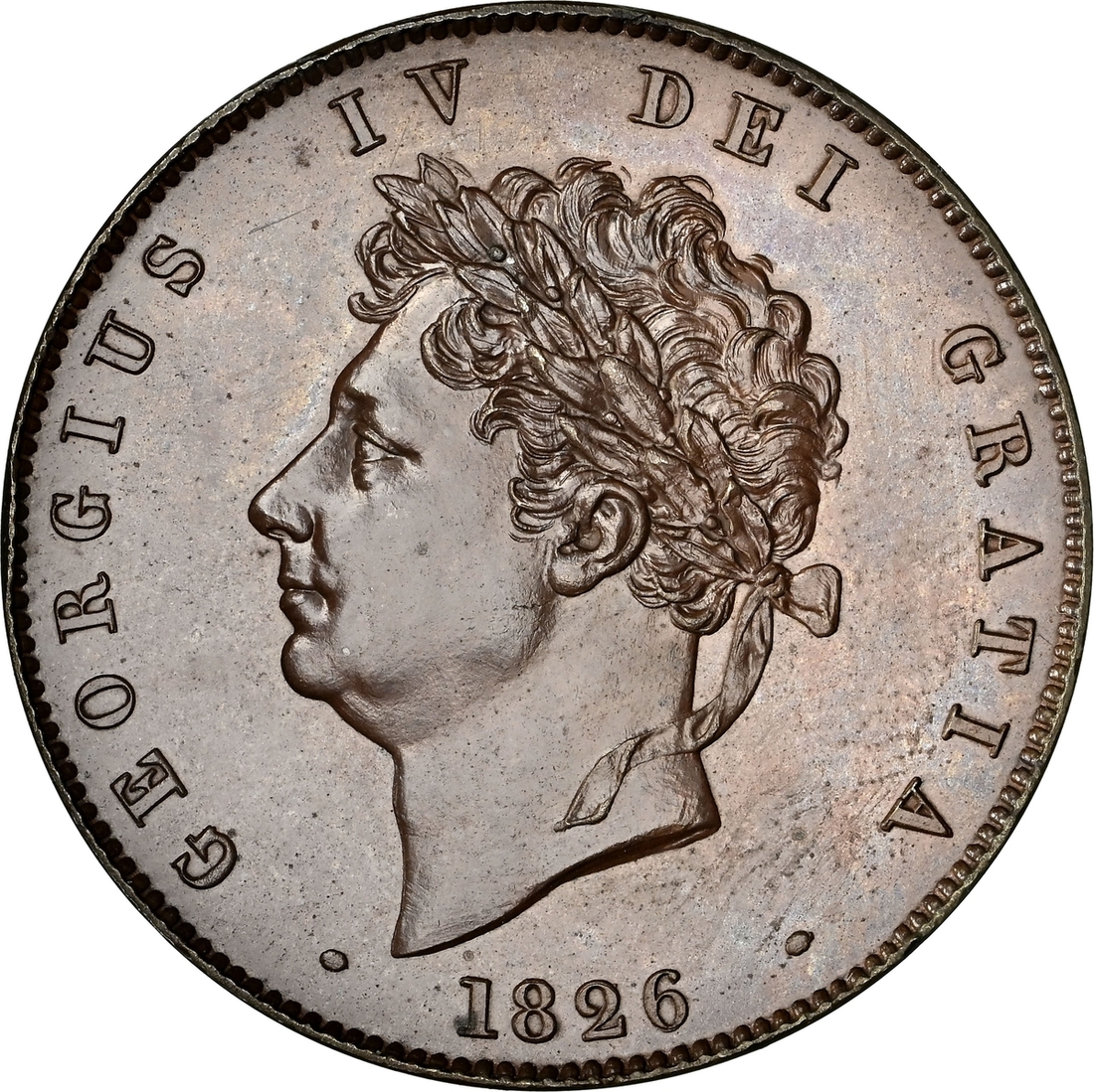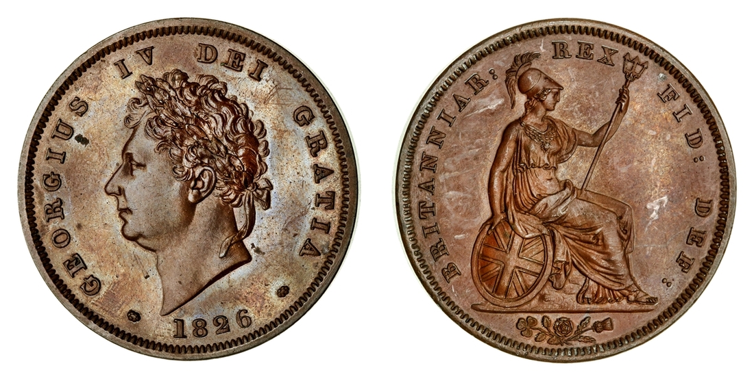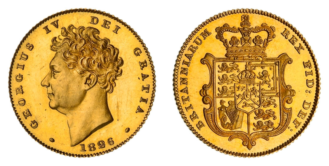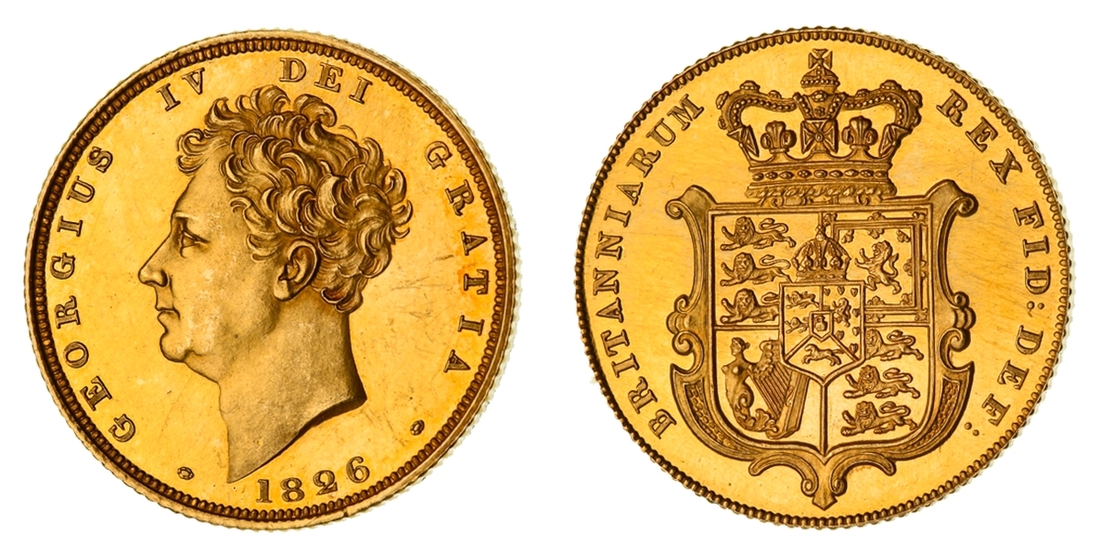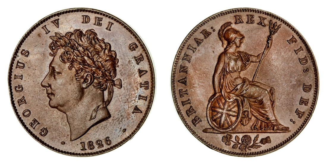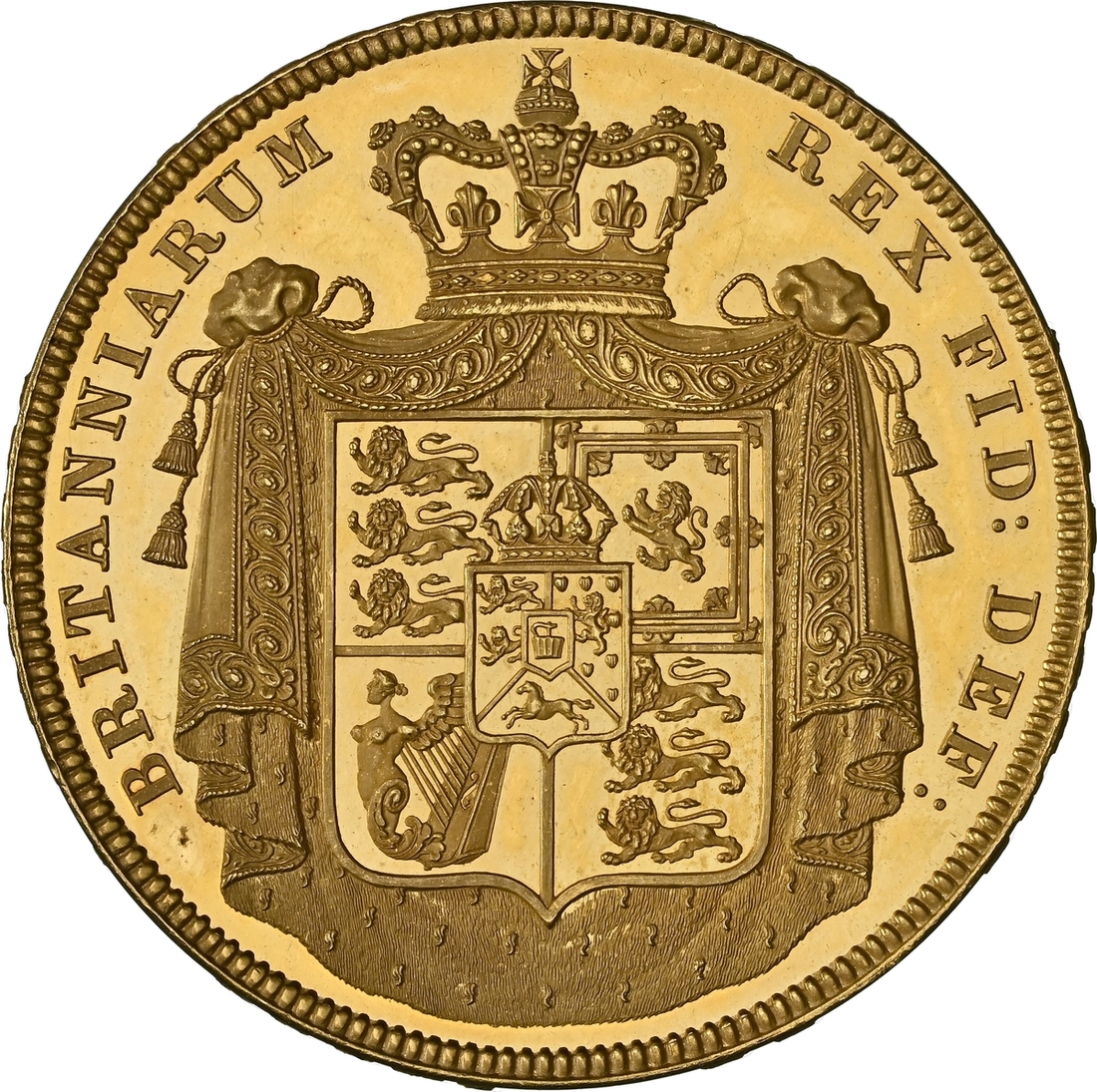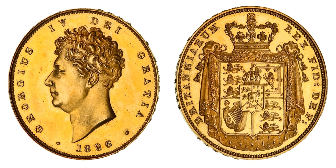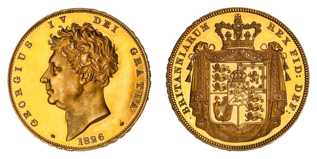 The Morning Post (27 October 1826), reports: 'A new coinage of gold, silver and copper has just been completed at the Mint. Four or Five of the principal bankers had each one set as a specimen, and no more. A set consists of one 5l. piece, one 2l. piece, a 1l. piece, and a 10s. piece (gold); a 5s. piece, a half-crown piece, a 1s and a 6d. (silver); a penny, a half-penny, and a farthing in copper. The 5l. piece bears on one side the arms of Great Britain engraved on drapery, with the motto DECUS ET TUTAMEN, and the date of the year: on the other side, the head of His Majesty, similar to the one on the new Sovereign. This piece is supposed to be taken from the forty Liri piece of Parma. The 2l. piece is the same as the above; the 1l. piece is also the same, but not engraved on drapery. The 5s. piece, the half-crown piece, the 1s. and 6d. bear the arms of Great Britain, the same as these already issued. The penny, half-penny and farthing, dated 1826.
