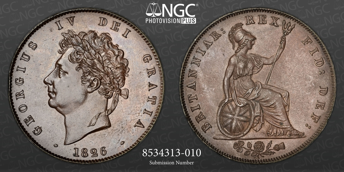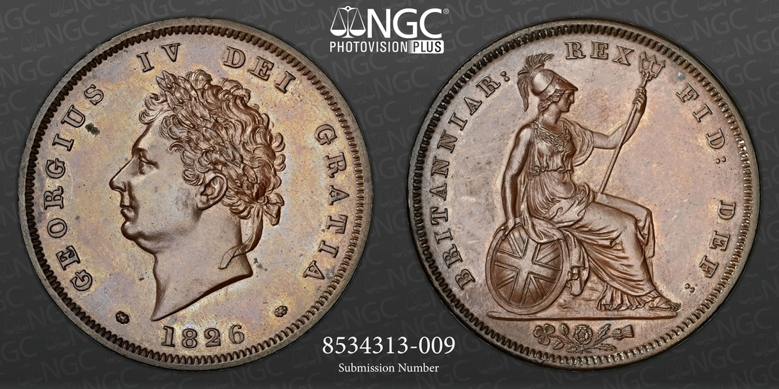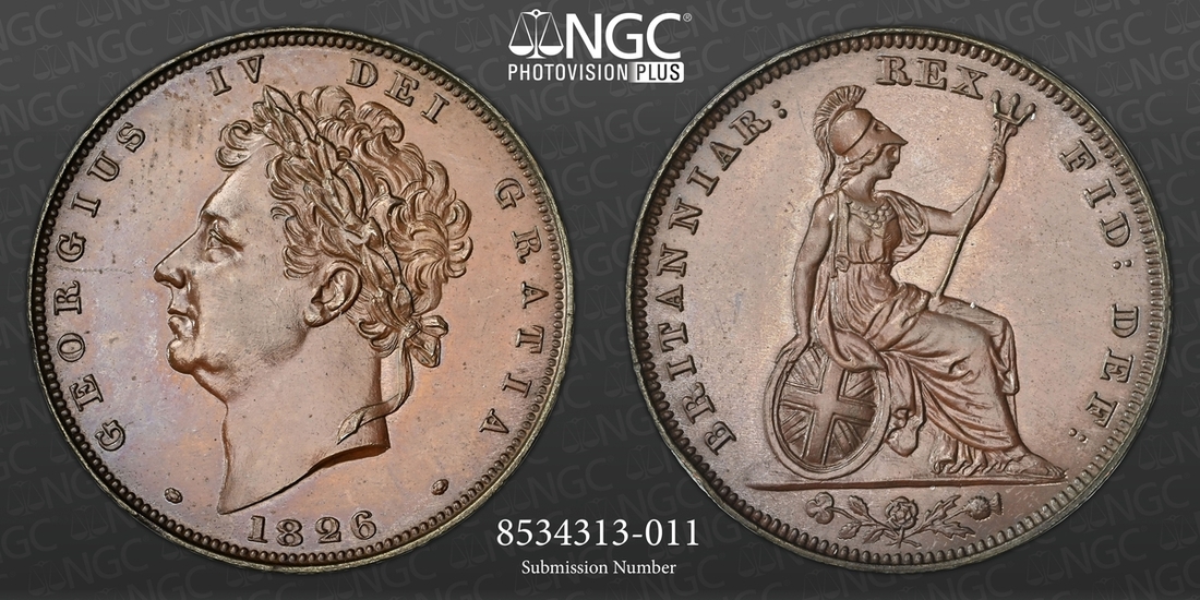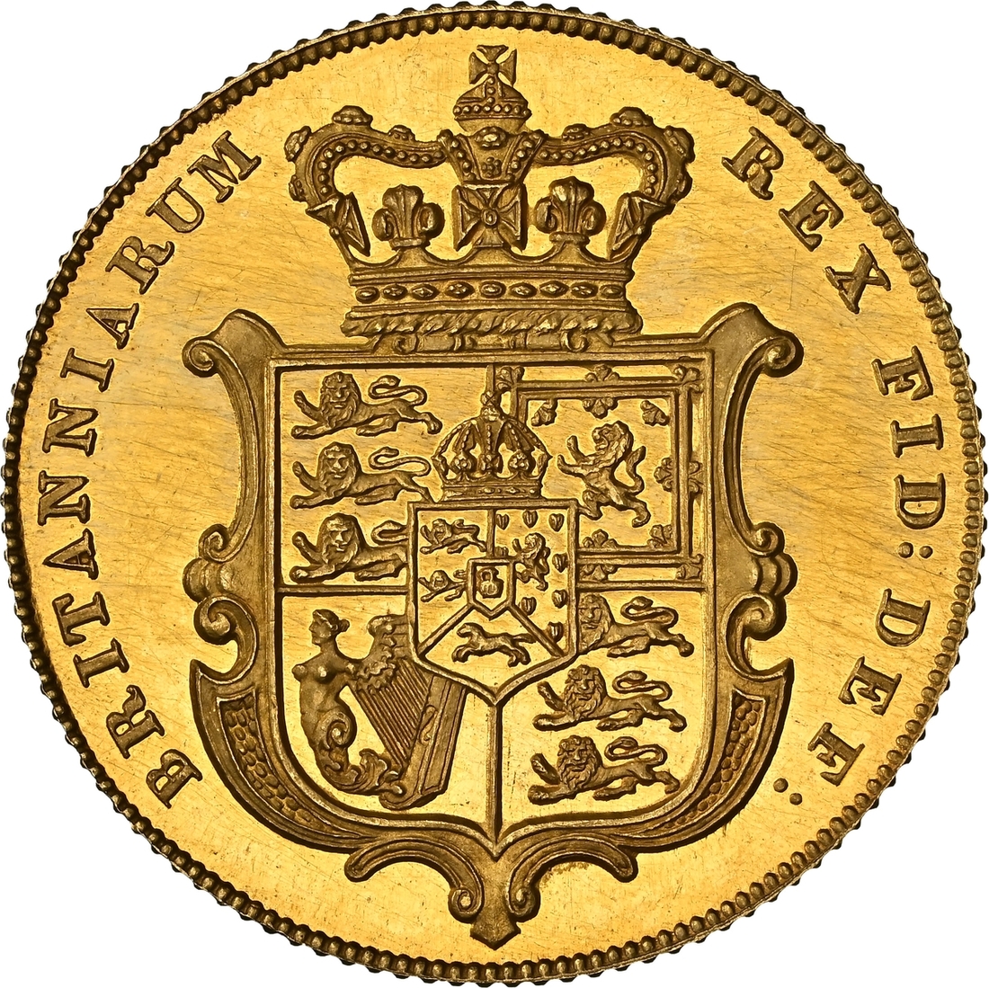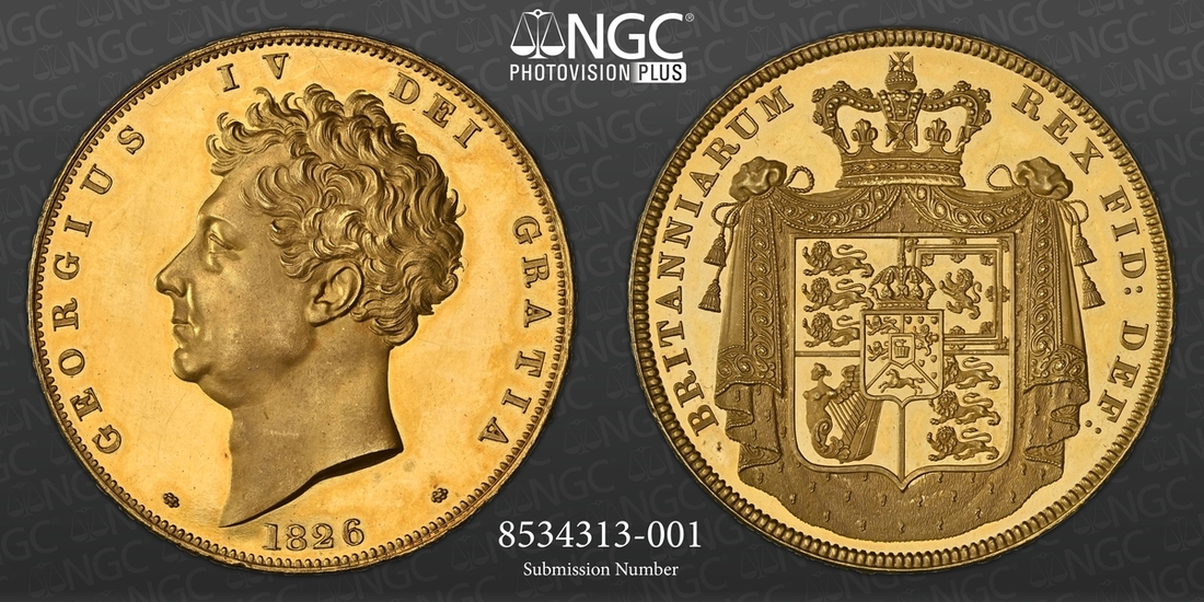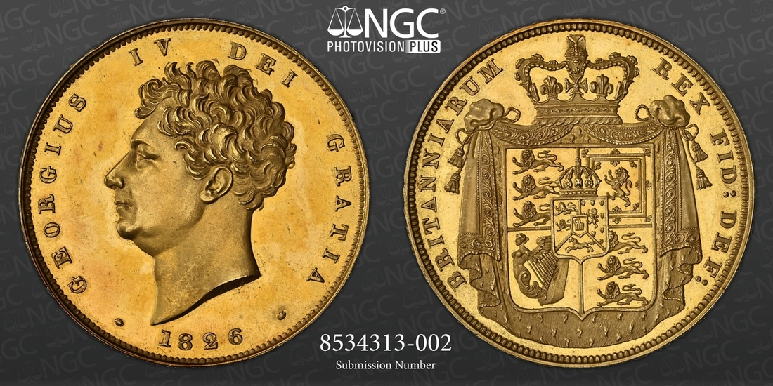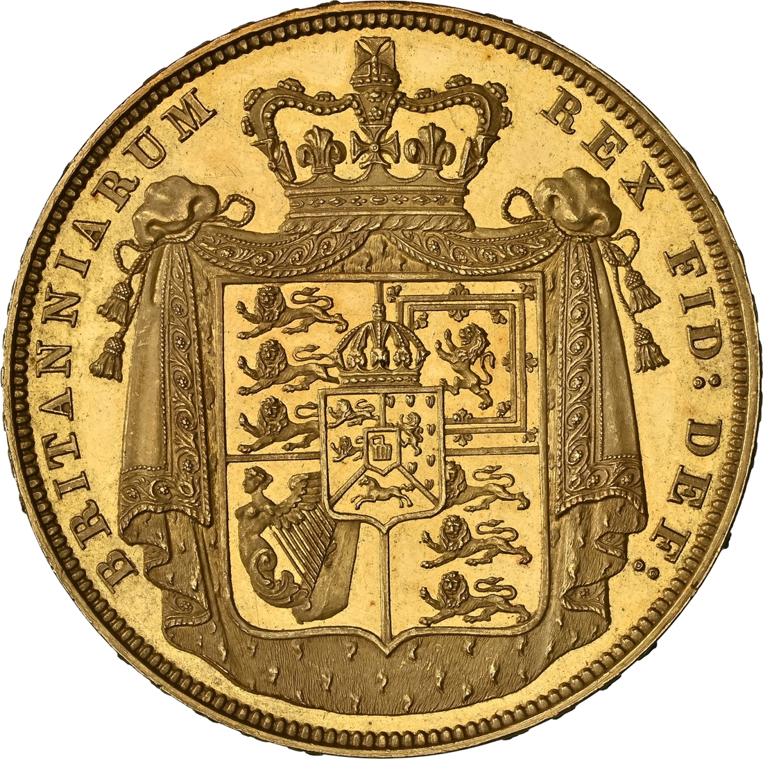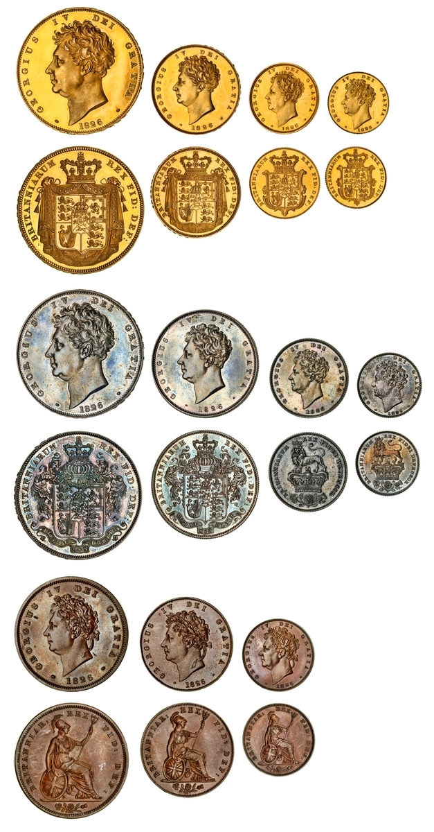 The Morning Post (27 October 1826), reports: 'A new coinage of gold, silver and copper has just been completed at the Mint. Four or Five of the principal bankers had each one set as a specimen, and no more. A set consists of one 5l. piece, one 2l. piece, a 1l. piece, and a 10s. piece (gold); a 5s. piece, a half-crown piece, a 1s and a 6d. (silver); a penny, a half-penny, and a farthing in copper. The 5l. piece bears on one side the arms of Great Britain engraved on drapery, with the motto DECUS ET TUTAMEN, and the date of the year: on the other side, the head of His Majesty, similar to the one on the new Sovereign. This piece is supposed to be taken from the forty Liri piece of Parma. The 2l. piece is the same as the above; the 1l. piece is also the same, but not engraved on drapery. The 5s. piece, the half-crown piece, the 1s. and 6d. bear the arms of Great Britain, the same as these already issued. The penny, half-penny and farthing, dated 1826.