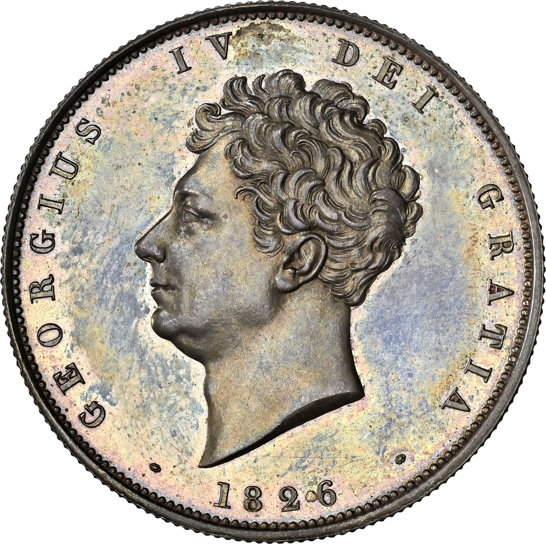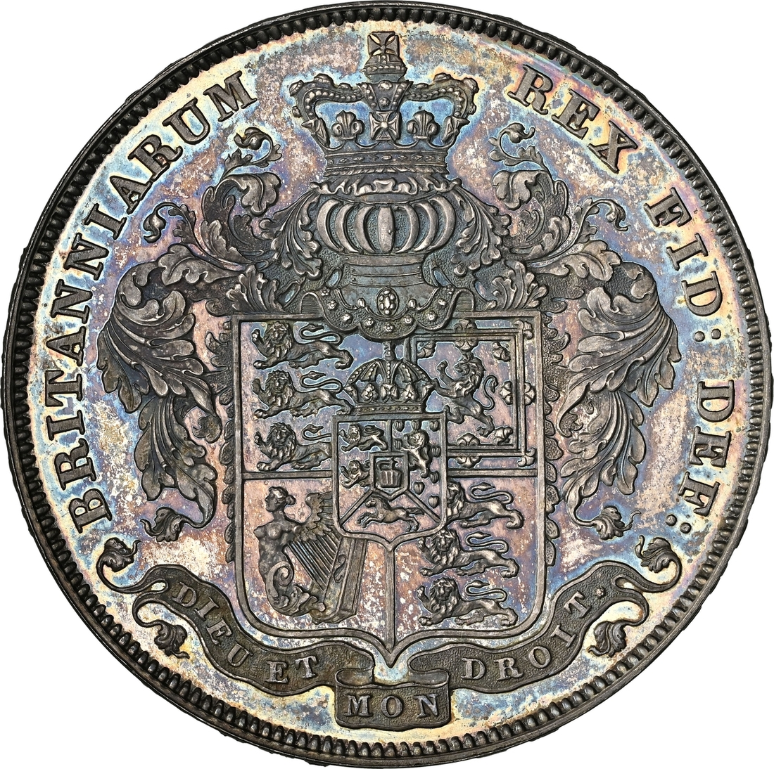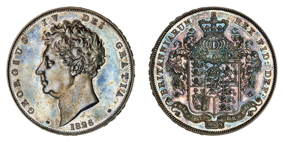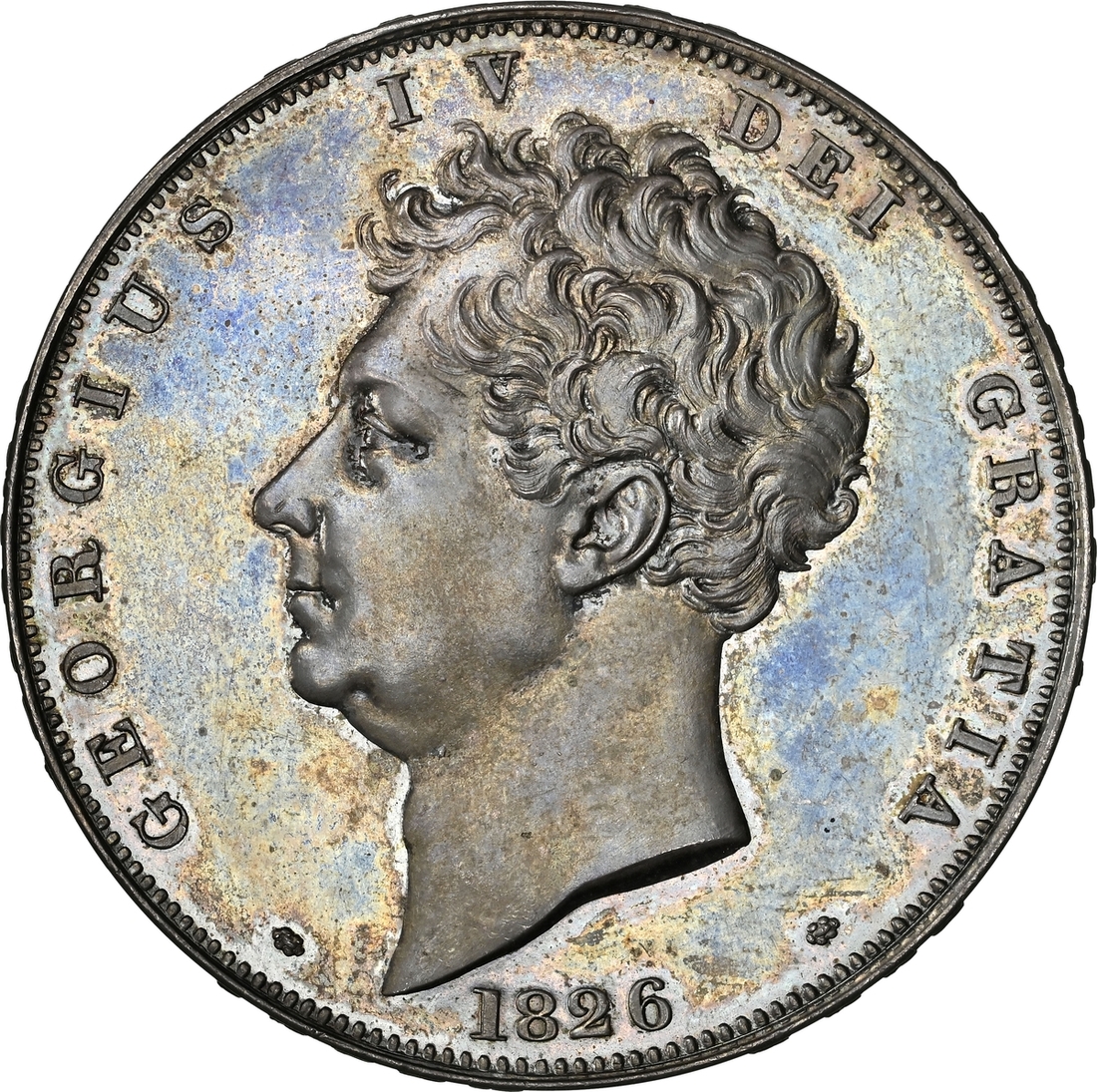 vi) PF64 | Proof Halfcrown, 1826, edge milled, 14.078g, 6h (Bull 2376; ESC 647; Davies 192; MCE [1950], p. 106, 'Reverse 3' this coin), the reverse and milling concreted with red wax where previous plated, otherwise outstandingly cabinet toned with petrol-blue hues, much as struck, in NGC 'Black' Pallas holder, graded PROOF 64 (Cert. #8534313-006)