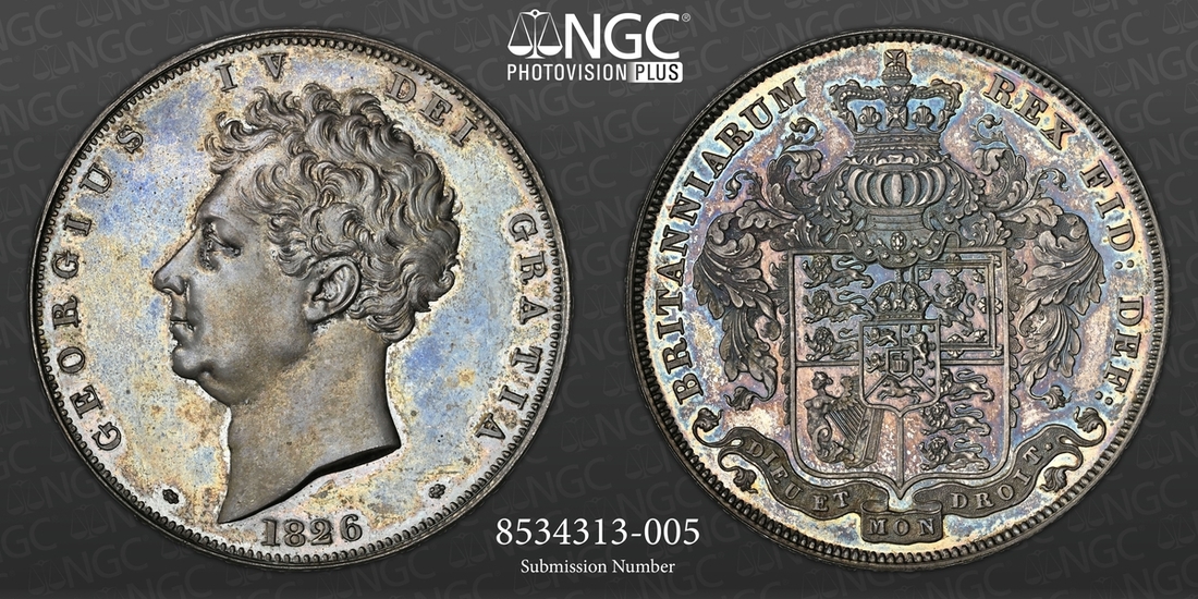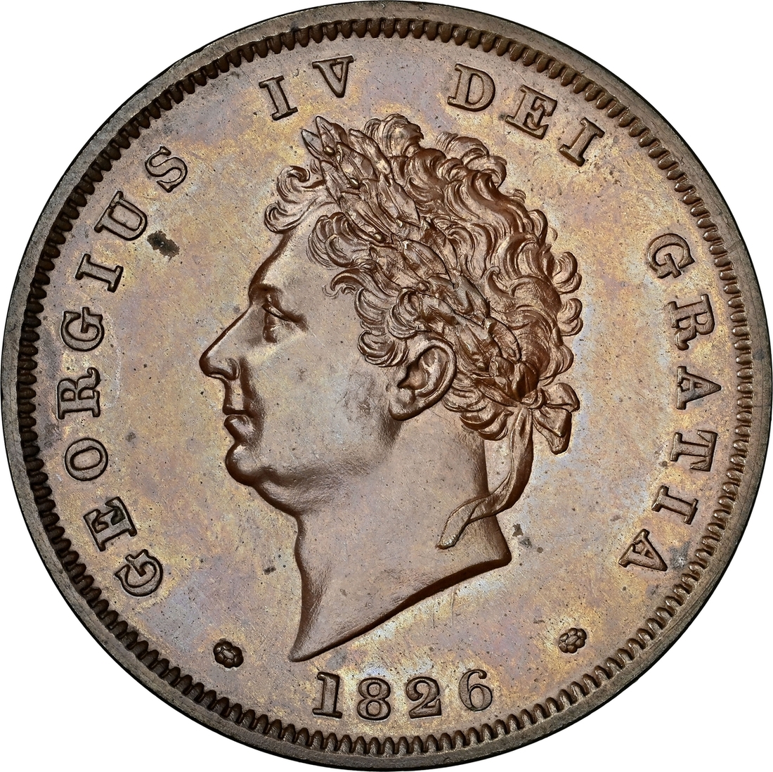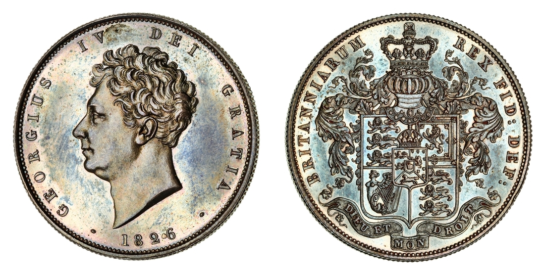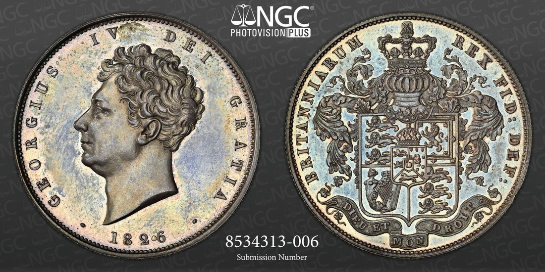 vi) PF64 | Proof Halfcrown, 1826, edge milled, 14.078g, 6h (Bull 2376; ESC 647; Davies 192; MCE [1950], p. 106, 'Reverse 3' this coin), the reverse and milling concreted with red wax where previous plated, otherwise outstandingly cabinet toned with petrol-blue hues, much as struck, in NGC 'Black' Pallas holder, graded PROOF 64 (Cert. #8534313-006)