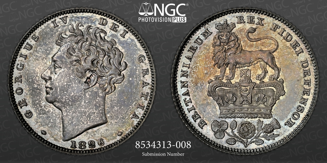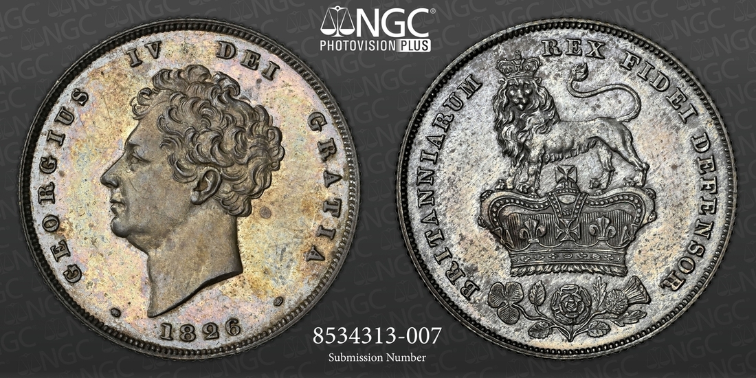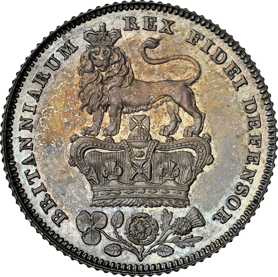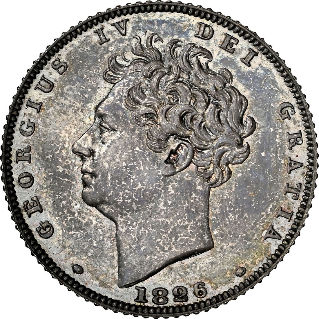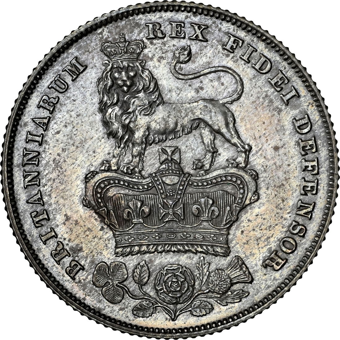 vii) PF62 | Proof Shilling, 1826, edge milled, 5.674g, 7h (Bull 2411; ESC 1258), some surface marks in brilliant but very darkly toned fields, a bold extremely fine, in NGC 'Black' Pallas holder, graded PROOF 62 (Cert. #8534313-007)