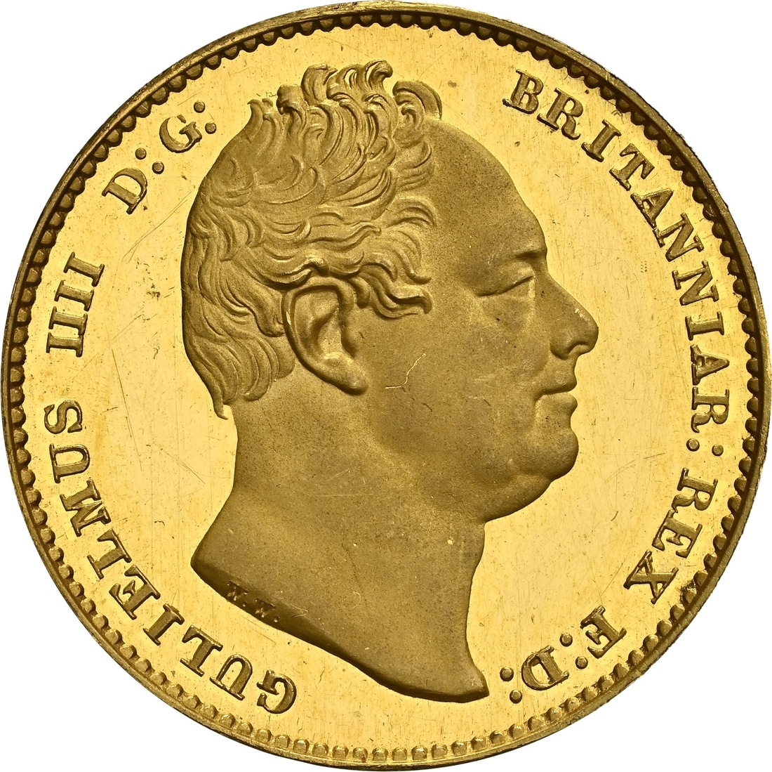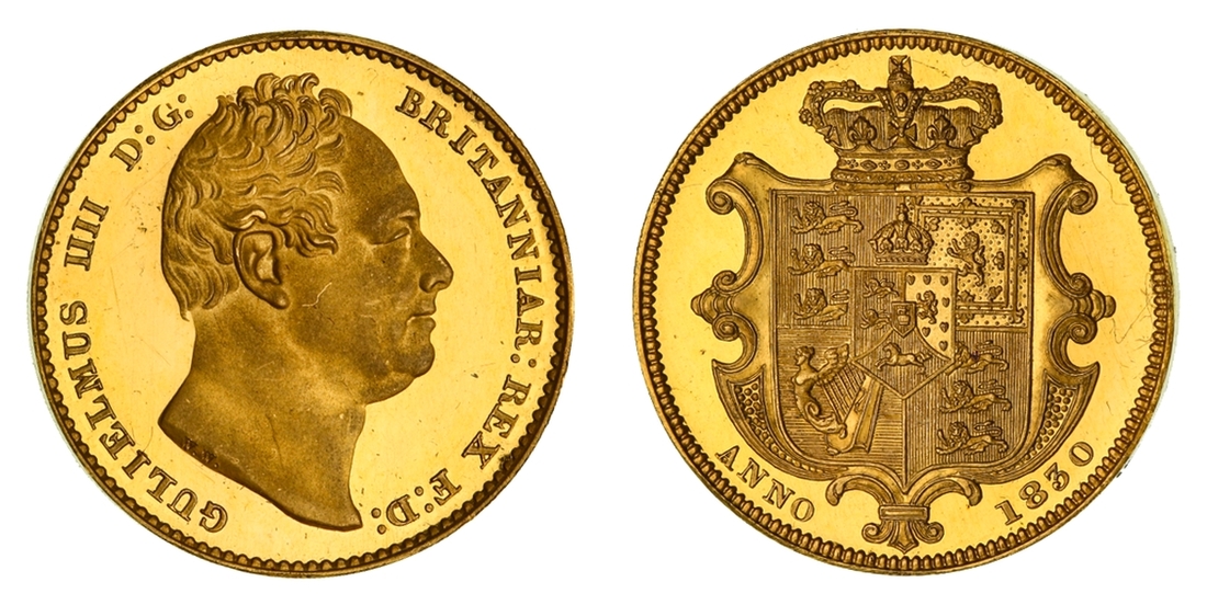 (g) NGC PF64+ UCAM | William IV (1830-1837), Pattern Proof Sovereign, 1830, by William Wyon and Jean-Baptiste Merlen, second bare head right, nose to second I in BRITANNIAR, rev. coin alignment, crowned shield in mantle, ANNO - 1830 below, edge plain, 7.833g, 6h (Montagu 1083; Murdoch 440; Nobleman 203; Douglas-Morris 178; King -; Stratos -; Marsh 15C; W&R 260 [R5]; S.3829B), struck through scarcely perceptible lint artefacts in otherwise magnificently brilliant original fields, practically FDC, an extraordinary survivor; a covetable gem; and a supreme rarity, once erroneously included by Messrs Seaby in the remarkable 1831 Proof "Set" offered in surrounding lots, in NGC Black 'Pallas' holder, graded PROOF 64+ ULTRA CAMEO (Cert. #8534312-002)