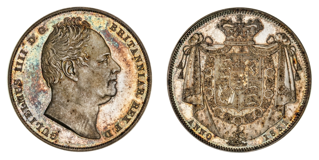 (x) NGC PF65 CAM | William IV (1830-1837), Pattern Crown, 1831, by William Wyon and Jean-Baptiste Merlen, GULIELMUS IIII D: G: BRITANNIAR: REX F: D: bare head right, W.W. in relief on truncation rev. coin alignment, quartered Shield of Arms with a crowned escutcheon of the Arms of Hanover, all within Order of the Garter upon crowned mantle, seven strings to harp, ANNO - 1831 below, edge plain, 27.375g, 5h (Stratos -; L&S 1; Bull 2462 [R2]; ESC 271; Davies 300; C&R 1293; S.3833), characteristically but stupendously die capped to reverse 12 o'clock, with playful cabinet iridescence overlying brilliant original fields, choice FDC, in NGC Black 'Pallas' holder, graded PROOF 65 CAMEO (Cert. #8534312-004)