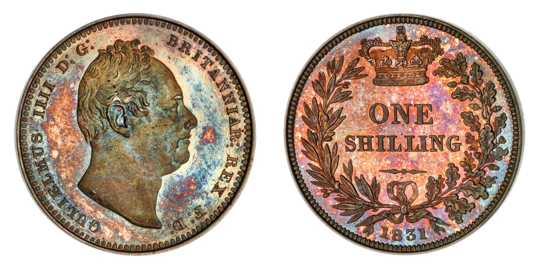 (x) NGC PF66 CAM | William IV (1830-1837), Proof Shilling, 1831, bare head right, block W. W. on truncation, rev. value in wreath, edge plain, 5.650g, 7h (Stratos 228; ESC 1266; Bull 2488; S.3835), an evidently early or more probably original '1831 Striking' with inverted die axes as customary for currency issues of the period, with electrifying petroleum blue tone overlying brilliant and frosted surfaces, spectacularly choice, FDC, in NGC Black 'Pallas' holder, conservatively graded PROOF 66 CAMEO (Cert. #8534312-006)