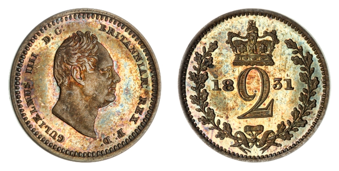 (x) NGC PF65 | William IV (1830-1837), Proof Twopence, 1831, bare head right, rev. crowned mark of value, edge plain, 0.943g, 6h (Robinson 352; S.3843), beautifully cabinet toned with perfect frosted portrait cameo contrast to brilliant original fields, much as issued, in NGC Black 'Pallas' holder, graded PROOF 65 (Cert. #8534312-010)