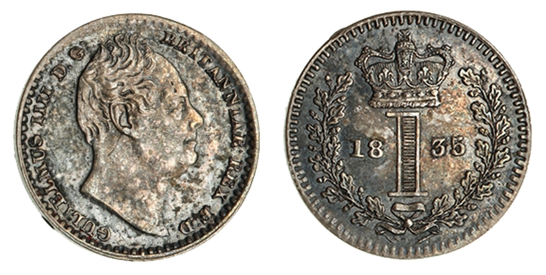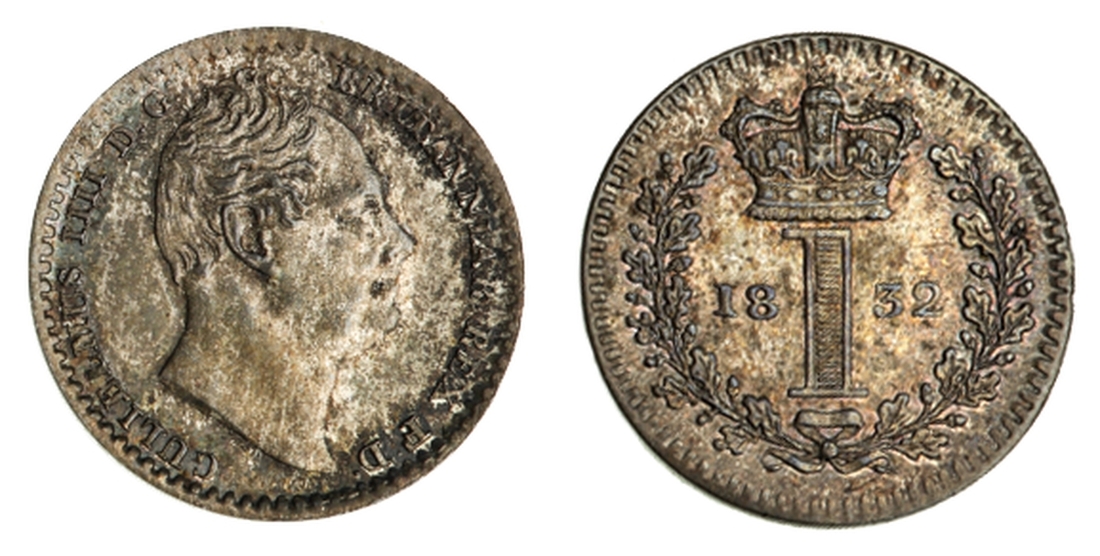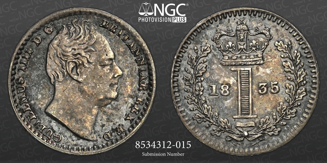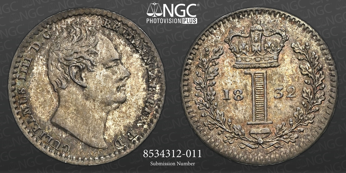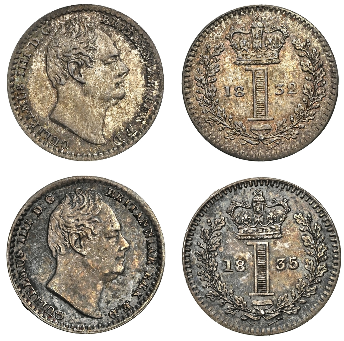 (x) NGC MS64 | William IV (1830-1837), Maundy Penny, 1832, bare head right, rev. crowned mark of value, edge plain, 0.472g, 6h (Robinson 359; S.3844), lustrous and pleasantly cabinet toned, choice, as struck, an evident 'stand-in' for the 1831 Proof Set, in NGC Black 'Pallas' holder, graded MS64 (Cert. #8534312-011); another, NGC MS62 | Maundy Penny, 1835, similar, 0.471g, 6h (Robinson 359; S.3844), some speckling to otherwise lustrous surfaces, with a rich dark blue cabinet tone, extremely fine or better, and an evident 'stand-in' for the 1839 Proof Set, in NGC Black 'Pallas' holder, graded MS62 (Cert. #8534312-015) (2)
