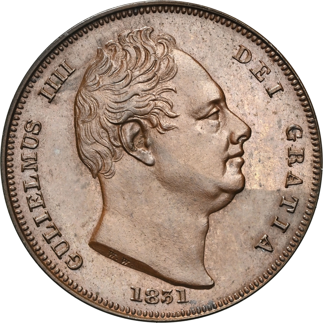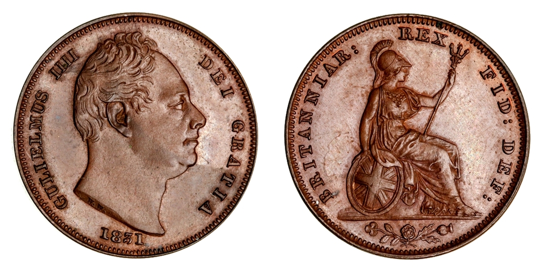 (x) NGC PF64 BN | William IV (1830-1837), Bronzed Proof Farthing, 1831, bare head right, W. W. on truncation, rev. Britannia seated right, edge plain, 4.736g, 5h (Stratos 233; Cooke 243; BMC [Peck] 1468; S.3848), some irregular tone, otherwise attractive chocolate patina overlying bronzed original surfaces, choice, as struck, in NGC Black 'Pallas' holder, graded PROOF 64 BROWN (Cert. #8534312-014)