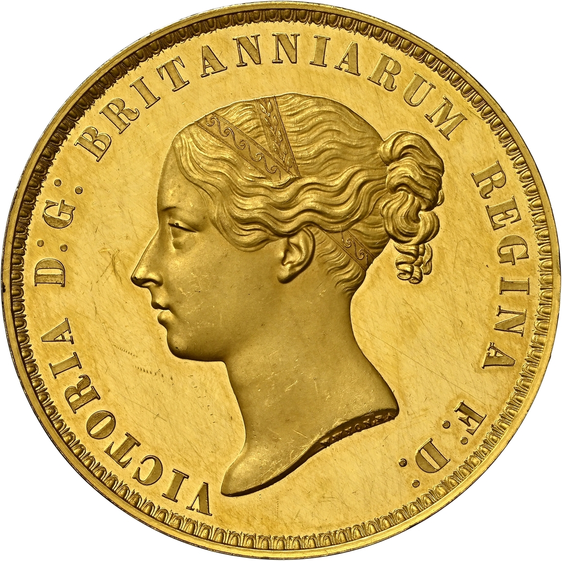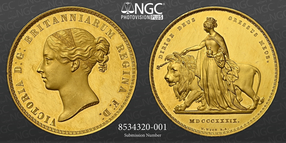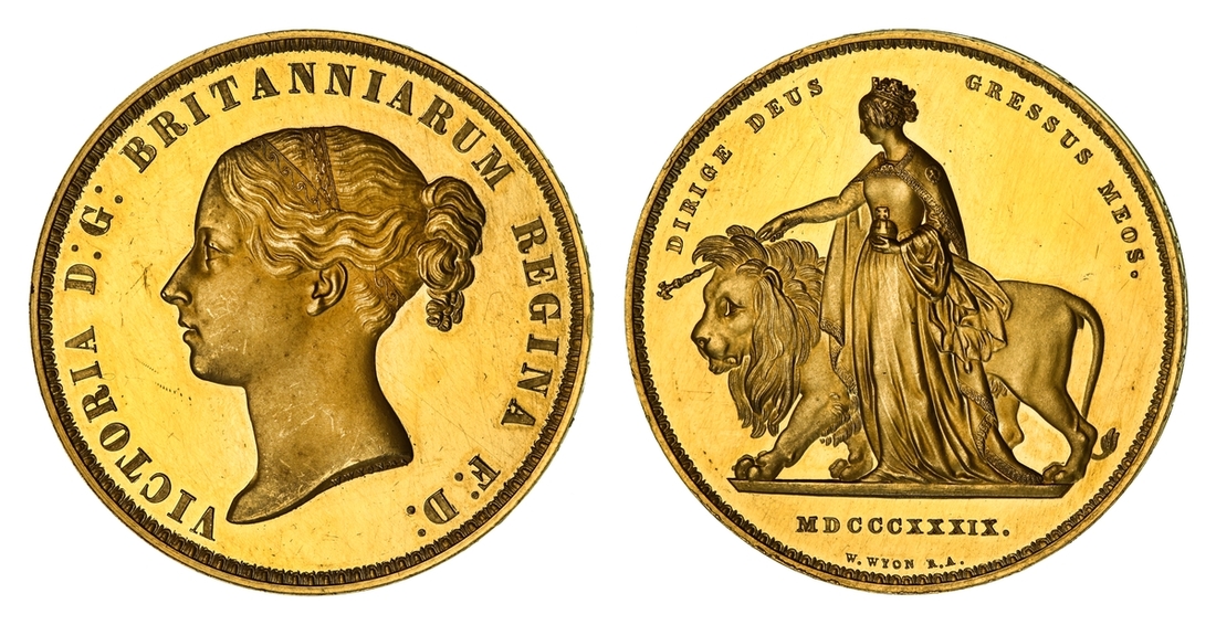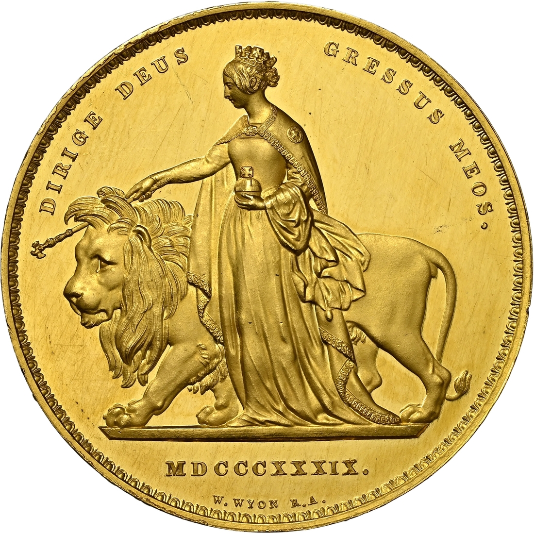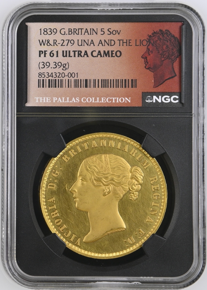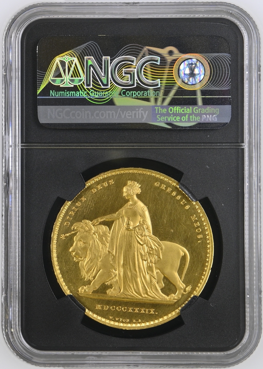 (g) NGC PF61 UCAM | Victoria (1837-1901), Pattern Five-Pounds, 1839 TERTIO, "Una and the Lion", by William Wyon R.A., VICTORIA D: G: BRITANNIARUM REGINA F: D: young diademed head left scroll-garnished fillet (5 / 2), one nine-leaved floral-garnished fillet, W. WYON R.A. on truncation, rev. en médaille, DIRIGE DEUS GRESSUS MEOS. Queen Victoria leading the British Lion, wearing Mantle and Badge of the Most Noble Order of the Garter; an allegory of Edmund Spenser's 'Faerie Quene', DECUS ET TUTAMEN * ANNO REGNI TERTIO * in raised lettering upwards between 'wire-rims' on edge, 39.295g [606.415grns], 12h (Whetmore 109 same dies; Douglas-Morris 230 same dies; L&S 18; W&R 279; EGC II, 1052 [R2]; Hill F26; GH - [cf. 110]; S.3851), small bagmarks in lightly hairlined but otherwise playfully brilliant fields further accentuating delightful cameoing to key devices, an attractively bold extremely fine, a celebrated and 'pinnacle' rarity within the long and illustrious history of British numismatics, in NGC Black 'Pallas' holder, graded PROOF 61 ULTRA CAMEO (Cert. #8534320-001)
