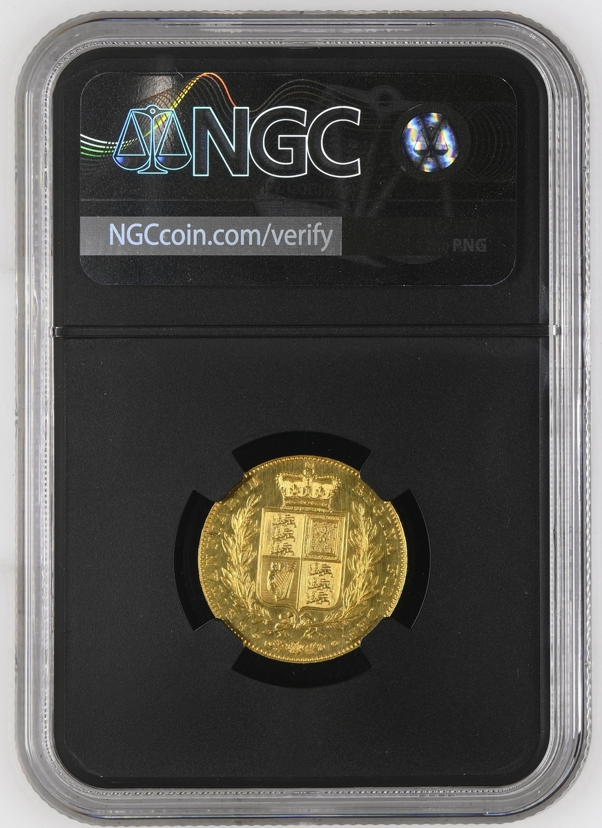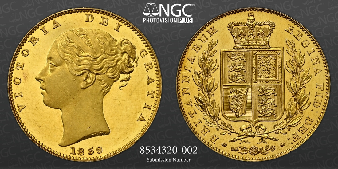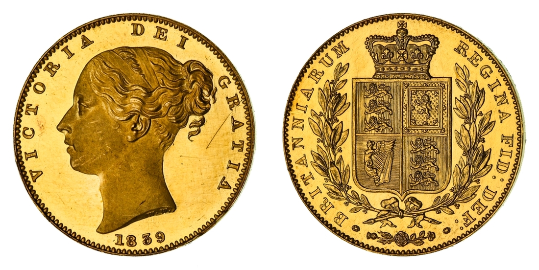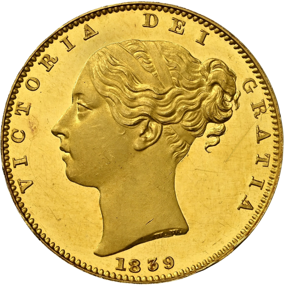 (g) NGC PF61 CAM | Victoria (1837-1901), Proof Sovereign, 1839, young diademed head left, raised W.W. on truncation, rev. struck en médaille, crowned 'normal' shield in wreath, edge plain, 7.903g, 1h (W&R 302; Hill 23A; S.3852), an unfortunate pin scratch behind bun in otherwise brilliant fields, a hint of cabinet friction, otherwise glorious cameo definition to portrait, a most pleasingly bold extremely fine, in NGC Black 'Pallas' holder, sympathetically graded PROOF 61 CAMEO (Cert. #8534320-002)