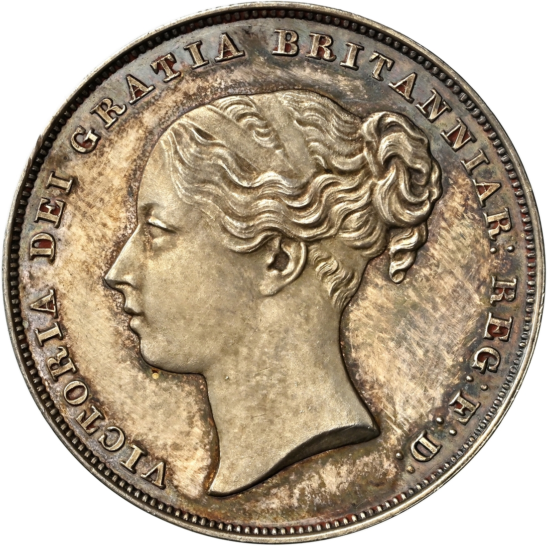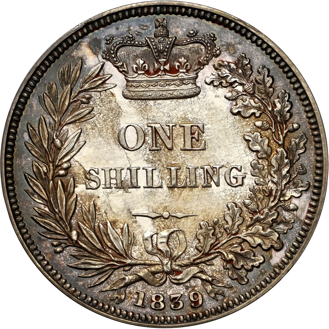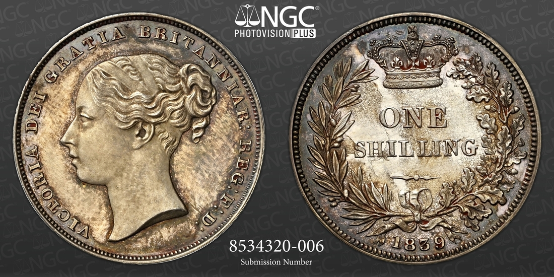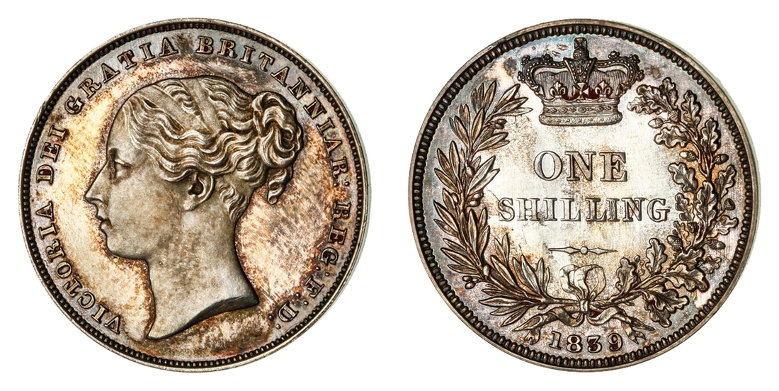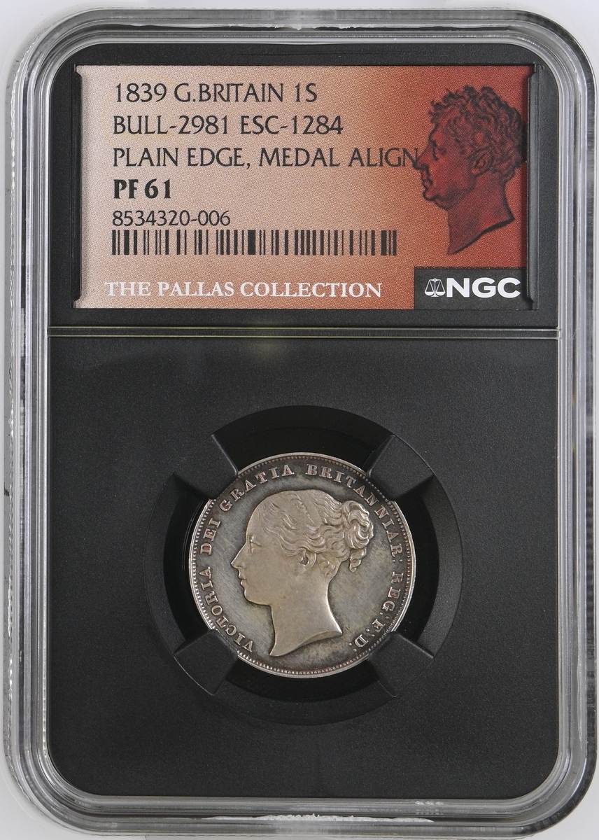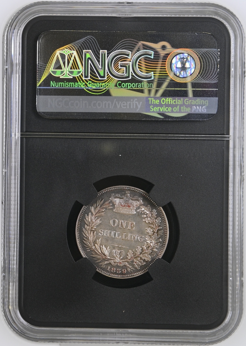 (x) NGC PF61 | Victoria (1837-1901), Proof Shilling, 1839, young diademed head left, no initials on truncation, rev. struck en médaille, value in wreath, edge plain, edge plain, 5.580g, 12h (ESC 1284; Bull 2981; S.3904), traces of red wax in recesses from past plate illustration on both sides, otherwise sharply struck and neatly cabinet toned, a really bold extremely fine and with an interesting pedigree, in NGC Black 'Pallas' holder, graded PROOF 61 (Cert. #8534320-006)