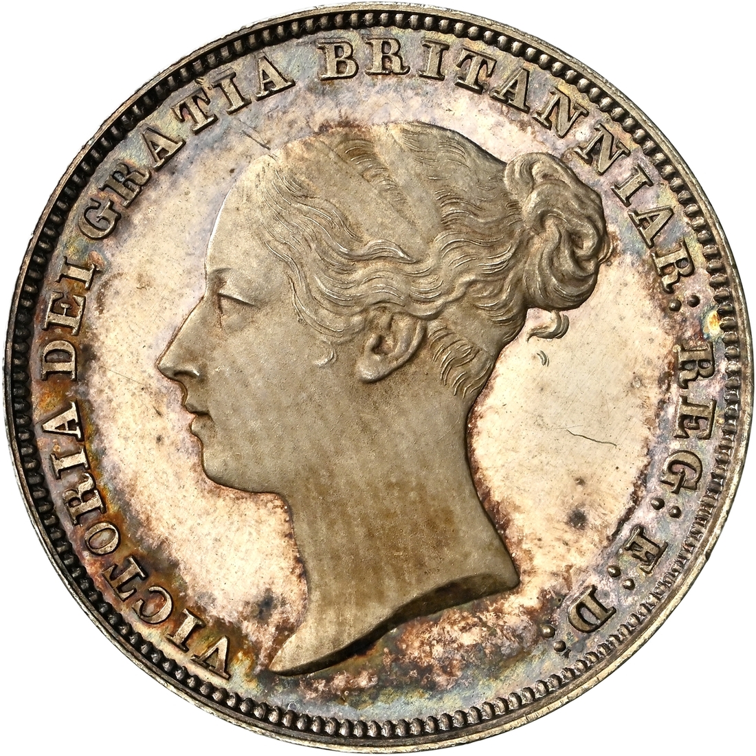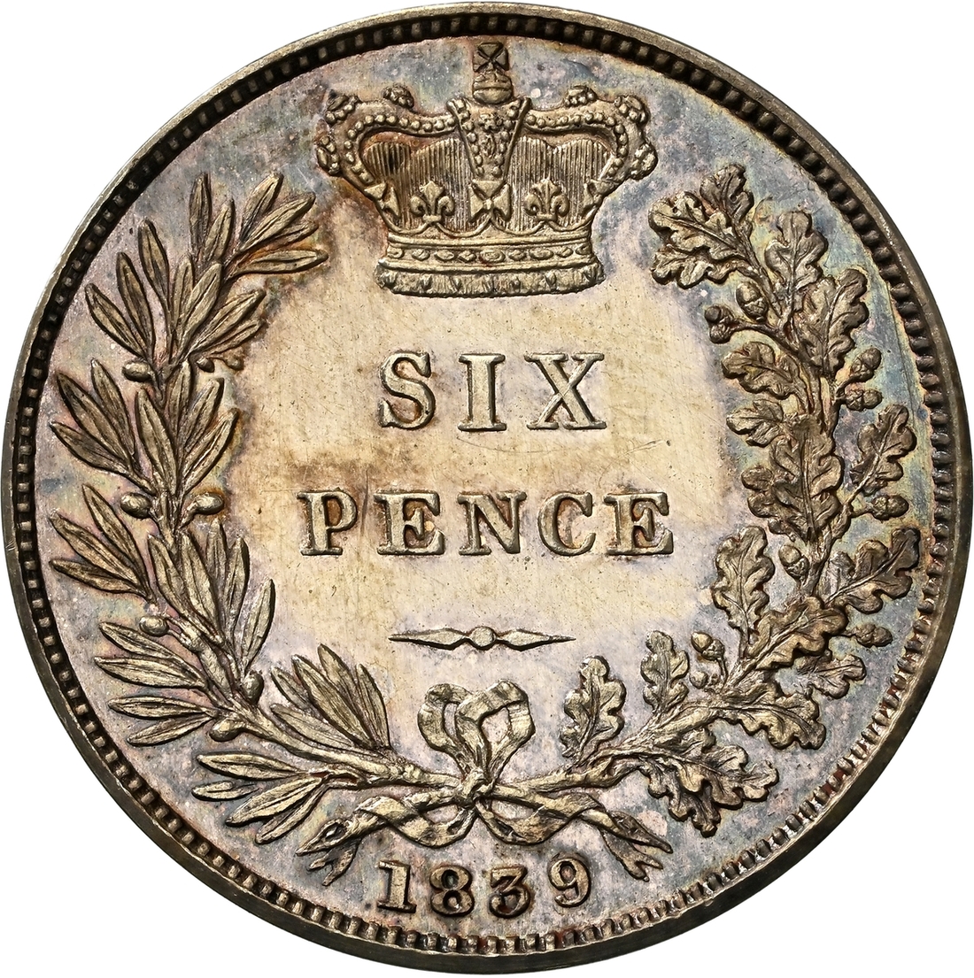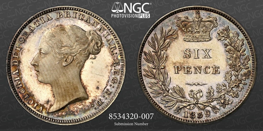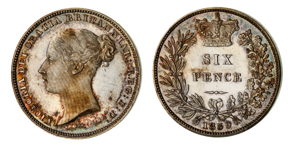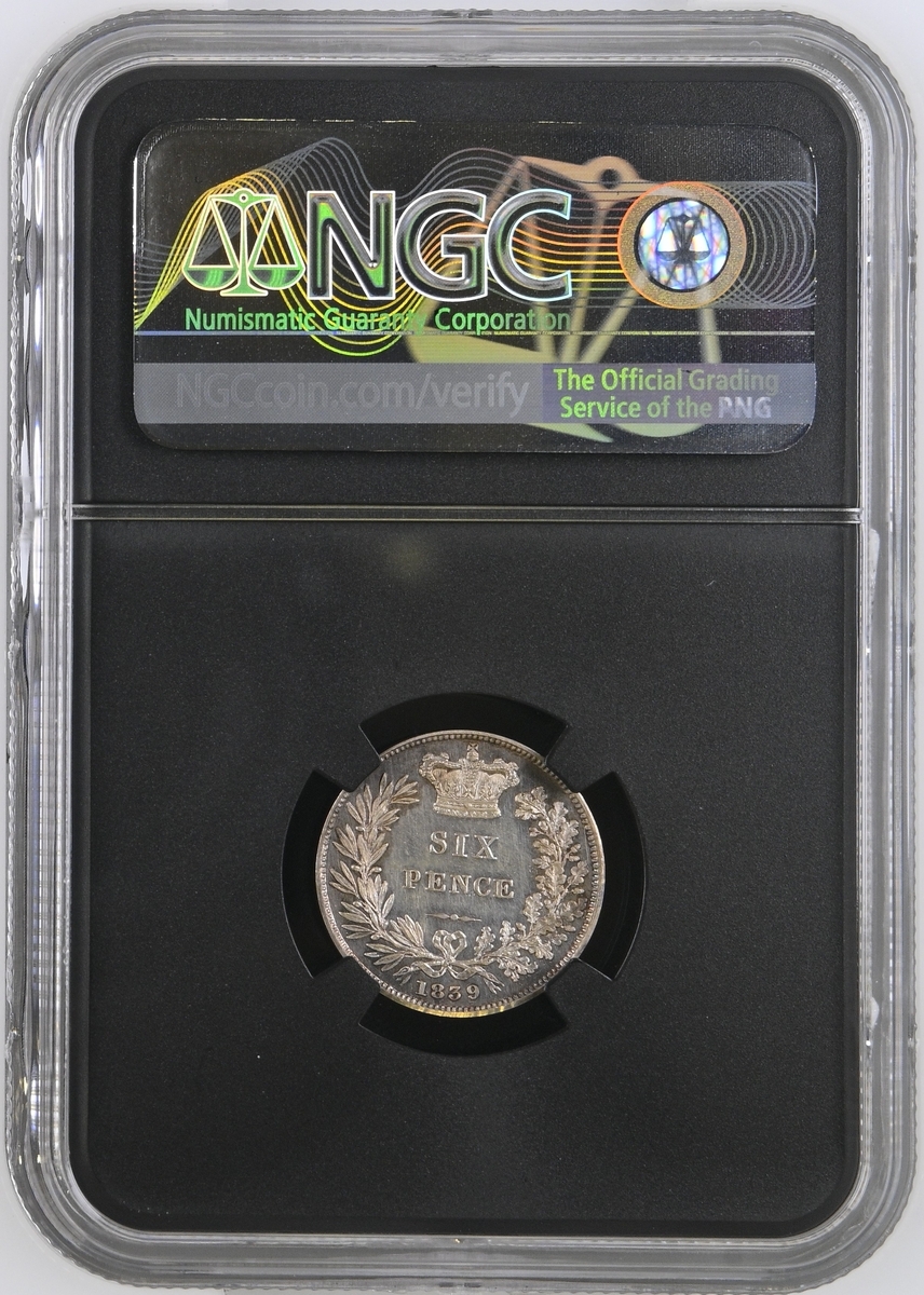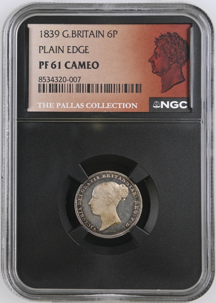 (x) NGC PF61 CAM | Victoria (1837-1901), Proof Sixpence, 1839, young diademed head left, with two plain fillets, rev. struck en médaille, value in wreath, edge plain, 2.772g, 1h (ESC 1685; Bull 3171; S.3908), light fingermarks to portrait and evidence of wiping on reverse in attempt to remove red wax of past illustration, otherwise sharply struck with intriguing peripheral tones, extremely fine, in NGC Black 'Pallas' holder, graded PROOF 61 CAMEO (Cert. #8534320-007)