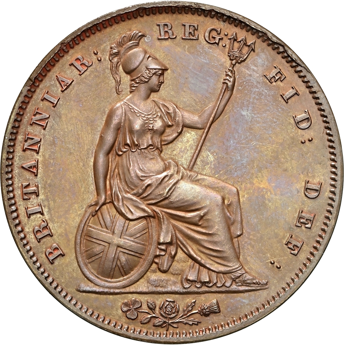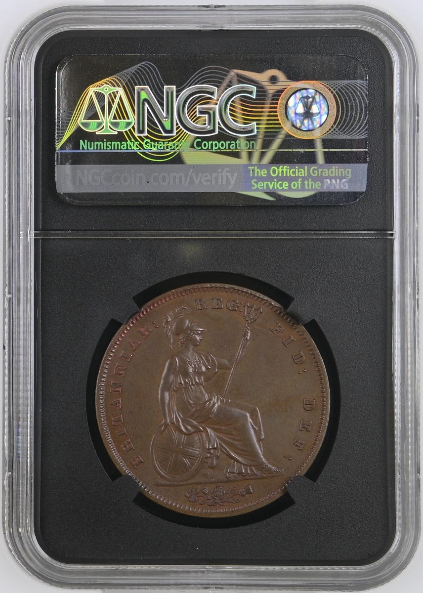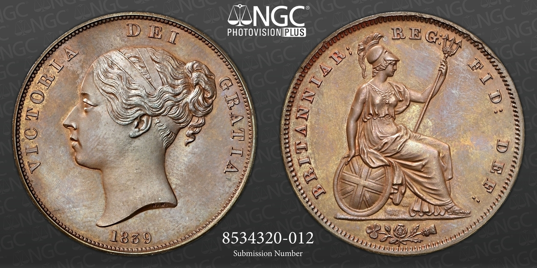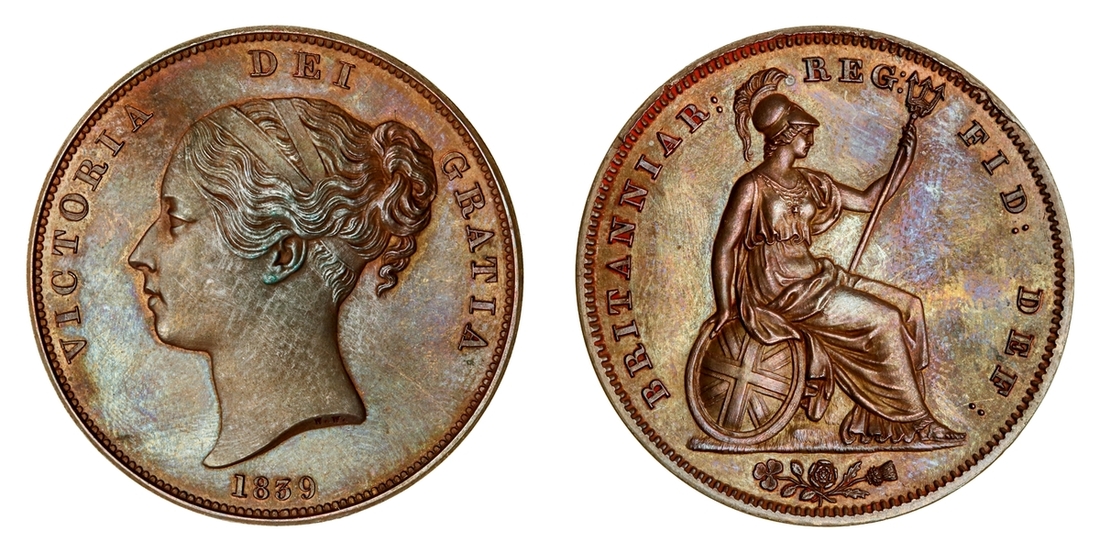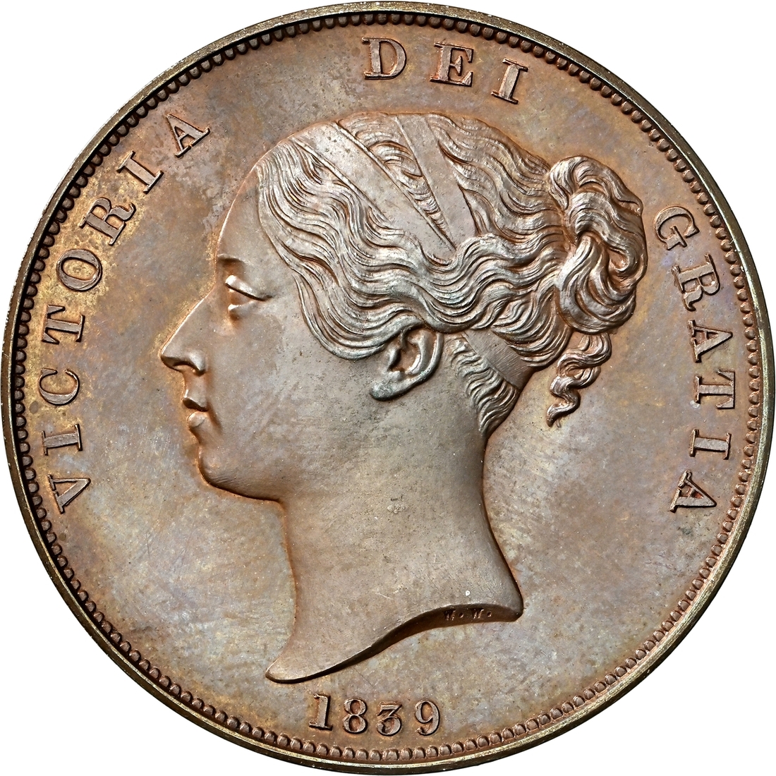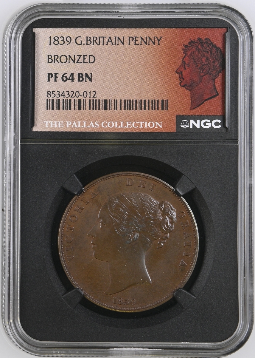(x) NGC PF64 BN | Victoria (1837-1901), Proof Penny, 1839, in bronzed copper, young diademed head left, rev. struck en médaille, Britannia seated right, holding ornamental trident, edge plain, 18.780g, 12h (BMC [Peck] 1479; S.3948), significant traces of red wax in recesses from past plate illustration, otherwise light fingermarks in otherwise attractively bronzed fields, a pleasingly bold extremely fine, in NGC Black 'Pallas' holder, generously graded PROOF 64 BROWN (Cert. #8534320-012)