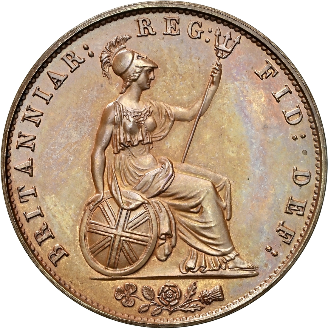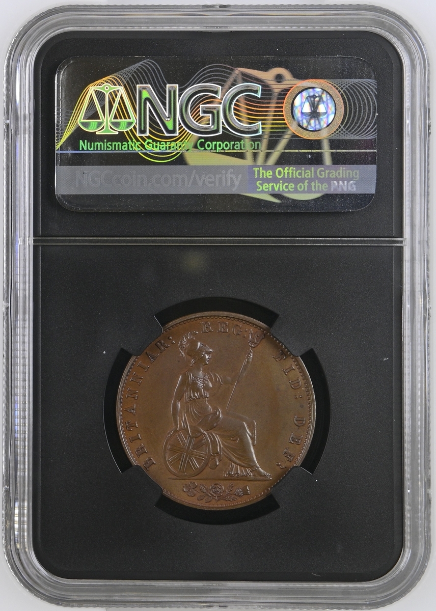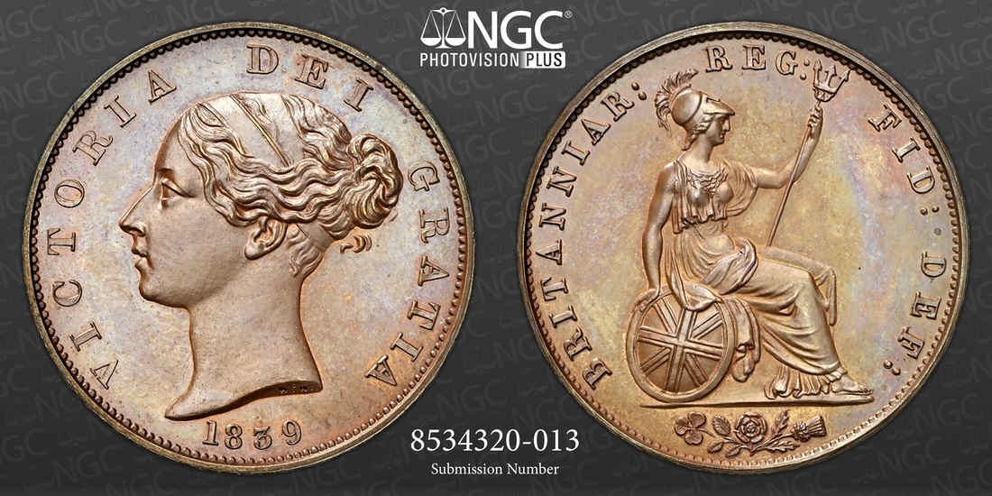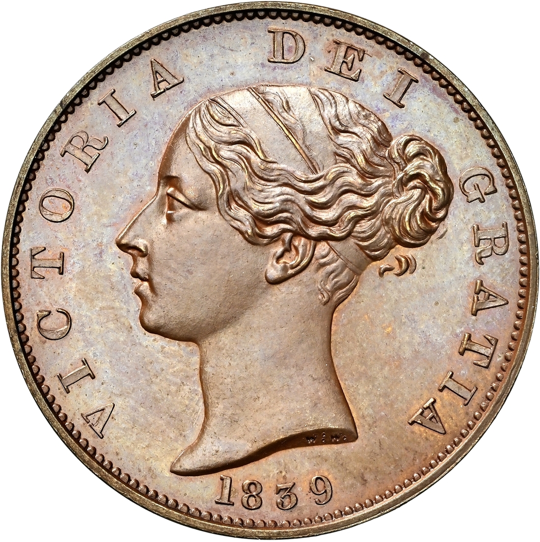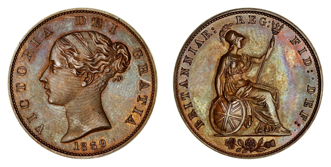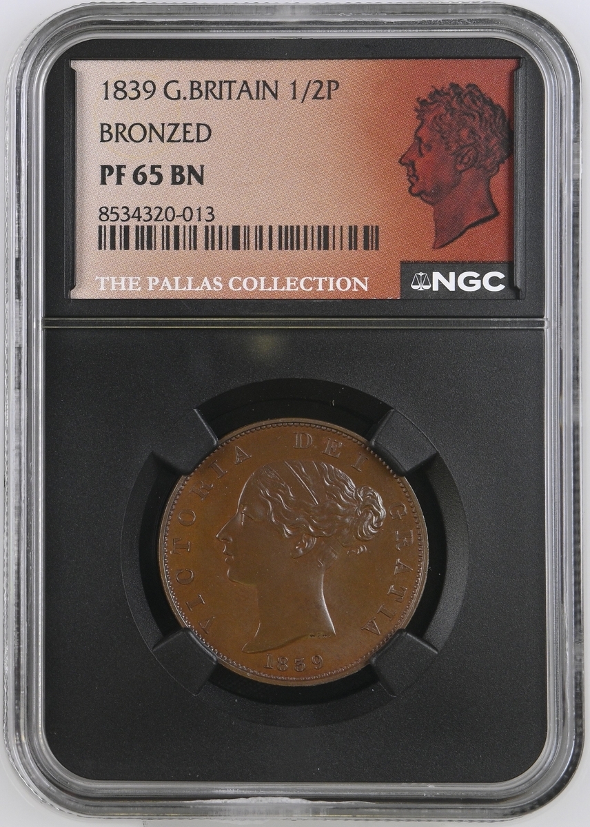 (x) NGC PF65 BN | Victoria (1837-1901), Proof Halfpenny, 1839, in bronzed copper, young diademed head left, rev. struck en médaille, Britannia seated right, edge plain, 9.348g, 1h (BMC [Peck] 1523; S.3949), lightly fingermarked and with wisps of colourful tone in otherwise attractively bronzed fields, a pleasingly bold extremely fine, in NGC Black 'Pallas' holder, generously graded PROOF 65 BROWN (Cert. #8534320-013)
