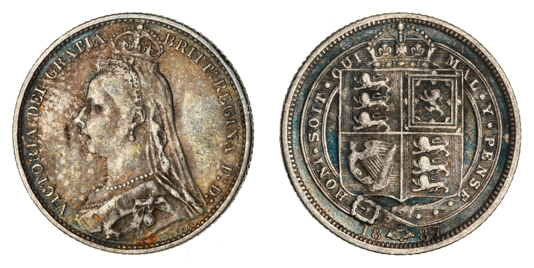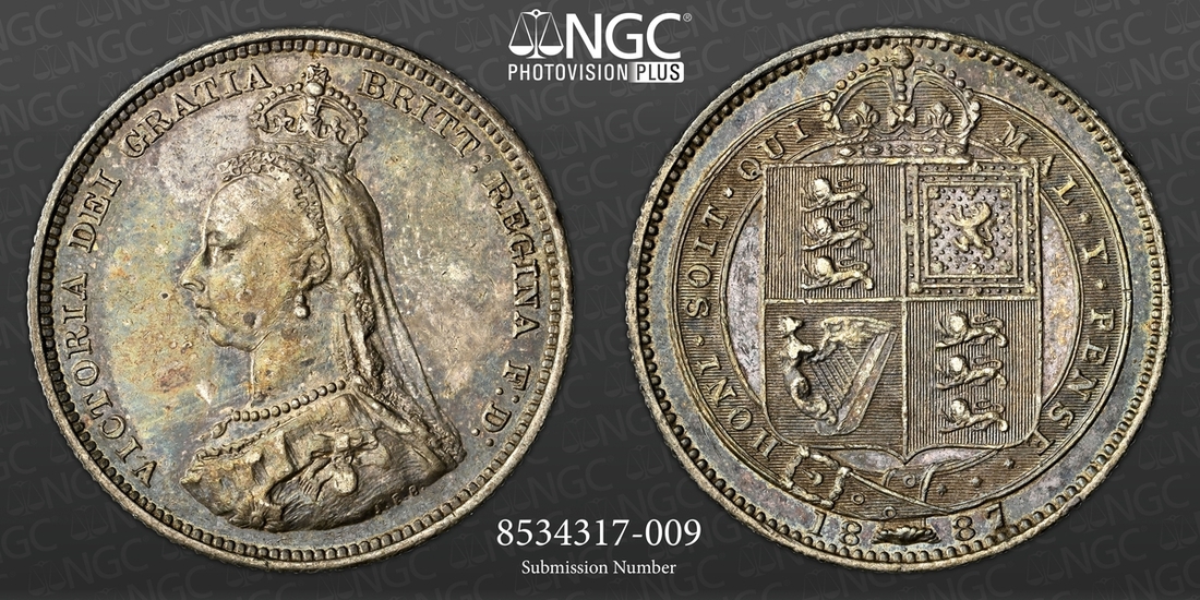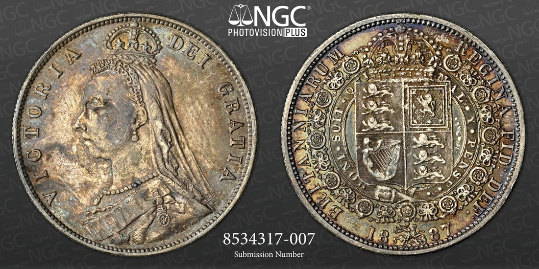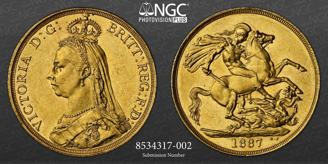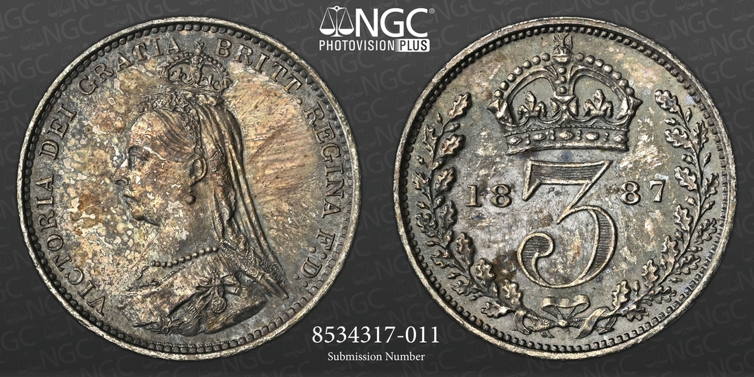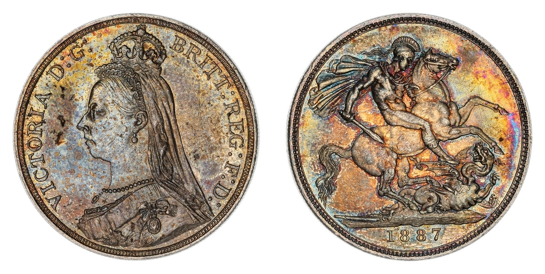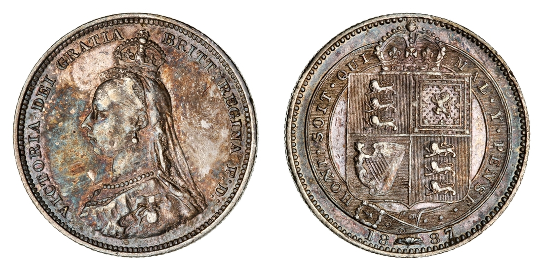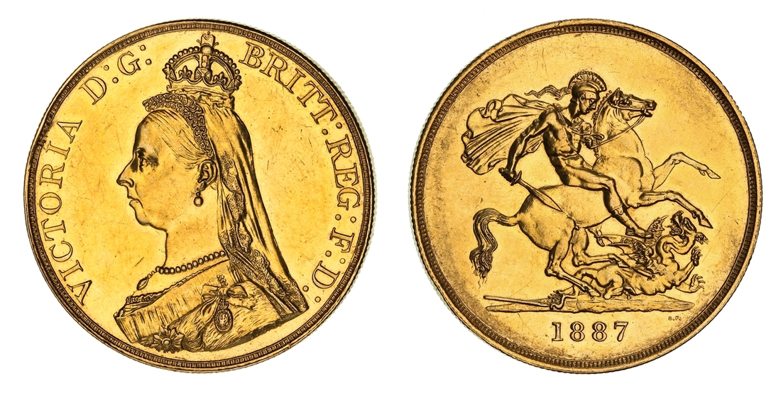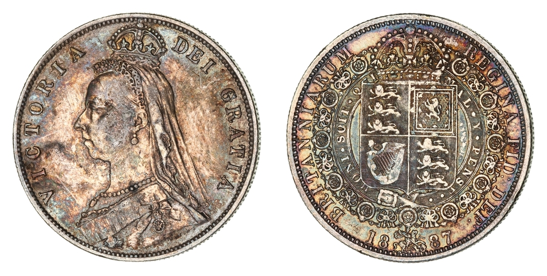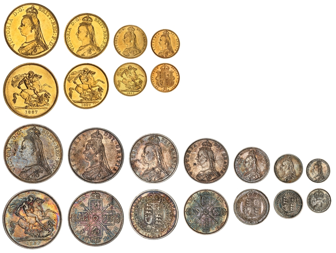 (g) NGC MS61-XF | Victoria (1837-1901), 'Golden Jubilee' Composite Currency Long Set, 1887 (11), Five-Pounds to Half-Sovereign, Crown to Threepence, the Five-Pounds with an edge bruise and the lesser Gold pieces more overtly circulated, otherwise the Silver colourfully toned, very fine or better all in NGC Black 'Pallas' holders (11)