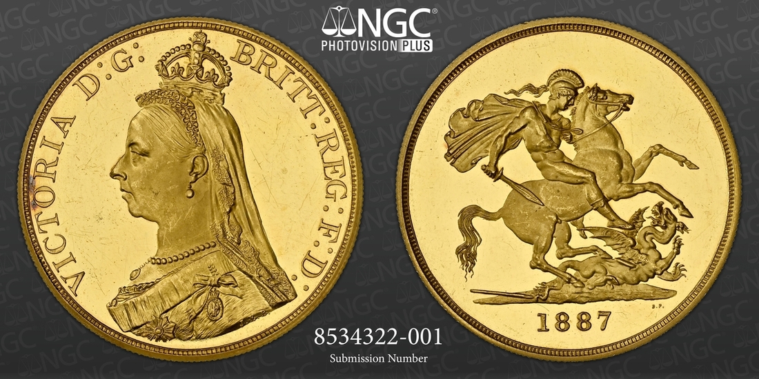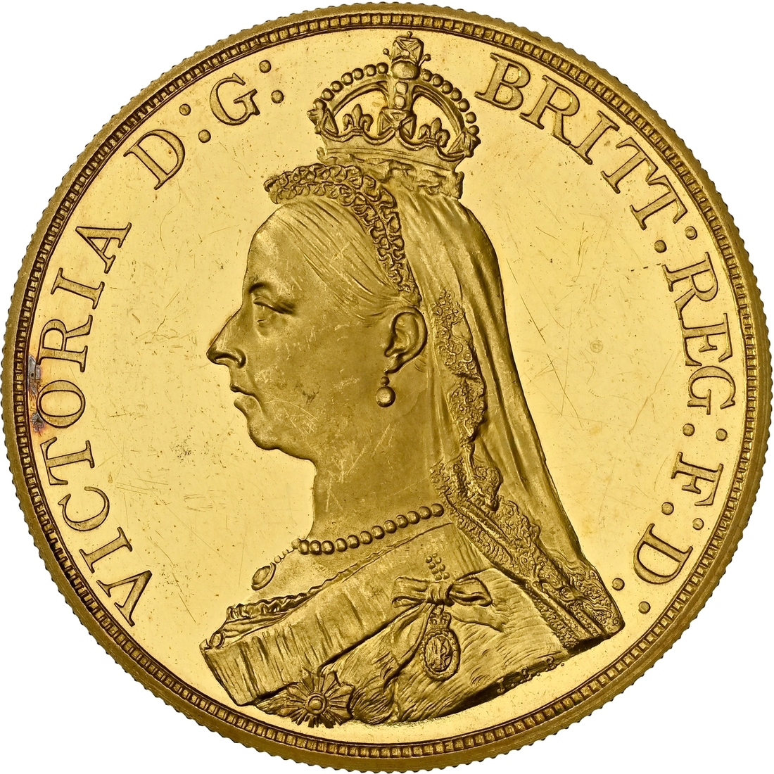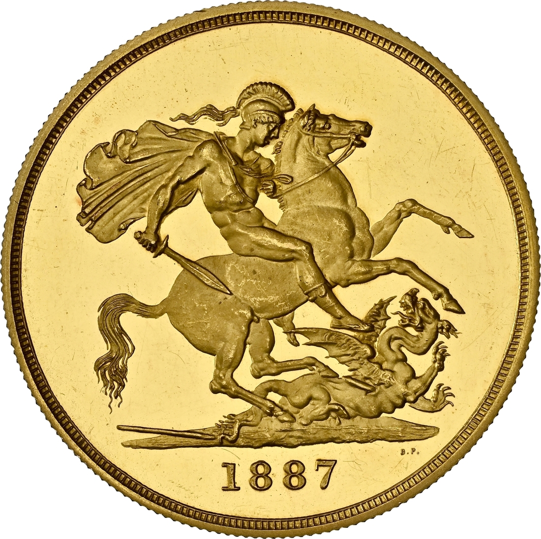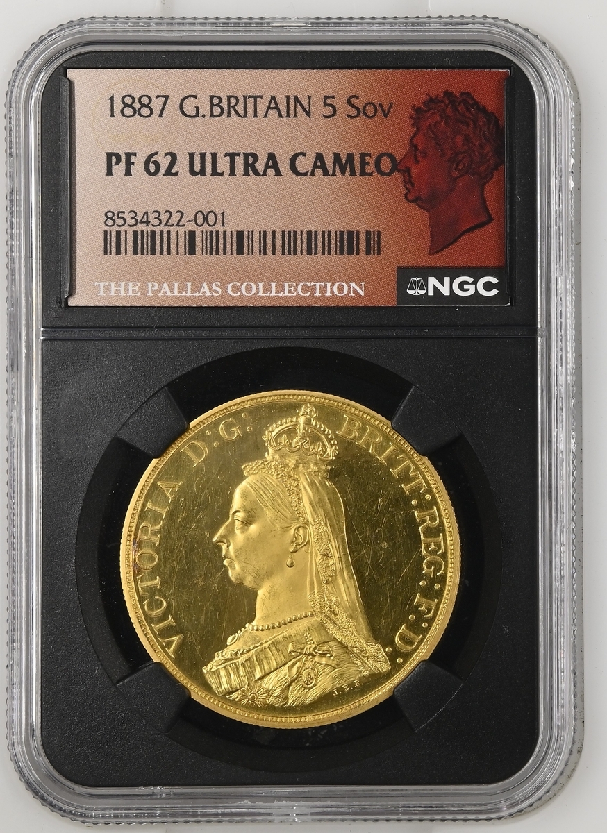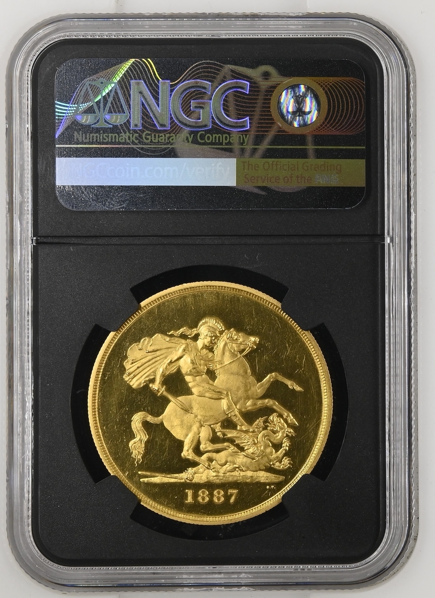 (g) NGC PF62 UCAM | Victoria (1837-1901), 'Golden Jubilee' Proof Five-Pounds, 1887, Jubilee bust left, rev. St George and Dragon, with BP, edge milled, 39.91g*, 12h (W&R 285; EGC II, 1308; Holloway GH 113; Hill F31; S.3864), light handling marks in otherwise brilliant fields, much as issued, and highly-prized in the present market place, with only 797 struck, in NGC Black 'Pallas' holder, graded PROOF 62 ULTRA CAMEO (Cert. #8534322-001)