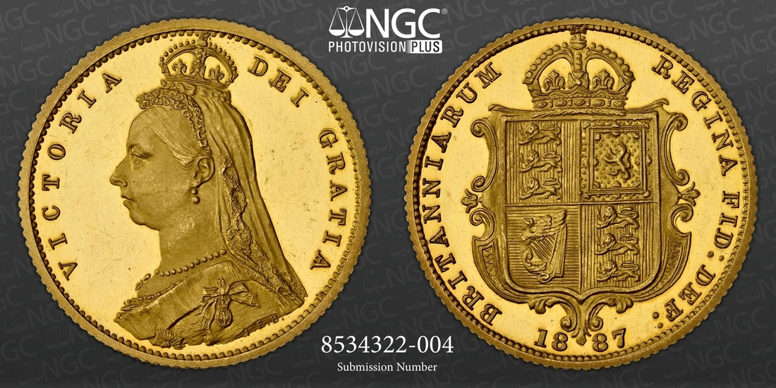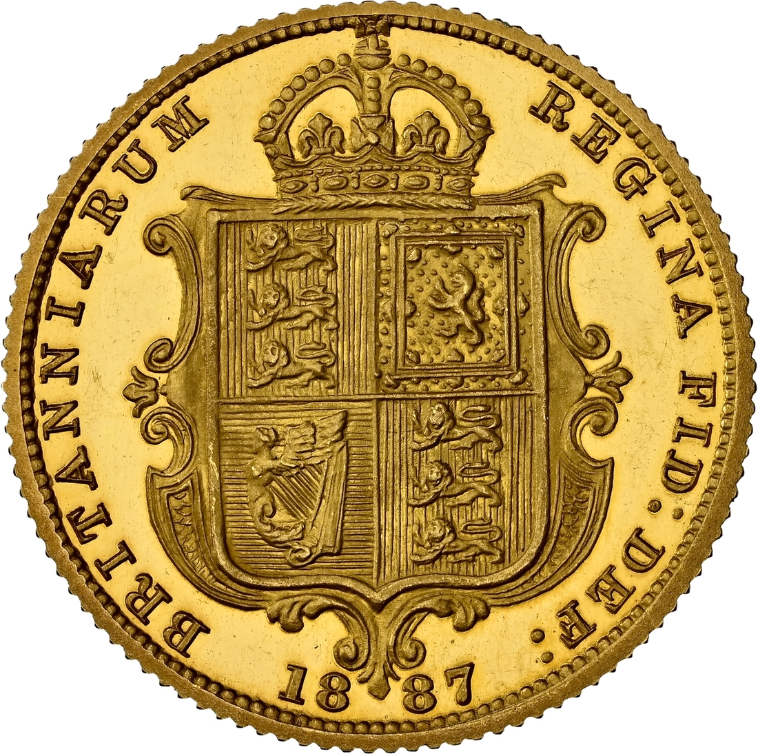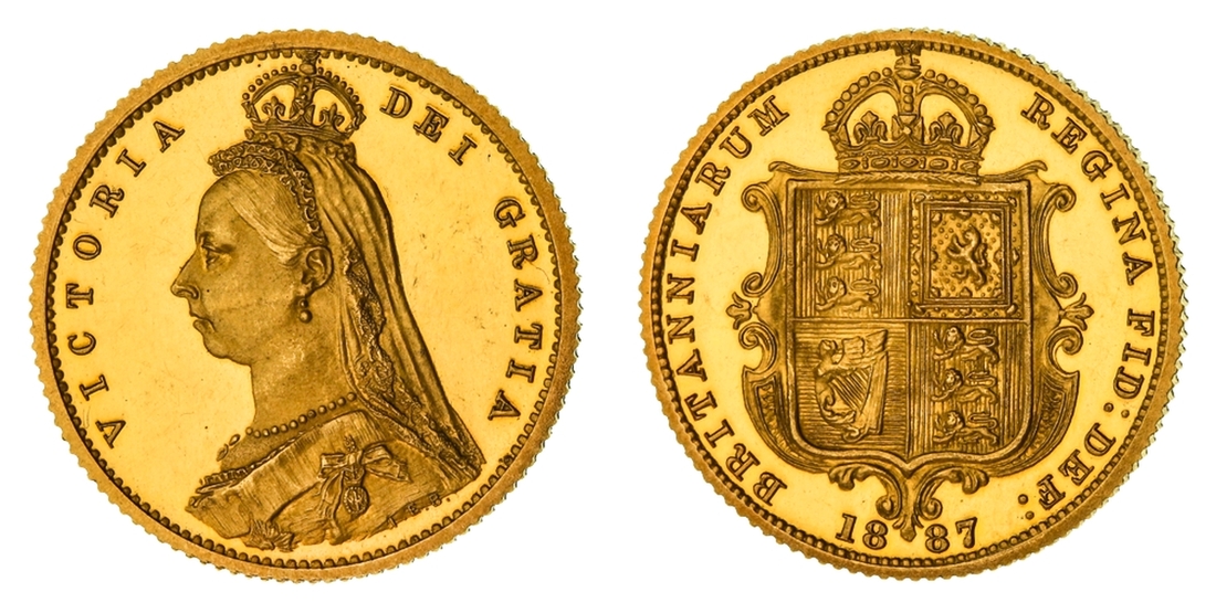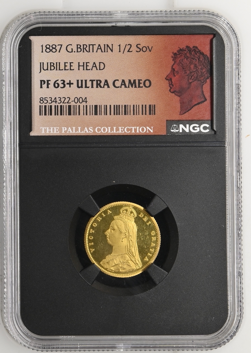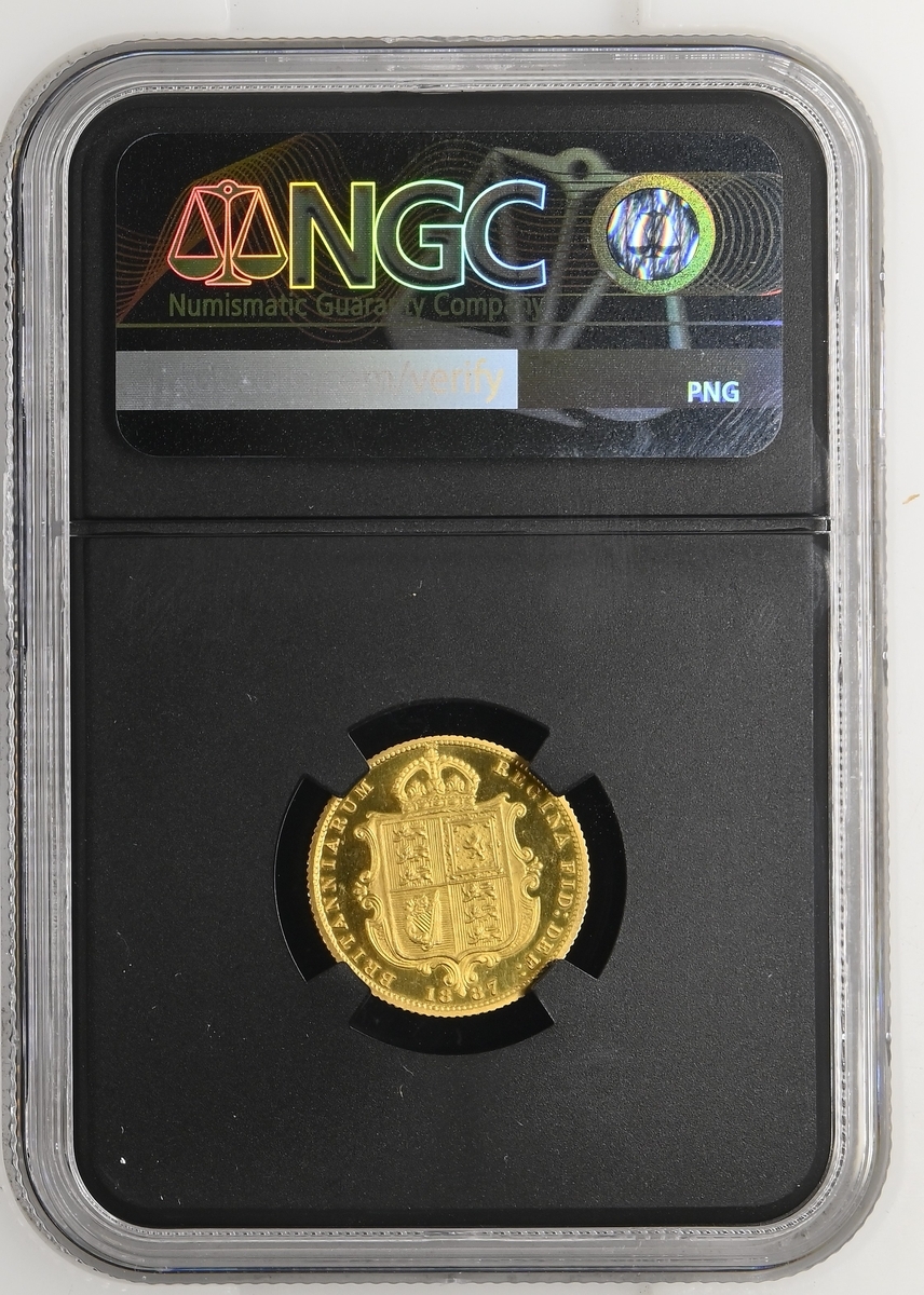 (g) NGC PF63+ UCAM | Victoria (1837-1901), 'Golden Jubilee' Proof Half-Sovereign, 1887, Jubilee bust left, J.E.B. on truncation, rev. crowned 'high' shield, edge milled, 3.99g*, 12h (W&R 362; Hill 478D; EGC II, 1360; S.3869), faint handling marks in otherwise brilliant fields, much as struck, only 797 issued, in NGC Black 'Pallas' holder, graded PROOF 63+ ULTRA CAMEO (Cert. #8534322-004)