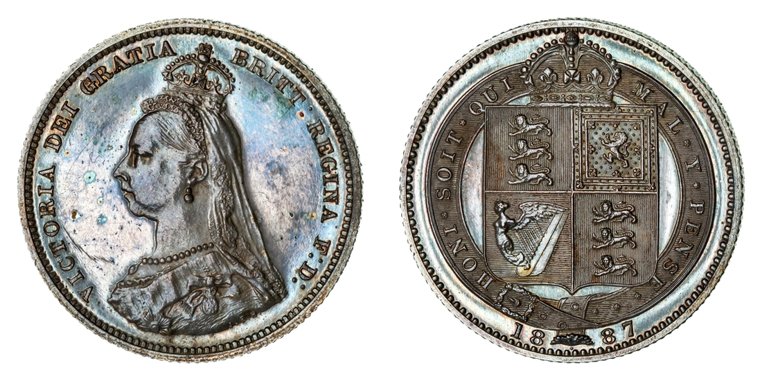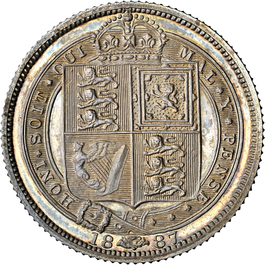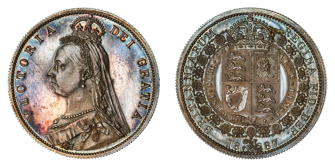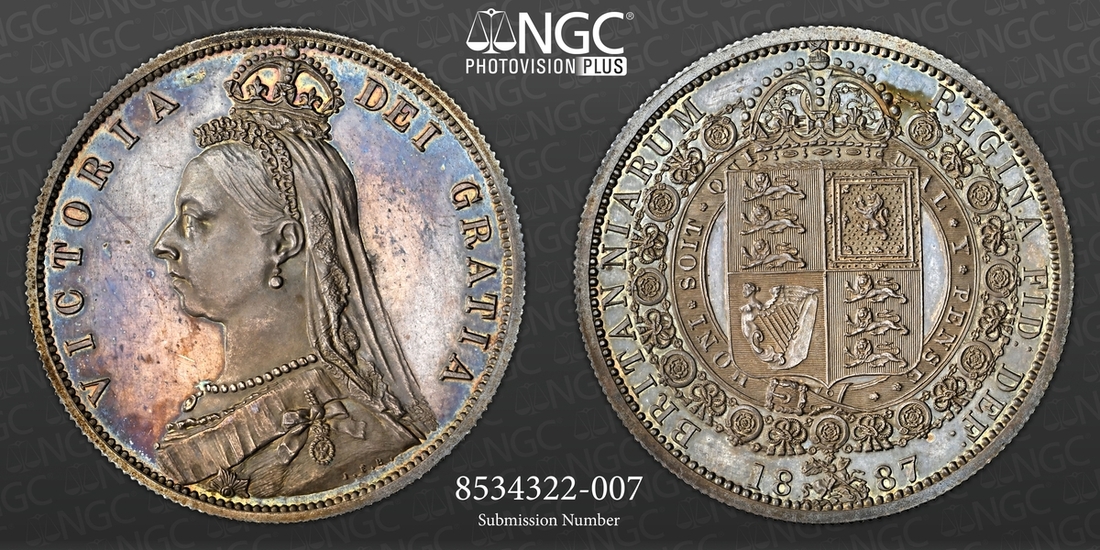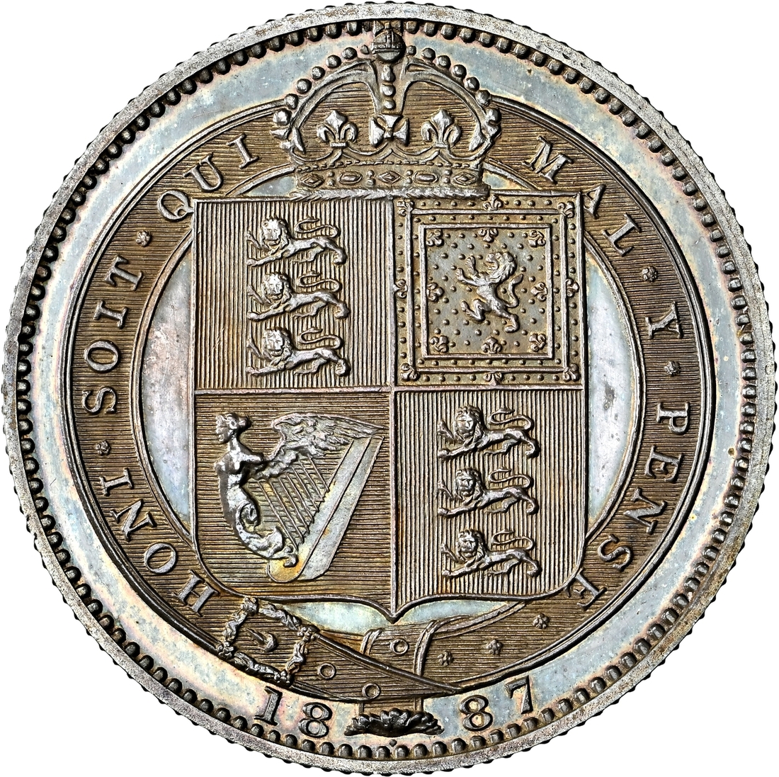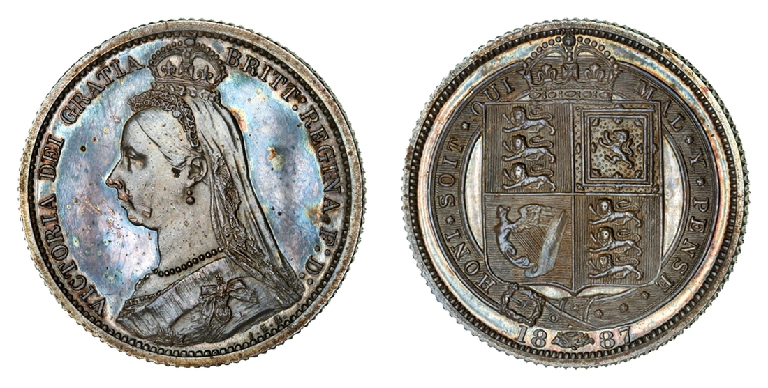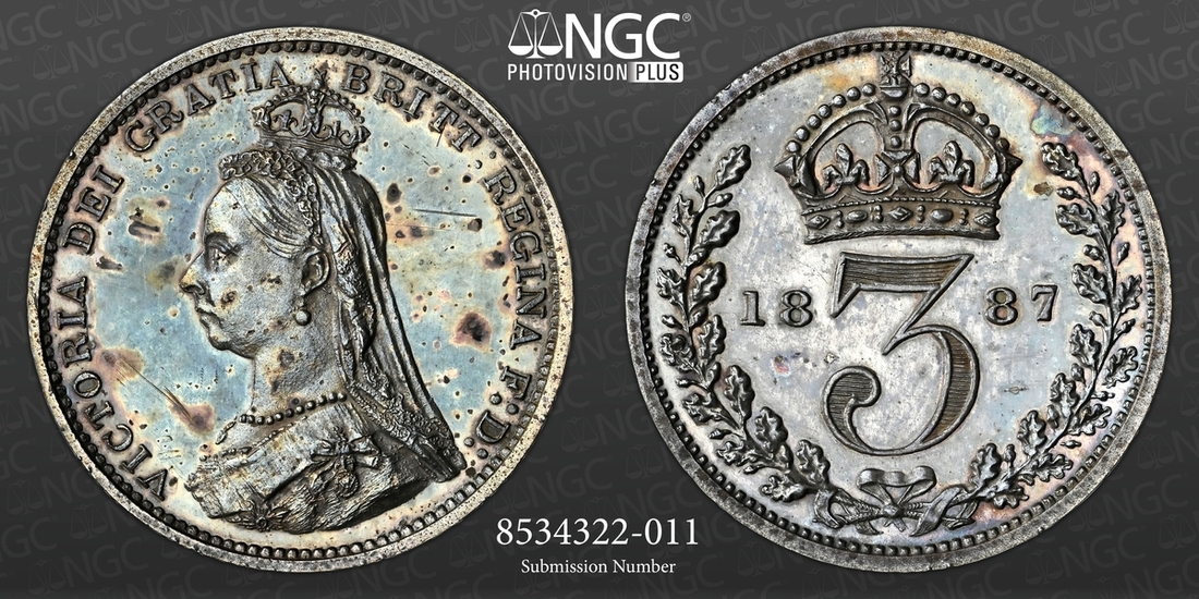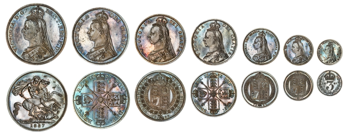 (x) NGC PF64-PF62 | Victoria (1837-1901), 'Golden Jubilee' Silver Proof Set, 1887 (7), Specimen Proof Crown to Threepence, (S.PS6), colourfully toned and arrestingly brilliant as issued, generally as struck with only the deftest of cabinet friction, all in NGC Black 'Pallas' holders (7)
