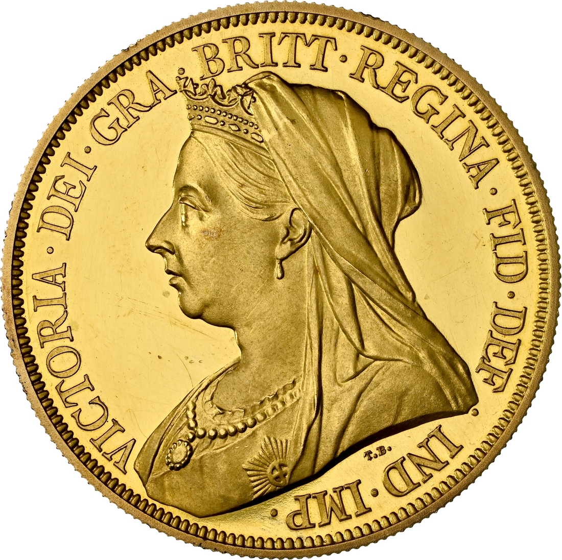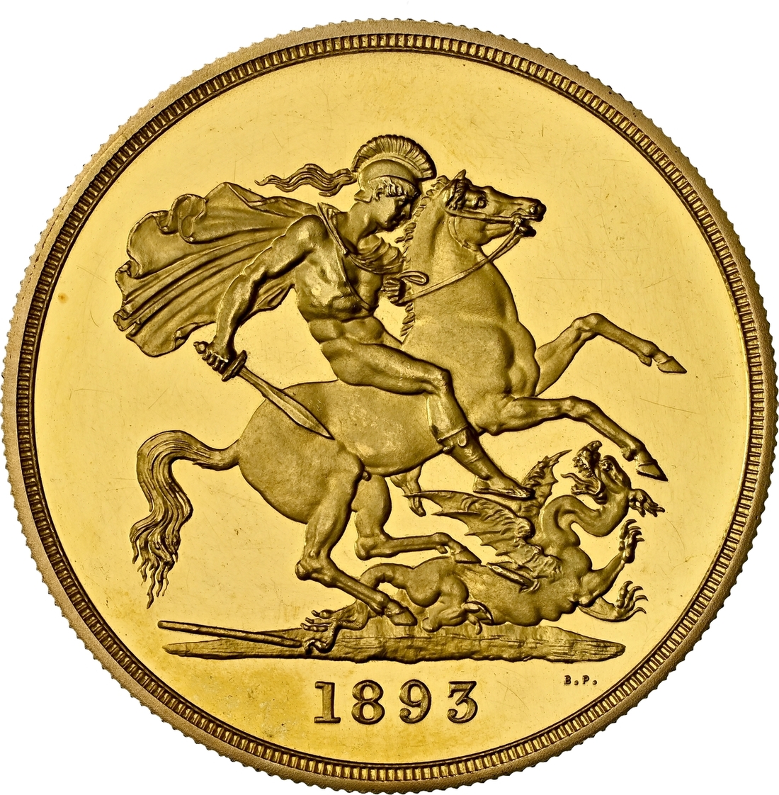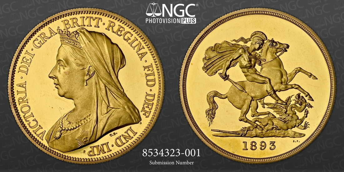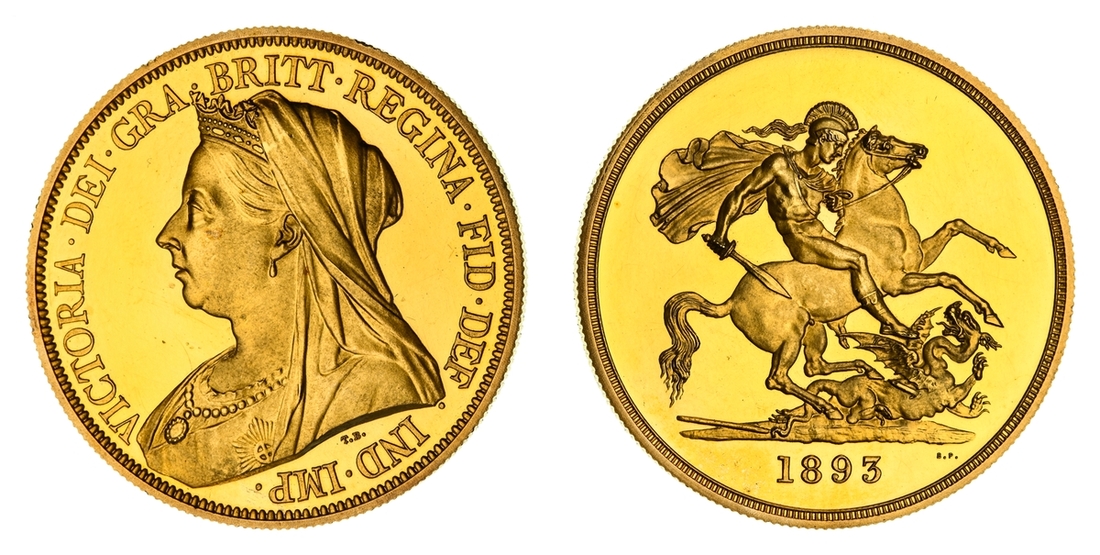 (g) NGC PF62 UCAM | Victoria (1837-1901), 'Old Head' Proof Five-Pounds, 1893, by T. Brock and Benedetto Pistrucci, older veiled or 'widow' bust left, rev. St George and Dragon, edge milled, 39.98g*, 12h (W&R 287; EGC II, 1376; Holloway GH 117; Hill F34; S.3872), light speckles and cabinet friction in otherwise brilliant and handsome honey-golden fields, a pleasingly good extremely fine, and highly-prized given only 773 were struck, in NGC Black 'Pallas' holder, graded PROOF 62 ULTRA CAMEO (Cert. #8534323-001)