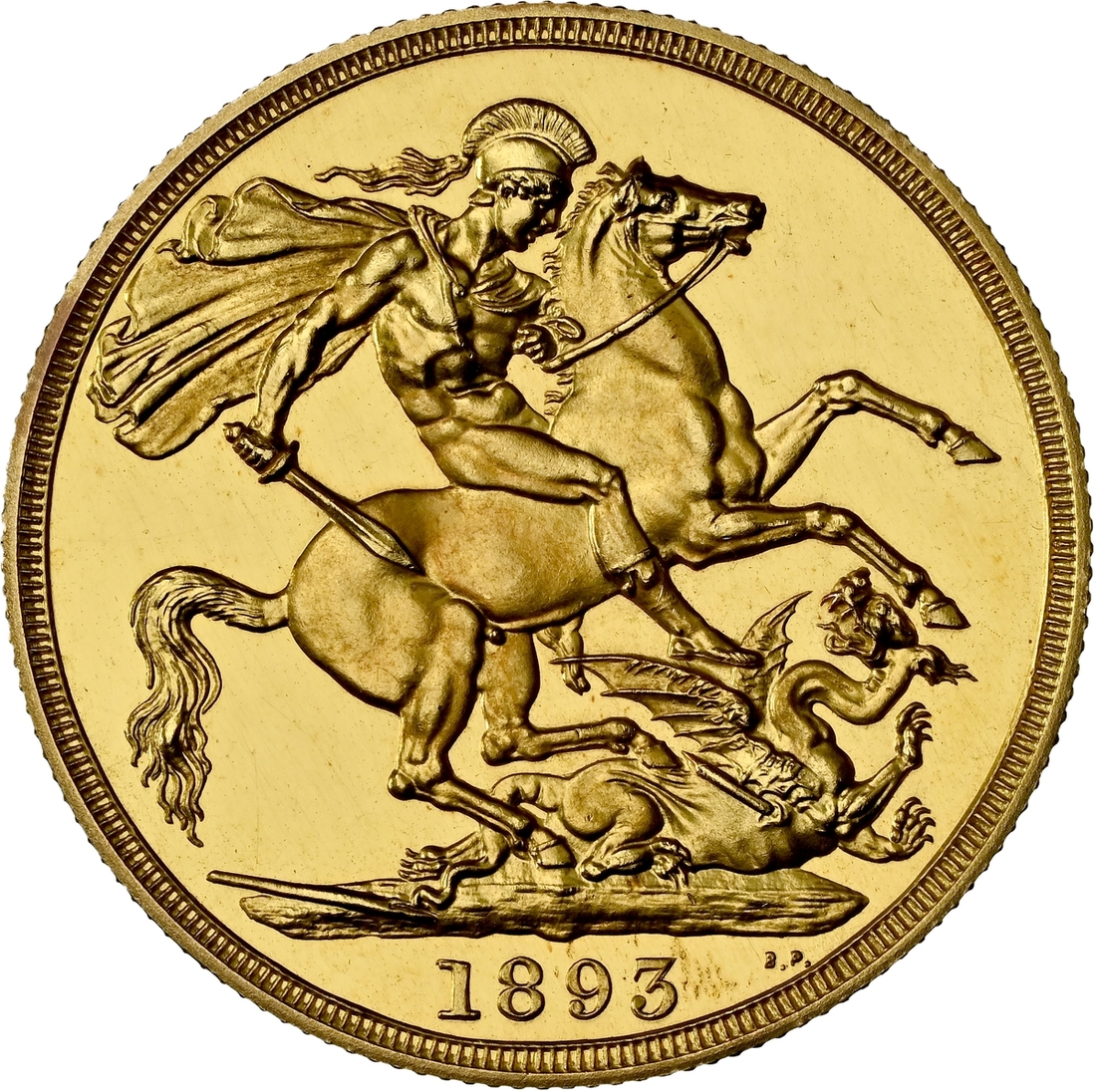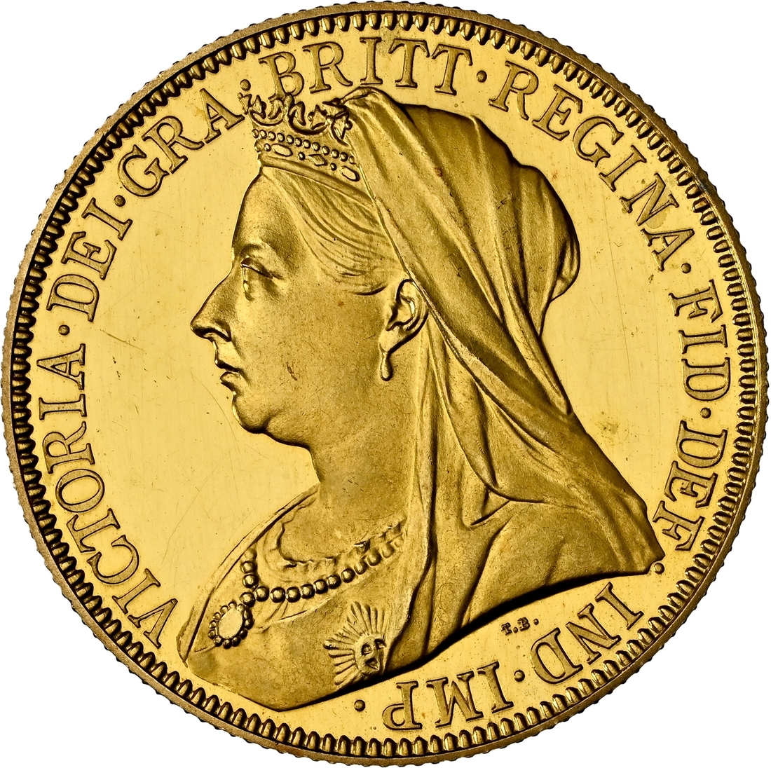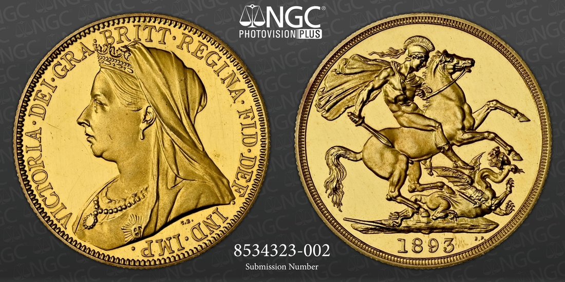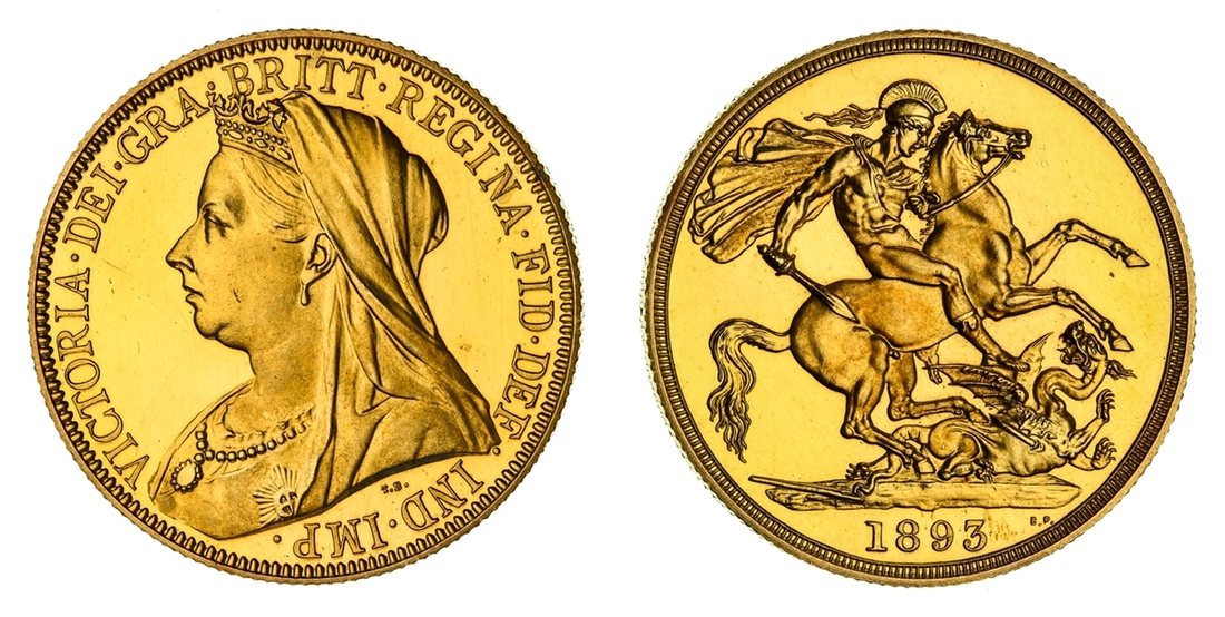 (g) NGC PF63 CAM | Victoria (1837-1901), 'Old Head' Proof Two-Pounds, 1893, by T. Brock and Benedetto Pistrucci, older veiled or 'widow' bust left, rev. St George and Dragon, edge milled, 15.98g*, 12h (W&R 294; S.3873), light speckles and cabinet friction in otherwise brilliant and handsome honey-golden fields, a pleasingly good extremely fine, and highly-prized given only 773 were struck, in NGC Black 'Pallas' holder, graded PROOF 63 CAMEO (Cert. #8534323-002)