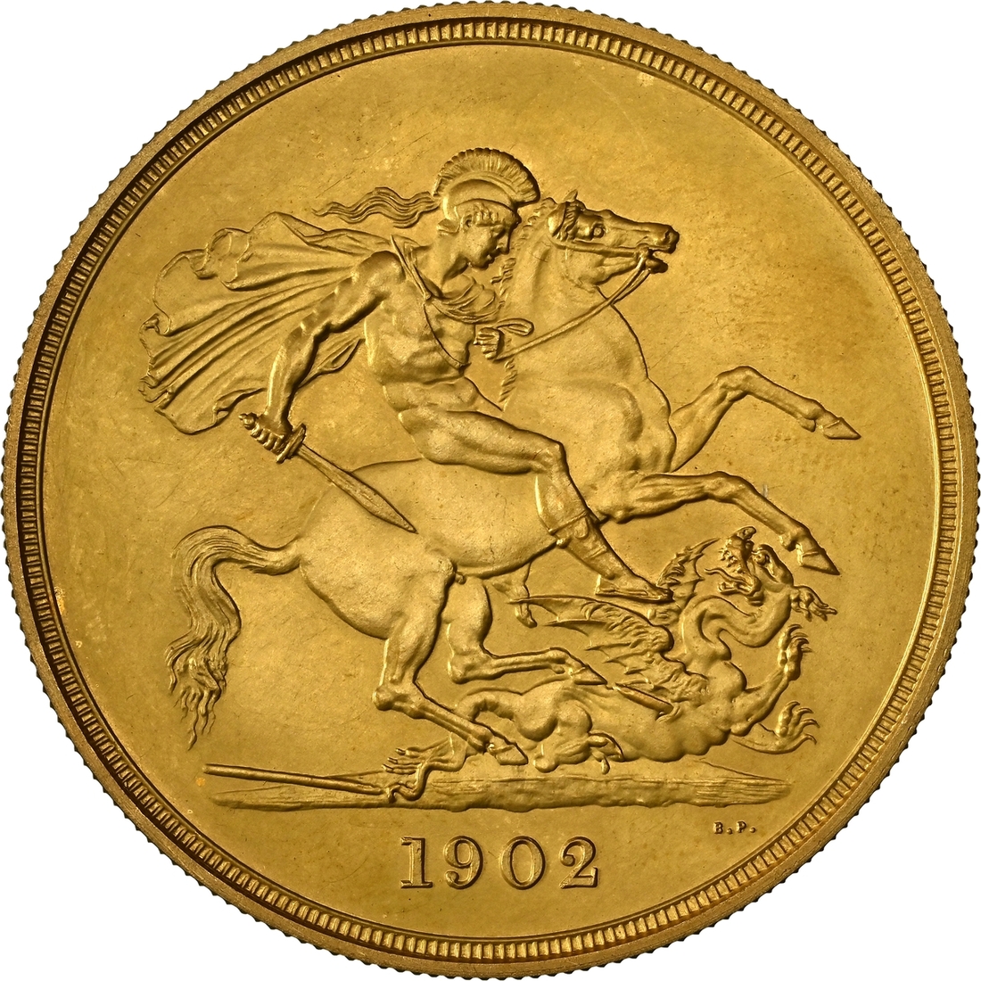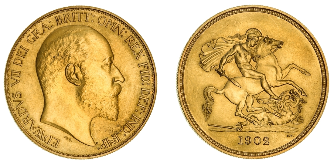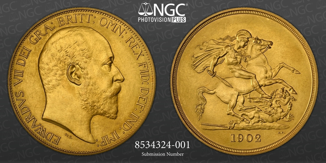 (g) NGC PF65 MATTE | Edward VII (1901-1910), Coronation 'Specimen' Matte Proof Five-Pounds, 1902, by G W de Saulles and Benedetto Pistrucci, bare head right, rev. St. George and Dragon, edge milled, 39.98g*, 12h (MCE -; W&R 404; EGC II, 1400; Hill F36; Holloway GH 120; S.3966), a few wisps in fields, otherwise an exquisite and practically flawless sandblasted GEM, choice FDC, a supremely difficult coin to acquire this 'Best in Class' grade!, in NGC Black 'Pallas' holder, stringently graded MATTE PROOF 65 (Cert. #8534324-001)