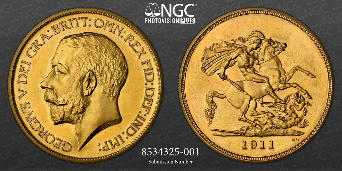 (g) NGC PF65 | George V (1910-1936), Coronation 'Specimen' Proof Five-Pounds, 1911, by Mackennal and Pistrucci, bare head left, rev. St George and Dragon, edge milled, 39.89g*, 12h (W&R 414; Stratos 207; Marsh F38; EGC II 1430; S.3994), brilliant uncirculated, in NGC Black 'Pallas' holder, graded PROOF 65 (Cert. #8534325-001)