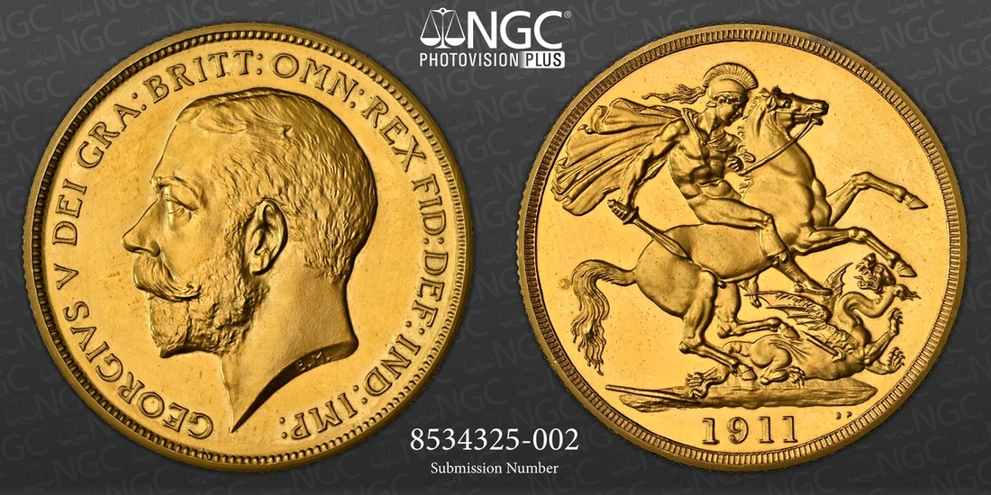 (g) NGC PF66 | George V (1910-1936), Coronation 'Specimen' Proof Two-Pounds, 1911, by Mackennal and Pistrucci, bare head left, rev. St George and Dragon, edge milled, 15.96g*, 12h (W&R 415; EGC II, 1431; Hill T44; Stratos 266; S.3995), brilliant uncirculated, in NGC Black 'Pallas' holder, graded PROOF 66 (Cert. #8534325-002)