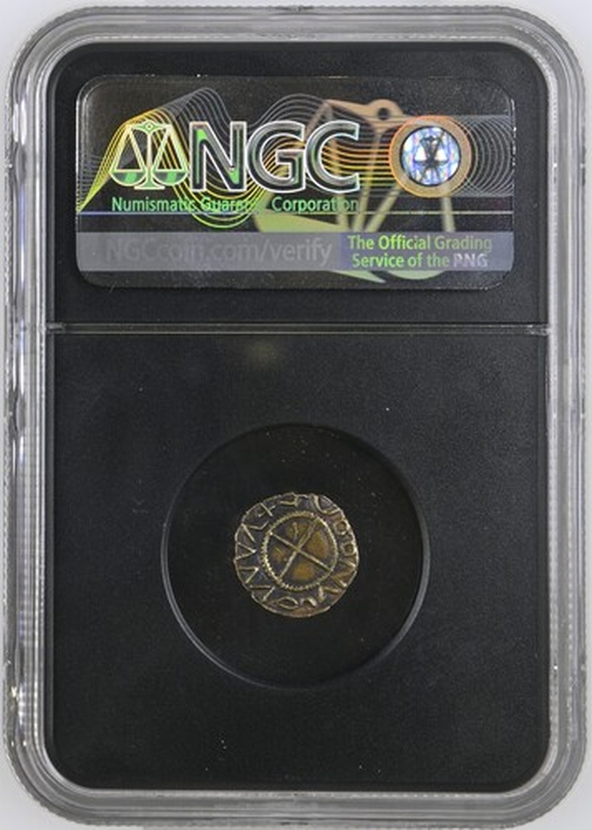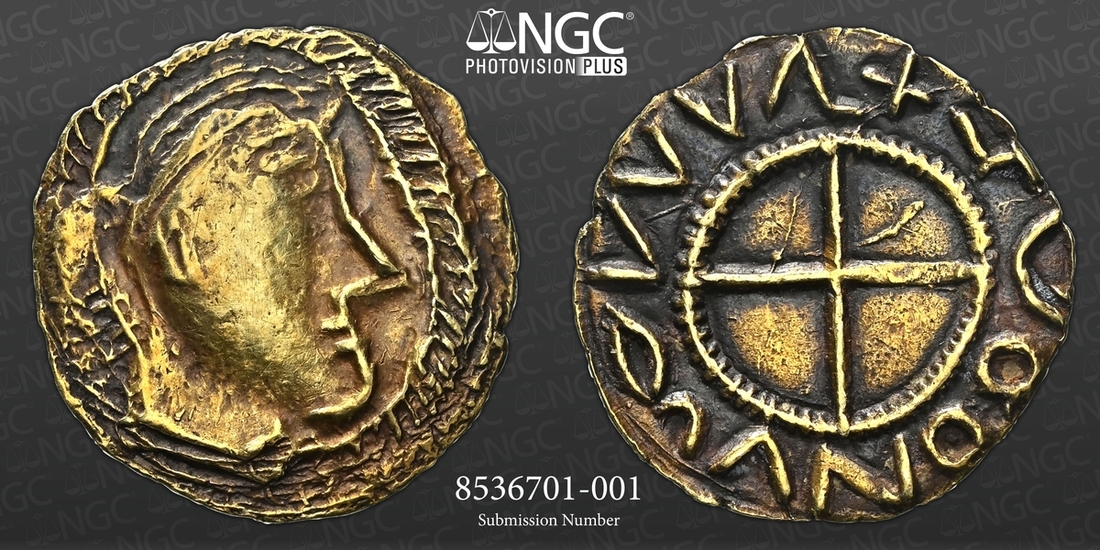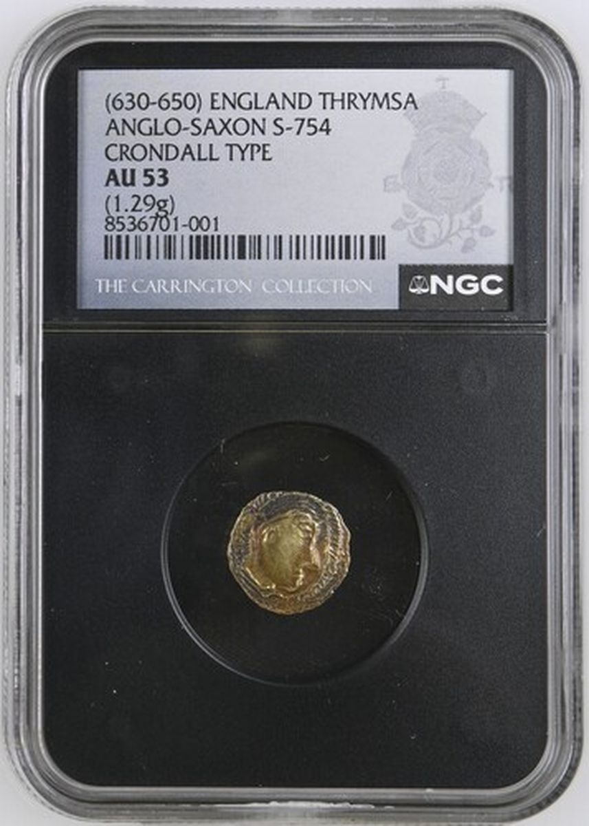 (x) NGC AU53 | Early Anglo-Saxon England, Crondall Types (c. 630-650), Gold Shilling, 'Substantive Gold' Phase, London derived, crude bust right, with large features and hair swept back, striated halo forms border, rev. blundered legends, cross in beaded circle, 1.270g, [19.58gns] (SCBI 69 [Abramson], 1; Sutherland 52 same dies; North 22; S.754), slightly smoothed to portrait and of a pale gold fabric, otherwise a richer cabinet tone, a most pleasingly good very fine, rare and with a prestigious provenance, in NGC Black 'Carrington' holder, graded AU53 (Cert. #8536701-001)