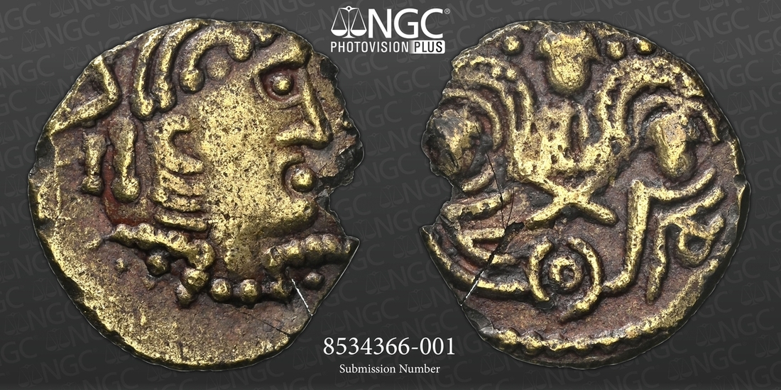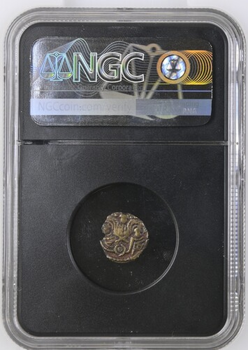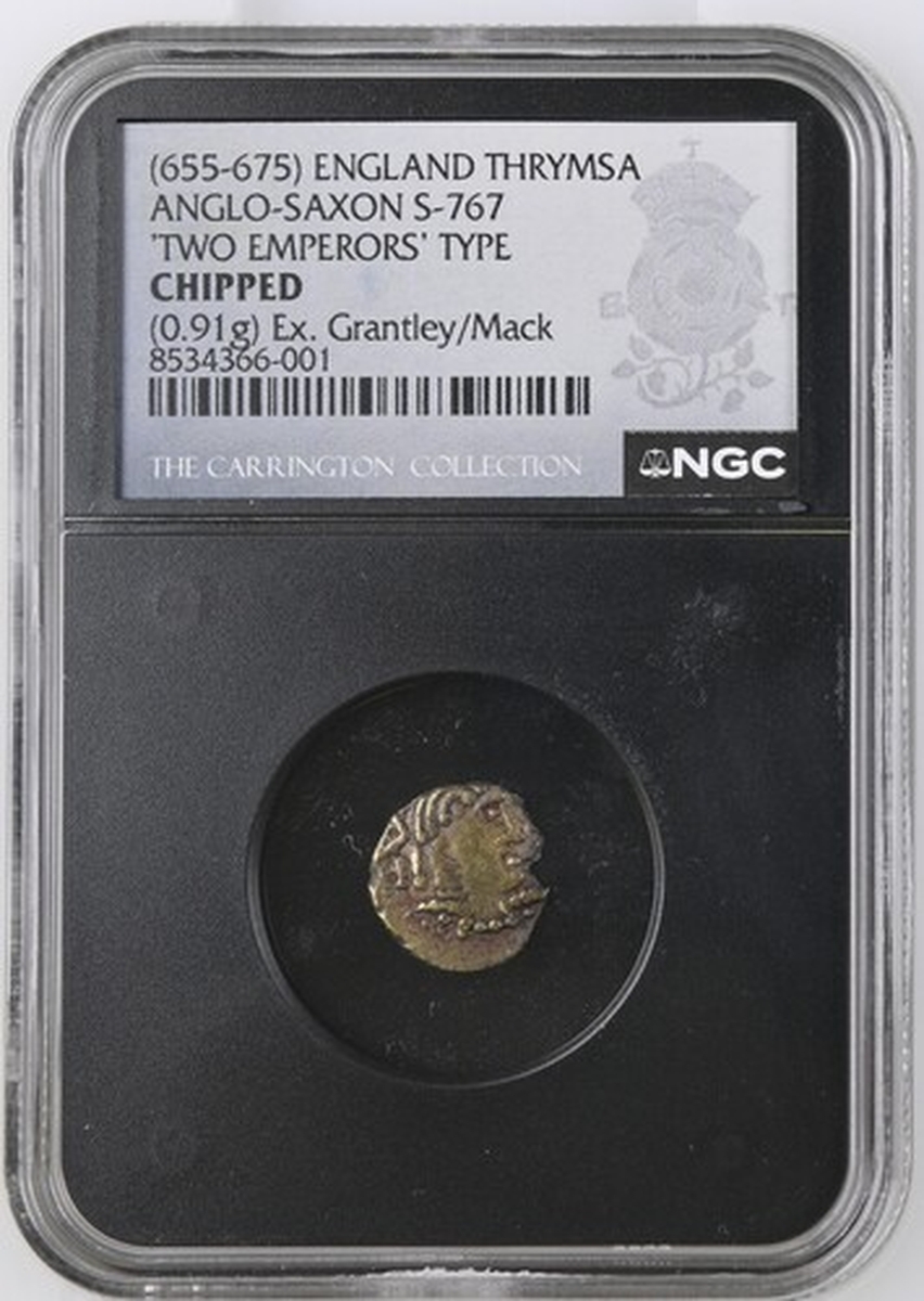 Early Anglo-Saxon England, Post-Crondall Phase (c. 655-675), Pale Gold Shilling, 'Two Emperors' type, in the style of a Imperial 4th Century Solidus, VAE | N, pearl diademed and cuirassed bust right, cross-on-step before, rev. Victory (or Angel) spreading wings over two seated Emperors, 0.898g [13.85grns] (Montagu I, 146; Oman [NumChron, 1929], no. 2; Sutherland 33; SCBI 20 [Mack], 308 = EMC 1020.0308 this coin; SCBI 69 [Abramson], 12; North 20; BMC, Pl. I, no. 2; S.767), striking split by mouth and a trace offset, otherwise on a paler-gold planchet, very fine and with a fine pedigree, in NGC Black 'Carrington' holder, graded Genuine ~ "Chipped" (Cert. #8534366-001)