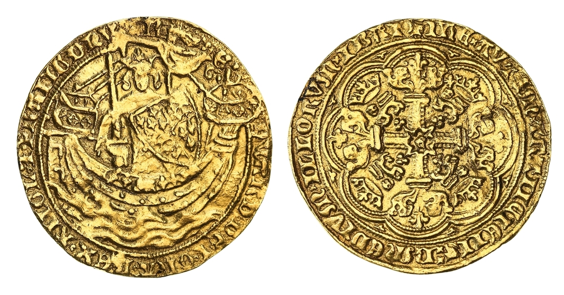 (x) Edward III (1327-1377), Pre-Treaty Period, Series E/G Mule, Noble, 1356-1361, Tower (London), E • | DWARD •' DEI . GRA • REX AIIGL . Z . FRAnC D hYB, annulet stops, King standing in ship, holding sword and shield, ropes 3/1, ornaments -11-11-, quatrefoils 3/3, rev. + IhC x AVTEM x TRAIICIEIIS : P x MEDIVM x ILLORVM x IBAT, saltire stops, unbarred Ns, floriate cross, crowned leopards in angles, small E at centre, additional lys in second quarter, and annulets flanking uppermost lys, 7.581g [117.02gns], 2h, m.m. cross 3 (Schneider I, 34; LAL E/Gb or c, dies AJ/88 (=13); Doubleday 85 same dies; North 1160/1180; S.1488/1490), bright and edges made round from previous mounting, otherwise residually lustrous, struck details better than fine, an excessively rare mule