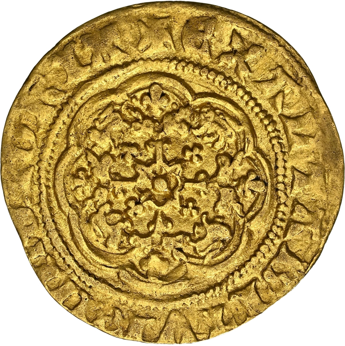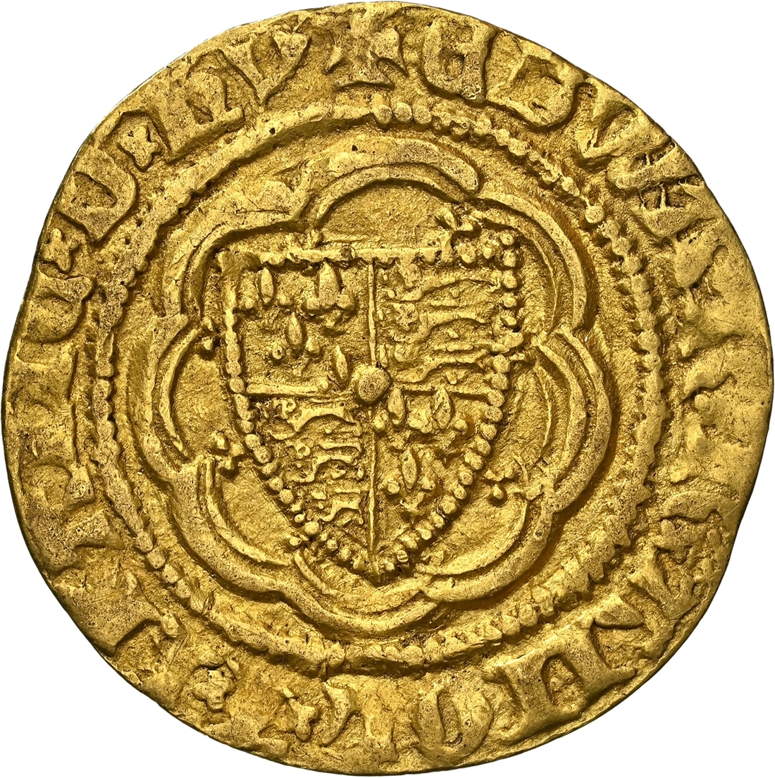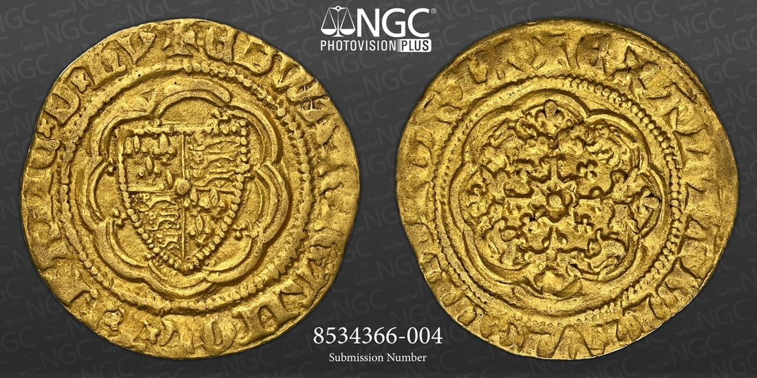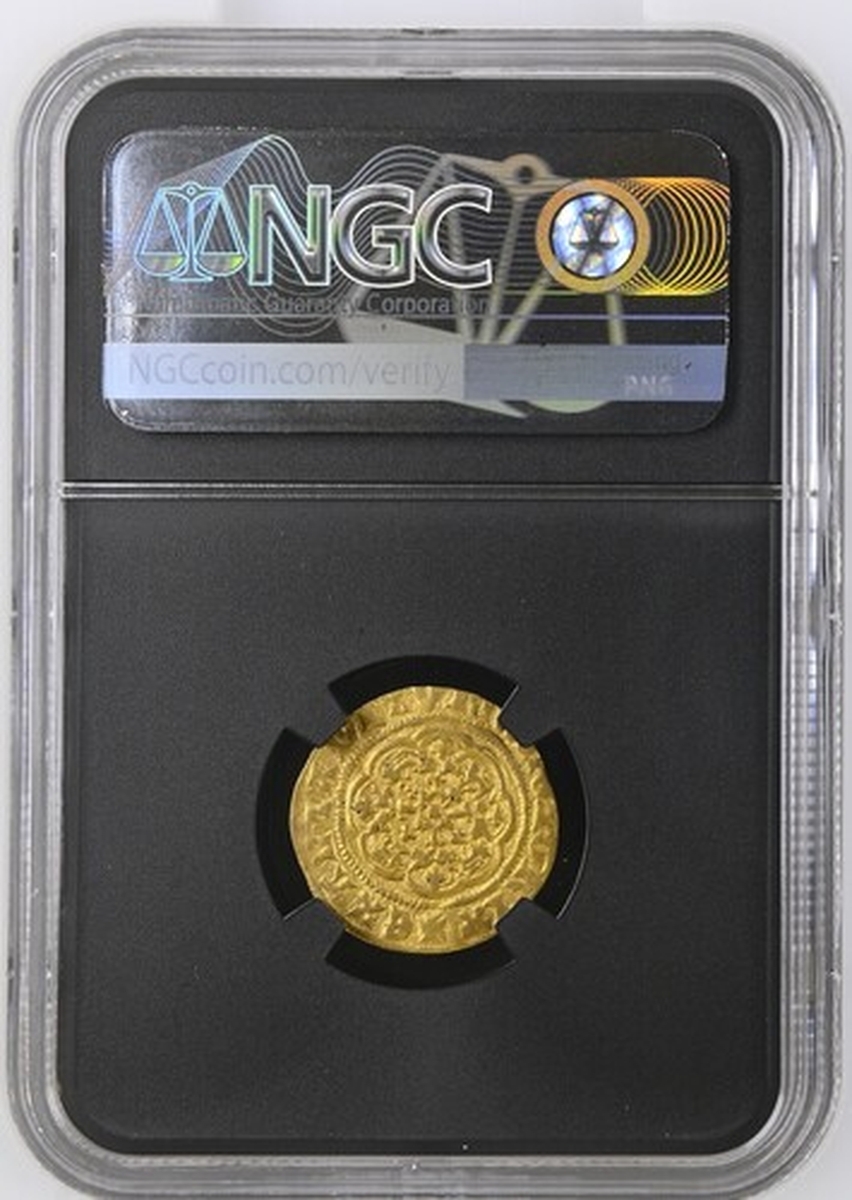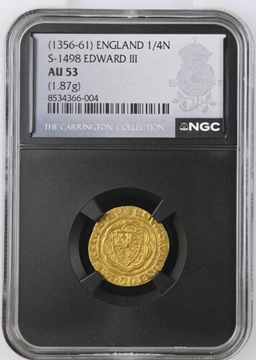 (x) NGC AU53 | Edward III (1327-1377), Pre-Treaty Period, Series G, Quarter-Noble, 1356-1361, Tower (London) + EDWAR R AnGL x' Z x FRAnC x D x hY, saltire stops, Royal Shield quartered with the Arms of France and England, all within a double tressure of eight arches, rev. + EXALTABITVR x IN x GLORIA, saltire stops, floriate cross, leopards in angles, pellet at centre, 1.874g [28.94gns], 6h, m.m. cross pattée (Schneider I, 49; North 1191; S.1498), on a fuller flan, lightly cabinet toned and residually lustrous, an attractive and bolder very fine, in NGC Black 'Carrington' holder, graded AU53 (Cert. #8534366-004)