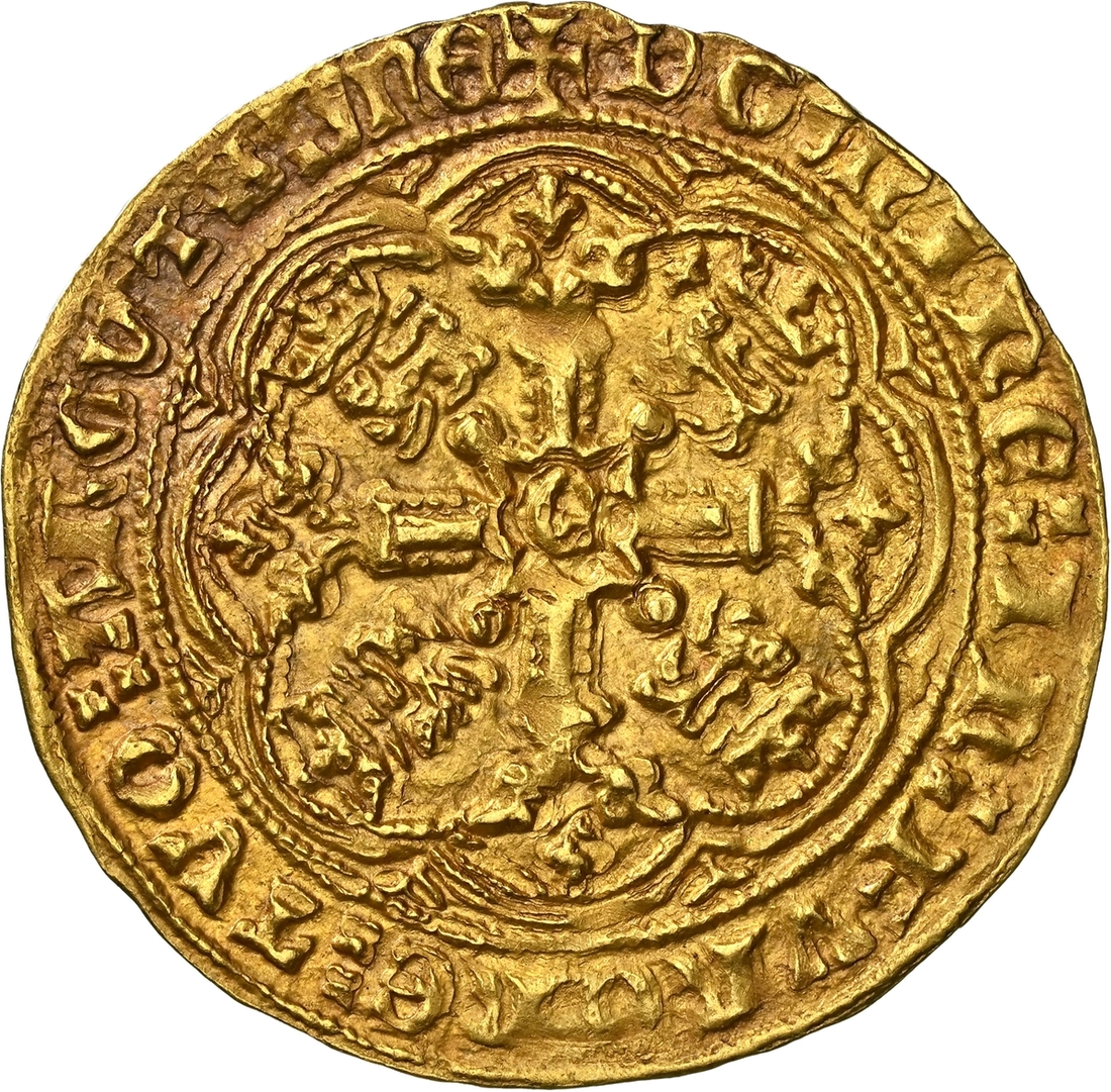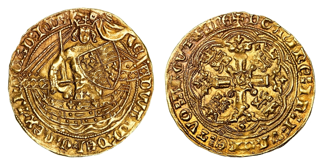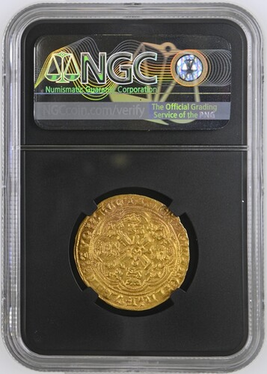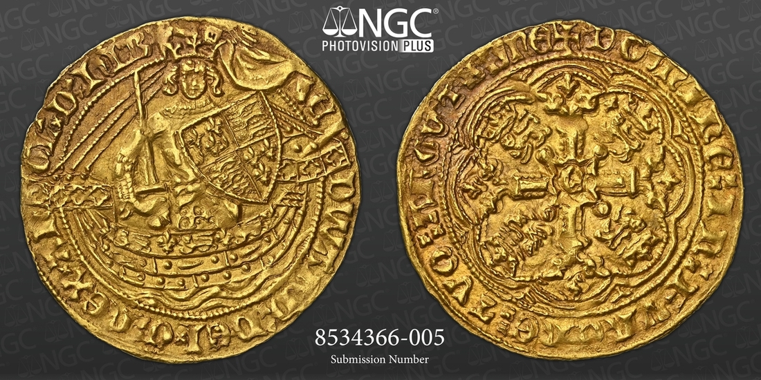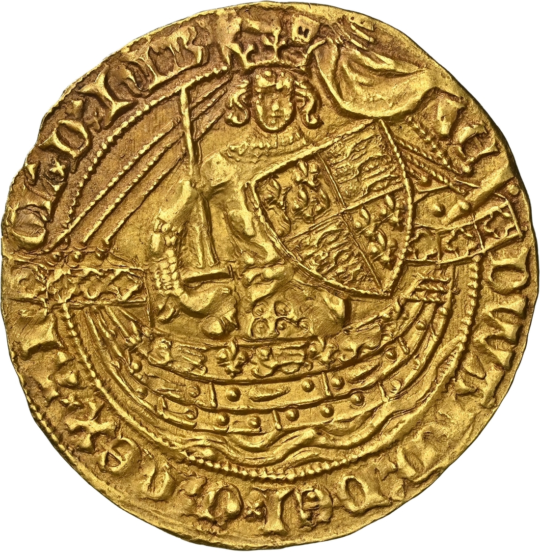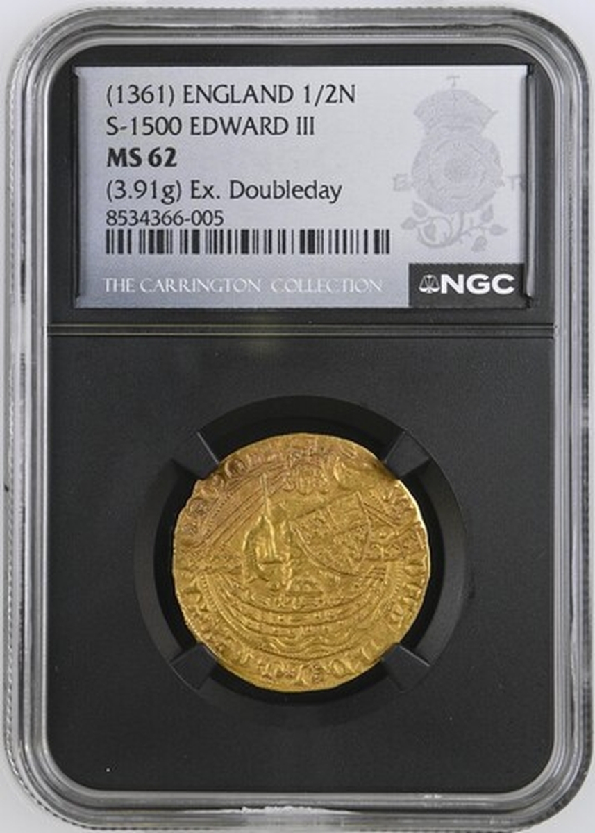 (x) NGC MS62 | Edward III (1327-1377), Transitional Treaty Period, Half-Noble, 1361, the so-called "Cursing" Type, Tower (London), E | DWARD : DEI x G REX x ANGL D : hIB, saltire stops, King standing in ship, holding sword and shield, ropes 3/3, ornaments 1-1-1-1, quatrefoils 4/3, lys 3, rev. + DOMINE : IN : FVRORE : TVO : ARGVTS : ME, saltire stops, floriate cross, crowned leopards in angles, annulets to corners of central panel, large E at centre, additional lys in second quarter, 3.916g [60.44grns], 2h, i.m. cross pattée (LAL dies k/5; Doubleday 184 this coin; Schneider I, -; North 1223; S.1500), some traces of doubling to reverse legends, otherwise a superb example for this difficult series, richly and wholesomely cabinet toned, approaching extremely fine, and very rare thus, in NGC Black 'Carrington' holder, graded MS62 (Cert. #8534366-005)