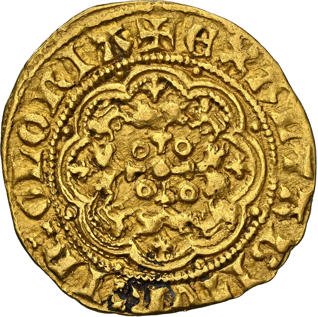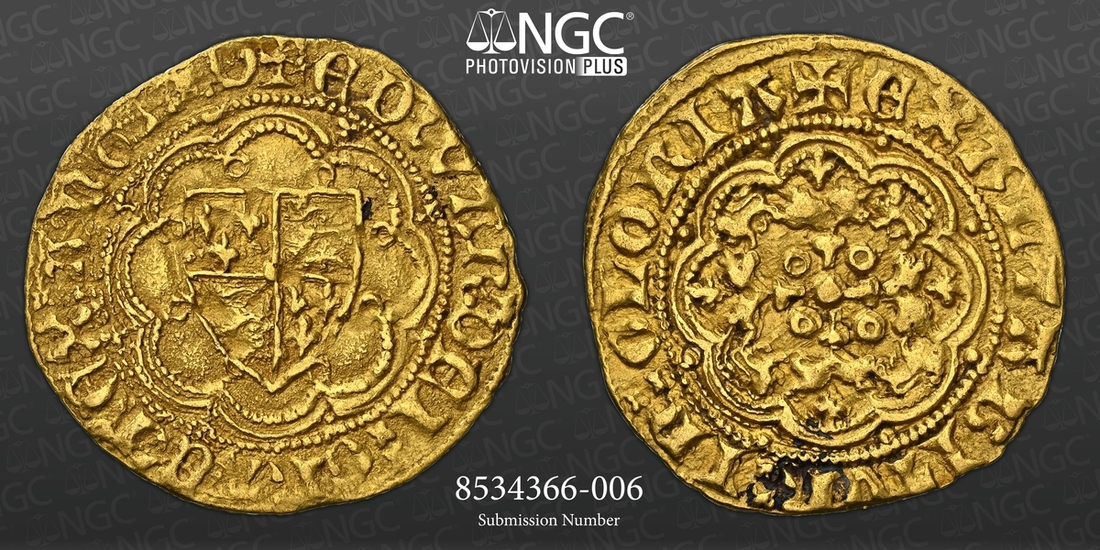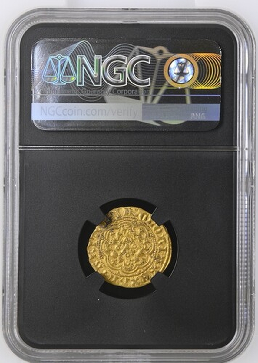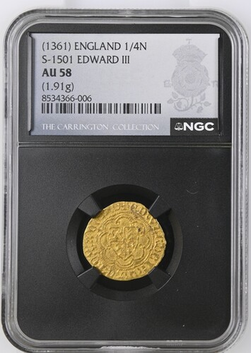 (x) NGC AU58 | Edward III (1327-1377), Fourth Coinage, Transitional Treaty Period, Quarter-Noble, Tower (London), + EDWAR .' DEI : GRAC : REX : AnGL : D, double saltire stops, Royal Shield quartered with the Arms of France and England, all within a double tressure of eight arches, annulets on cusps, trefoils in spandrels, rev. + EXALTABITVR : In : GLORIA :, double saltire stops, pellet in centre of ornate cross potent with lys terminals, annulets within each inner angle, lion within each outer angle, pellets in spandrels, 1.900g [29.34gns], 4h, i.m. cross pattée (Schneider I, 69; North 1224(iii); S.1501), struck with rusty dies, otherwise lightly toned on a full flan, a pleasing very fine, in NGC 'Carrington' holder, sympathetically graded AU58 (Cert. #8534366-006)