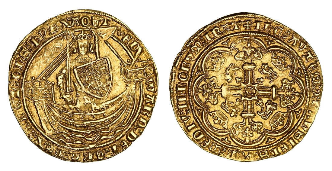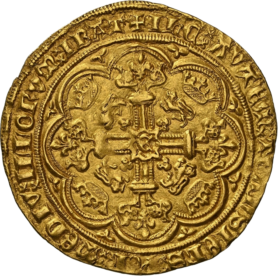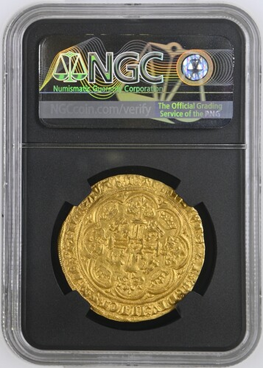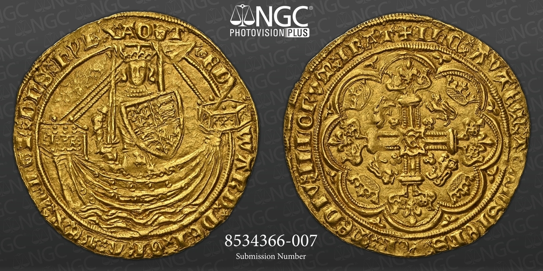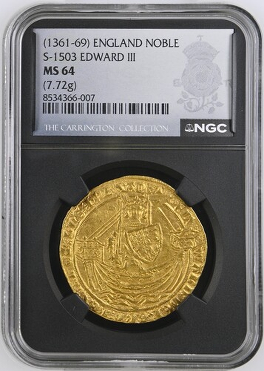 (x) NGC MS64 | Edward III (1327-1377), Fourth Coinage, Treaty Period, Noble, 1363-1369, Tower (London), . ED | WARD : DEI : GRA : REX : AnGL : DnS : hyB, annulet before EDWARD, double saltire stops, King standing in ship, holding sword and shield, ropes 3/1, ornaments [11]-11, quatrefoils 4/4, rev. + IhC : AVTEM : TRAnSIEnS : PER : MEDIV : ILLORVM : IBAT, double saltire stops, floriate cross crowned leopards in angles, E at centre, 7.708g [118.96gns], 10h, i.m. cross pattée (Schneider I, 86-87; North 1232; S.1503), a trace double-struck with aged dies, otherwise handsomely cabinet toned and lustrous, a pleasing very fine, the reverse bolder still, in NGC Black 'Carrington' holder, rather generously graded MS64 (Cert. #8534366-007)