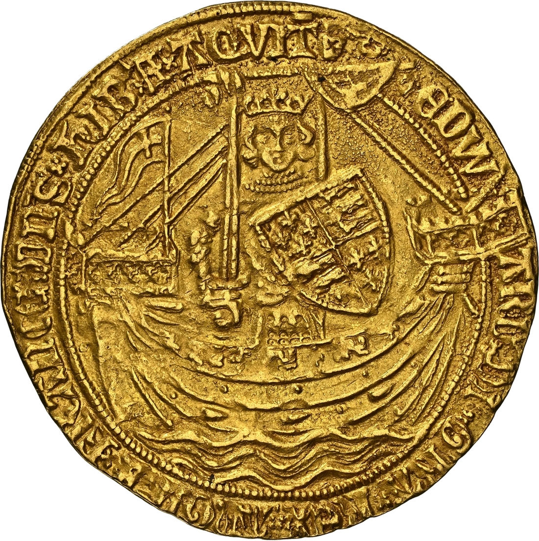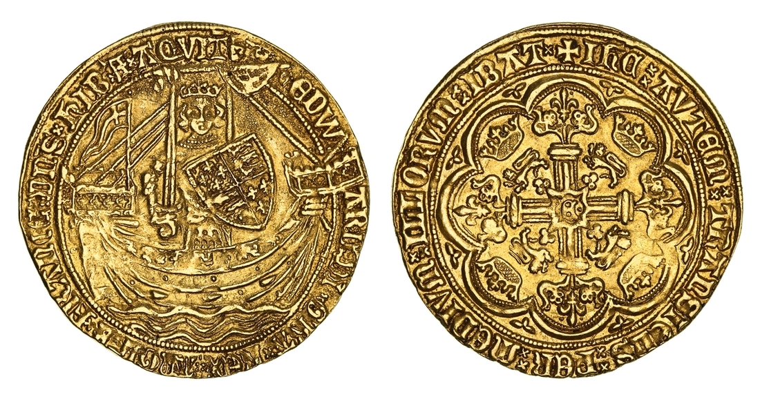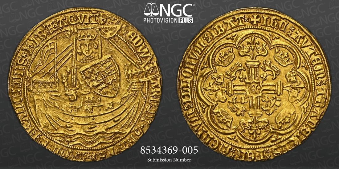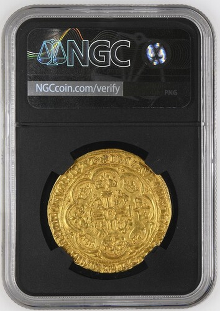 (x) NGC MS63 | Edward III (1327-1377), Fourth Coinage, Post-Treaty Period, Noble, 1369-1377, Group III, Calais, EDW | ARD x DI x GRA x REX x AnGL x Z x FRANC : DnS x hIB 'x Z x AQVIT '. saltire stops, King standing in ship, holding sword and shield, flag on stern-castle, ropes 3/1, ornaments 1-1-1-1, quatrefoils 5/4, rev. + IhC : AVTEM : TRAnSIENS : PER : MEDIVM : ILLORVM : IBAT x, double saltire stops, floriate cross, crowned leopards in angles, large E• at centre, 7.625g [117.68gns], 11h, i.m. cross pattée (cf. Schneider I, 115: North 1281; S.1521), struck from an overtly rusted obverse die with trace doubling to legends, otherwise an attractively even and full striking with a light and appealing cabinet tone with much underlying lustre, a pleasingly good very fine to extremely fine in parts, a splendid cabinet piece, in NGC Black 'Carrington' holder, rather generously graded MS63 (Cert. #8534369-005)