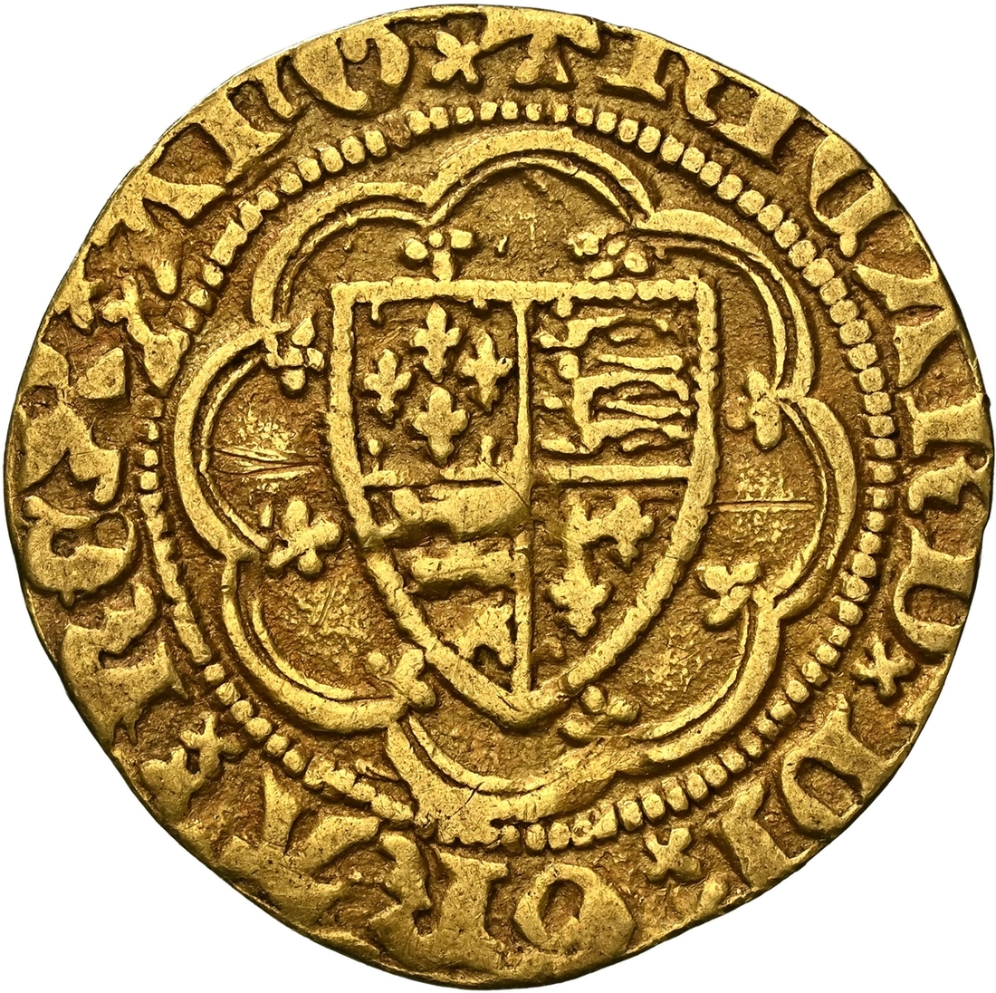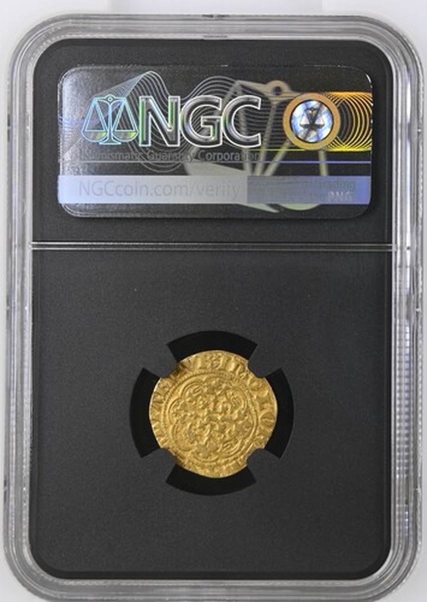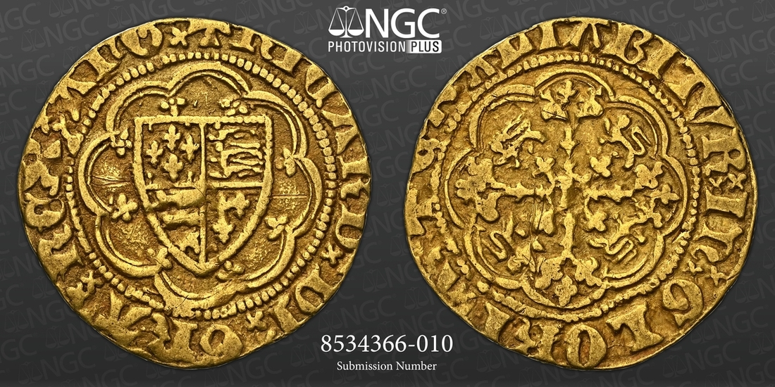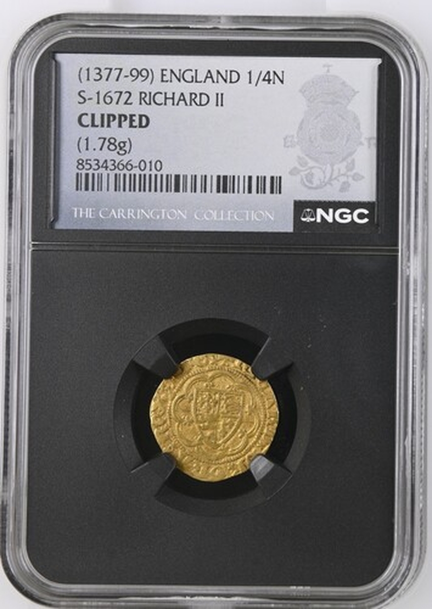 (x) Richard II (1377-1399), Quarter-Noble, Type IA, Tower (London), + RICARD : DI : GRA : REX : AnG x double saltire stops, Royal Shield quartered with the Arms of France and England, all within a double tressure of eight arches, plain above shield, rev. + EXALTABITVR : In : GLORIA., floriate cross, leopards in angles, R in centre [rotated at 90 degrees clockwise to i.m.], 1.776g [27.42gns], 6h, i.m. cross pattée (Webb Ware 1a; Stewartby Ia; Schneider I, 140/125 same obverse die [reused in 1B]; North 1317; S.1672), lightly clipped and scratched, otherwise soft cabinet tone, almost very fine, rare, in NGC Black 'Carrington' holder (Cert. #8534366-010)