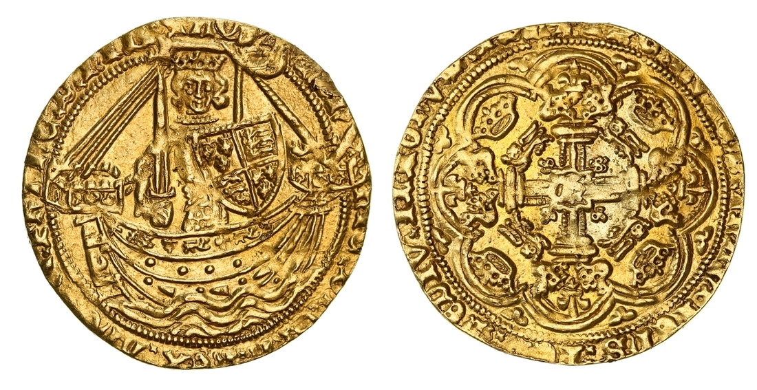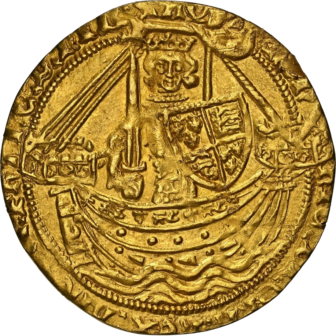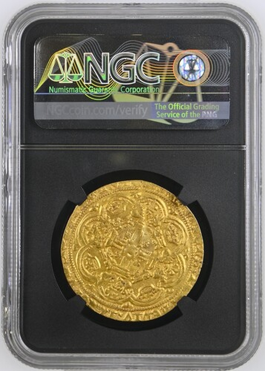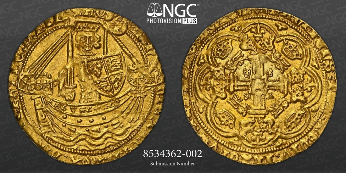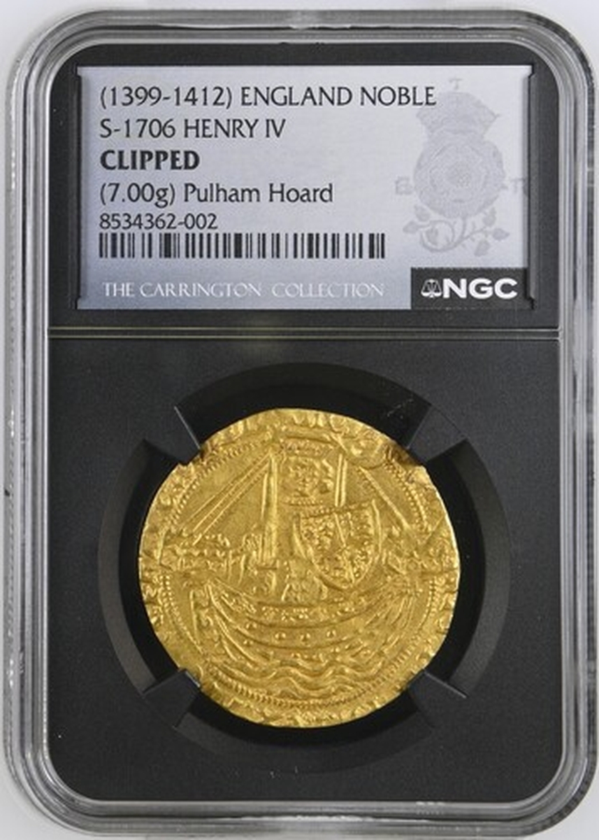 (x) Henry IV (1399-1413), Heavy Coinage, Noble, c. 1399-1405, Type Ic, Tower (London), hEN | RIC x DI x GRA x REX : ANGL 'x S : FRANC 'x D 'x hIB ' S AQ | T' King standing in ship, holding broad sword and Lancastrian shield repunched with three lys (2/1) of the 'Ancien Régime', ornaments 1-1-1-1, ropes 3/1, quatrefoils 4/4, crescent on rudder, rev. + IhC : AVTEM : TRANSIENS : PER : MEDIV 'x ILLORVM : IBAT, double saltire stops, floriate cross with crowned 'small' leopards in angles, h at centre, voided trefoils on cusps, larger trefoils in spandrels, 6.995g [107.94gns], 11h, i.m. cross pattée (F A Walters, "The Coinage of Henry IV", (Numismatic Chronicle IV, 1905), pp. 252-256 ['Before his 6th Year']; C E Blunt, 'The Heavy Coinage of Henry IV' [BNJ XXIV, 1942], p. 23 and Type Ia, 6 = Forster [1868], 25 = Hon. Marsham-Townshend [1888], 312 = A D Clarke [1891], 37 = Montagu II [1896], 475* = Durlacher [1899], 53* = Murdoch I, 310* = Glens (22 November 1938), 483 = Lockett III, 3065* = Schneider I, 196* same obverse die; Pulham Hoard 5 this coin; BMC -; North -, cf. 1336; S.1706), struck with aged dies and uniformly clipped as expected for this pre-Debasement issue from a celebrated 1430-era hoard deposit, otherwise attractively lustrous and considerably bolder than very fine, OF THE HIGHEST RARITY, with only two specimens of this class recorded since 1905; this being the only at present available to commerce and the reverse die unknown to Blunt and Schneider, in NGC Black 'Carrington' holder (Cert. #8534362-002)