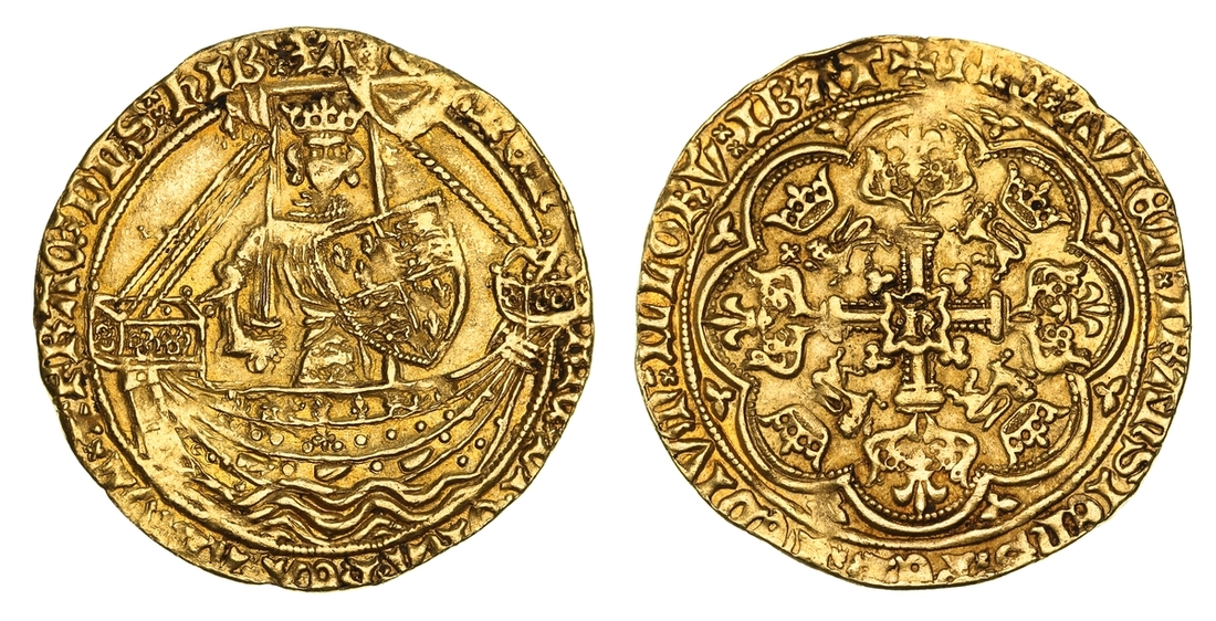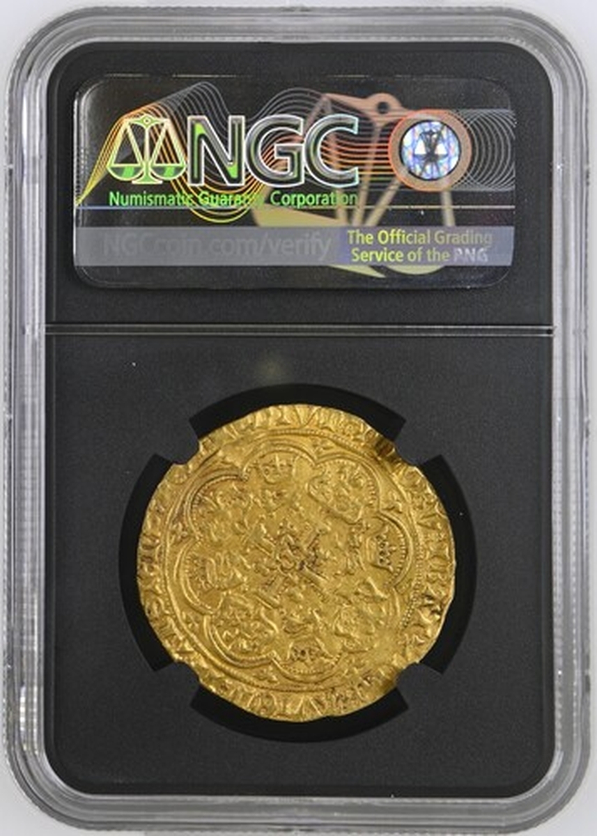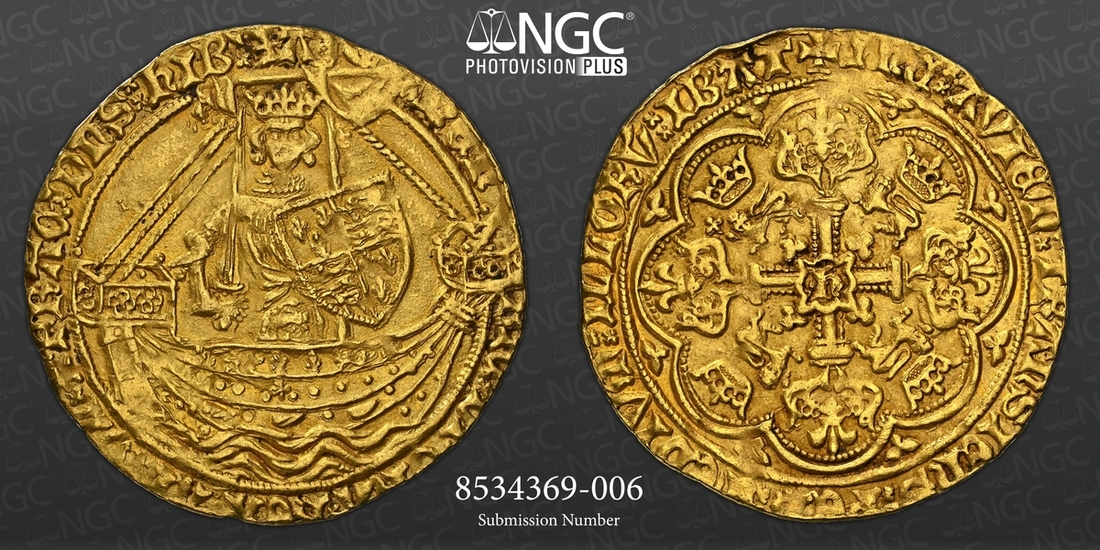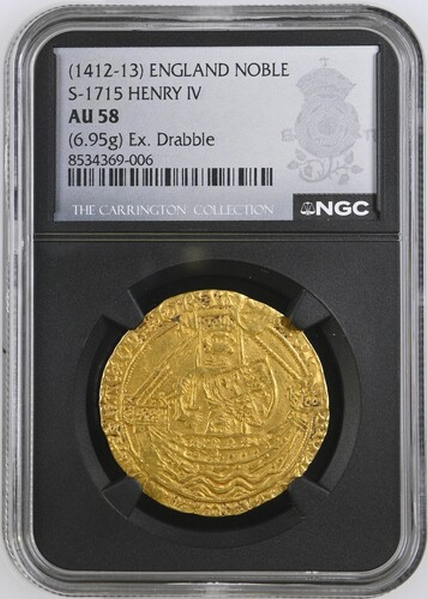 (x) NGC AU58 | Henry IV (1399-1413), Light Coinage, Noble, current 12 April 1412 - 1413, Type V, Tower (London), hEN | RIC x DI 'x GRA 'x REX 'x AnGL 'x Z x FRAnC 'x DnS : hIB 'x Z 'x A-C, King standing in ship, holding broad sword and Lancastrian shield, trefoil and annulet on side of ship, ropes 3/1, ornaments 1-11-1, quatrefoils 3/4, rev. + IhC : AVTEM : TRANSIEnS : PER : MEDIVM : ILLORV : IBAT, double saltire stops, floriate cross, crowned leopards in angles, large h and pellet, additional trefoil in first quarter, 6.935g [107.04gns], 4h, i.m. cross pattée (Raynes 27 same obverse die; Fishpool 6ff; Schneider I, 209 same dies; North 1355; S.1715), struck from lightly rusted obverse die, and clipped as usual for series, otherwise sumptuously cabinet golden-orange toned with much underlying lustre, a most pleasing very fine, very rare, particularly so this honest and wholesome, in NGC Black 'Carrington' holder, graded AU58 (Cert. #8534369-006)