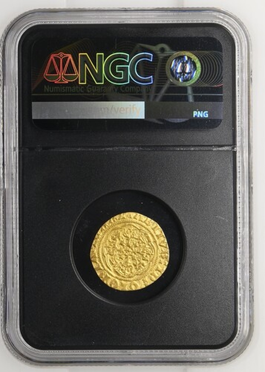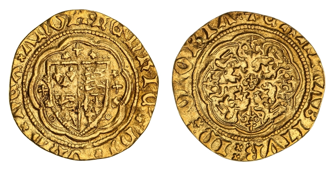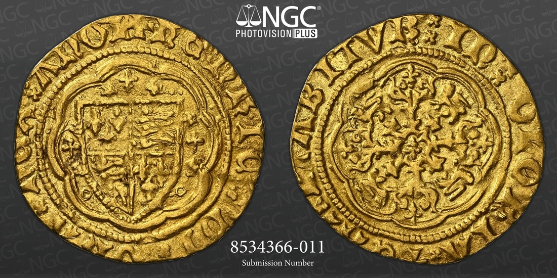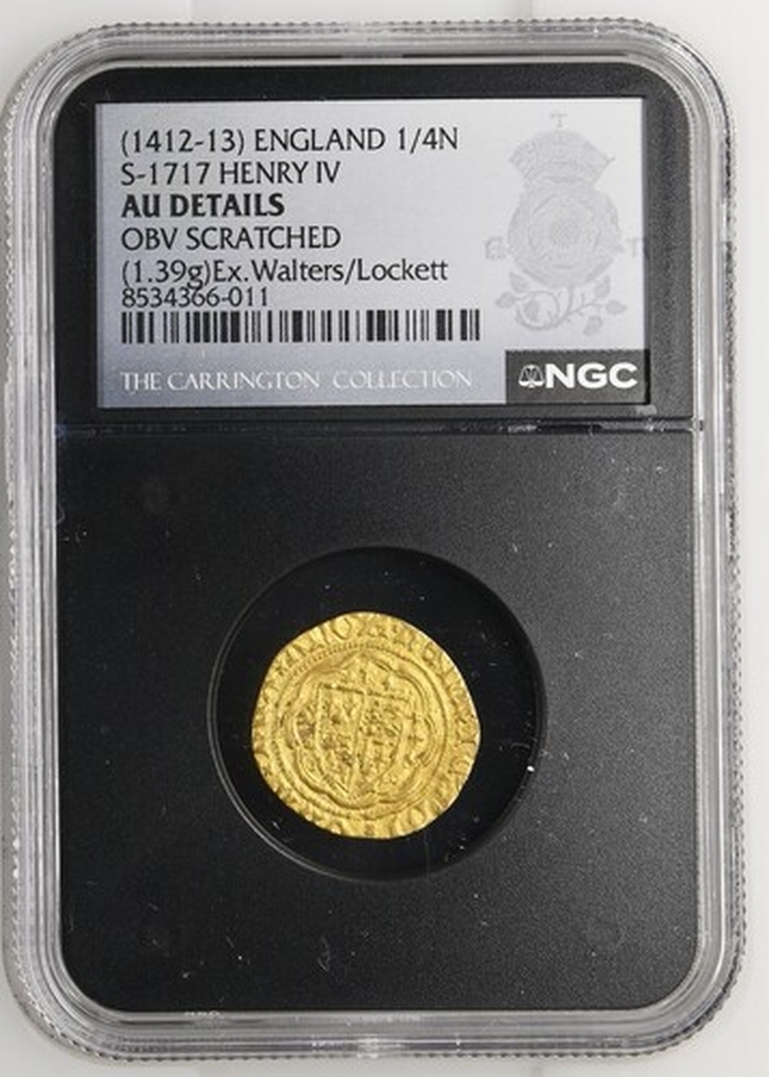 (x) NGC AU | Henry IV (1399-1413), Light Coinage, Quarter-Noble, current 12 April 1412 - 1413, Tower (London), + hEnRIC x DI x GRA x REX x ANGL, Royal Shield in double tressure of eight arches, lys above, trefoils and annulets flanking in fields, rev. + EXALTABITVR : In : GLORIA : floriate cross, leopards in angles, lys at centre, all in double tressure of eight arches, 1.395g [21.50grns], 10h, i.m. cross pattée (F A Walters, "The Coinage of Henry IV", (Numismatic Chronicle IV, 1905), p. 298, no. 4 this coin; Schneider I, 212; North 1357; S.1717), a scarcely perceptible scratch across shield and lightly clipped with some brightness, otherwise residually lustrous and attractively uniform for strike, very fine, the reverse bolder, extremely rare and with an exceptional pedigree, in NGC Black 'Carrington' holder, graded Almost Uncirculated (Cert. #8534366-011)