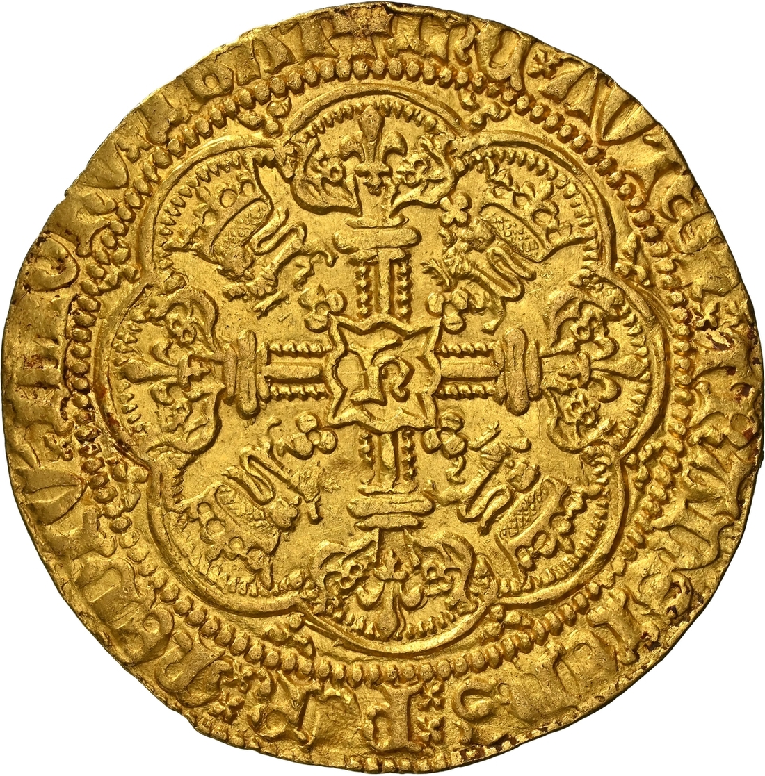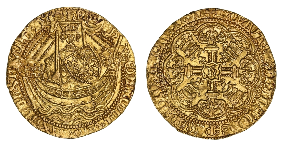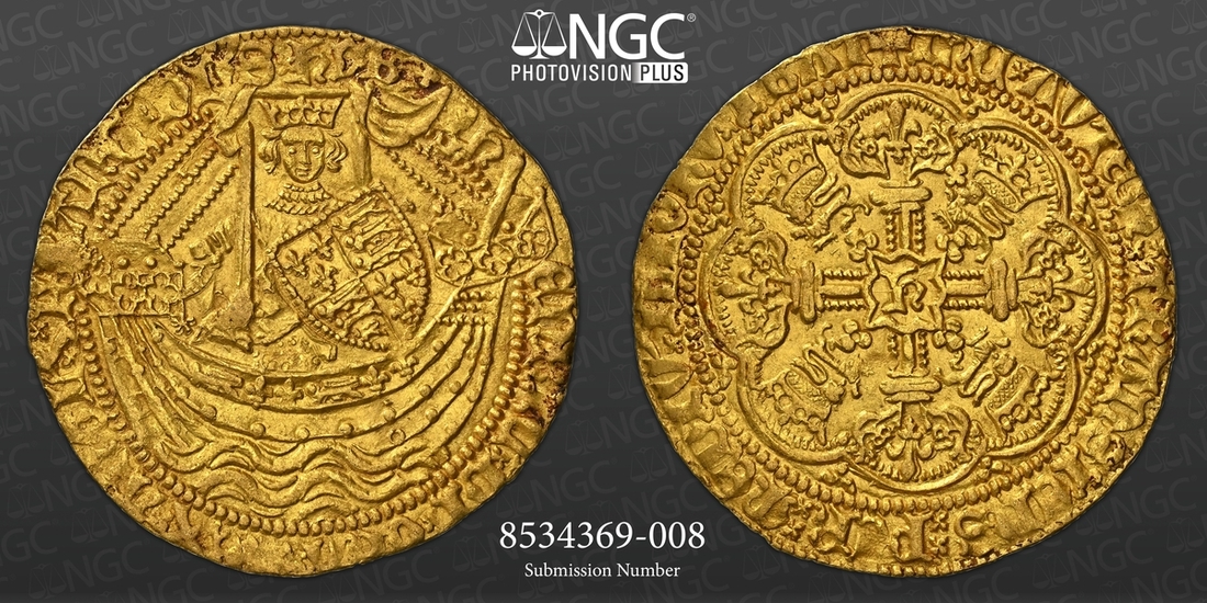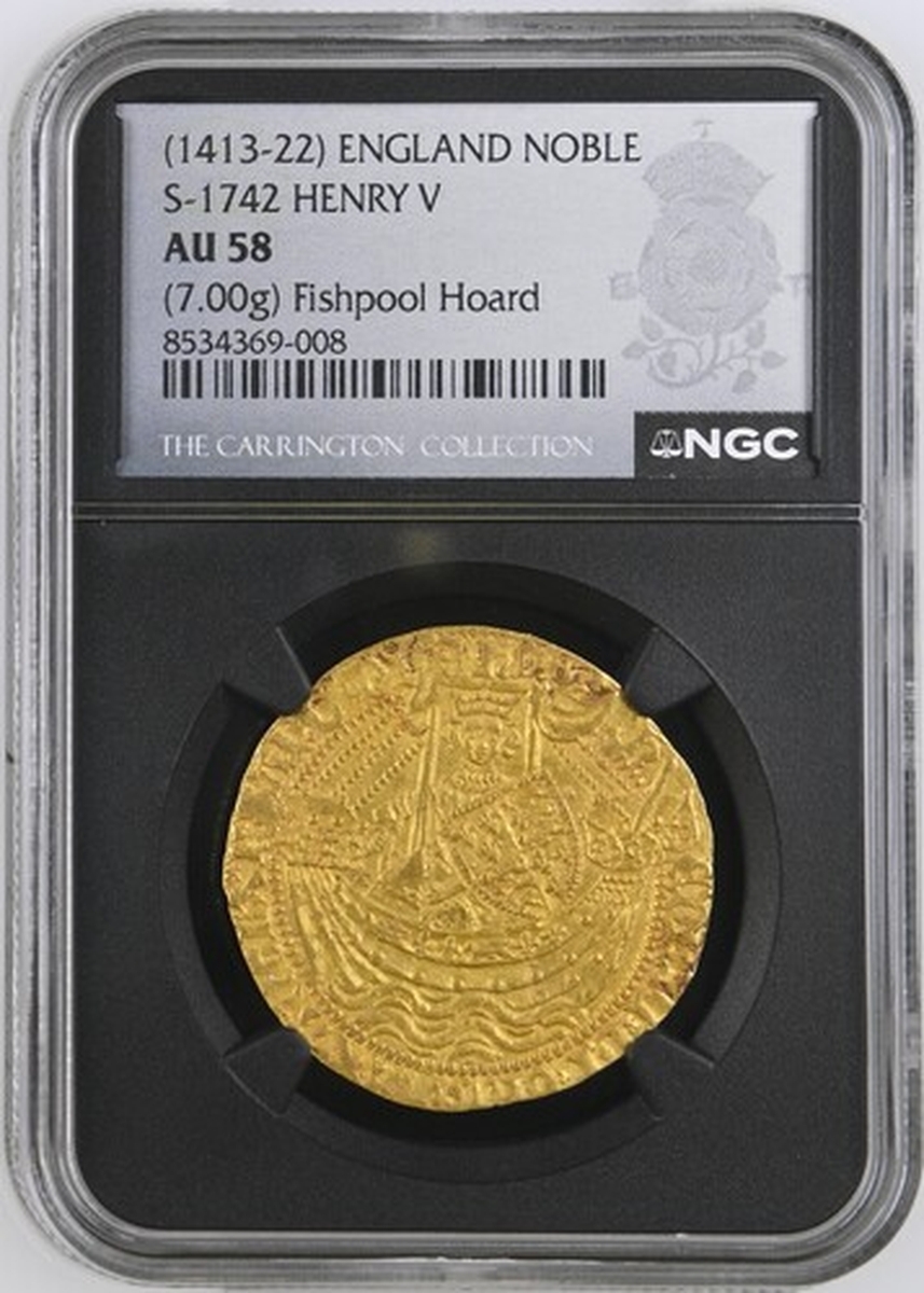 (x) NGC AU58 | Henry V (1413-1422), Noble, Class C, Tower (London), h | EnRIC x' DI x' GRA x' REX x AnGL x' S x' FRAnC x' DnS x hyB, single saltire, King standing in ship, holding sword and shield, mullet by sword, ropes 3/2, ornaments 11-11, quatrefoils 3/3, and quatrefoil above sail, rev. + IhC x' AVTEM : TRANSIENS : PER : MEDIV x' ILLORV x' IBAT, single and double saltire stops, floriate cross, trefoils and crowned leopards in angles, large h at centre, additional quatrefoil in second quarter, 6.980g [107.70grns], 9h, i.m. cross pattée (Brooke IVa/IV; Schneider I, 227; North 1371; S.1742), some peripheral striking softness, nonetheless a truly splendid coin with a magnificent portrait of this celebrated "Agincourt King", lightly toned and lustrous, extremely fine, a superb connoisseur's piece with an exemplary pedigree, in NGC Black 'Carrington' holder, graded AU58 (Cert. #8534369-008)