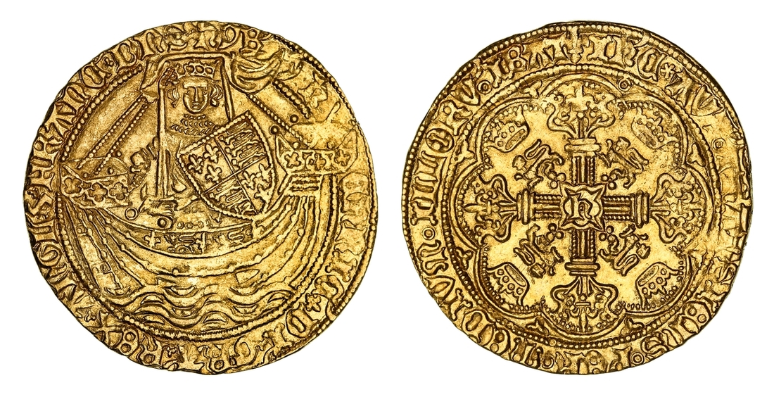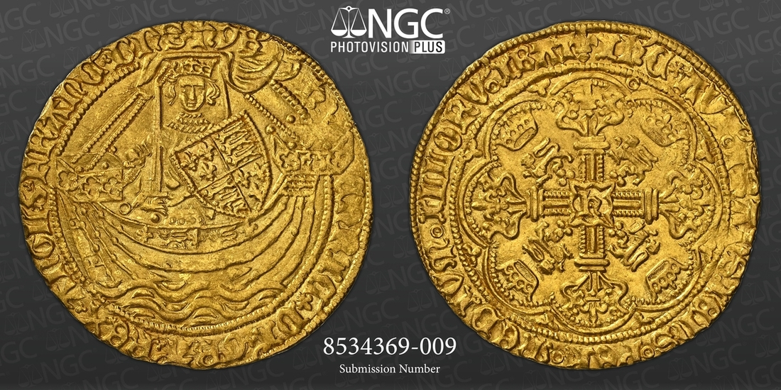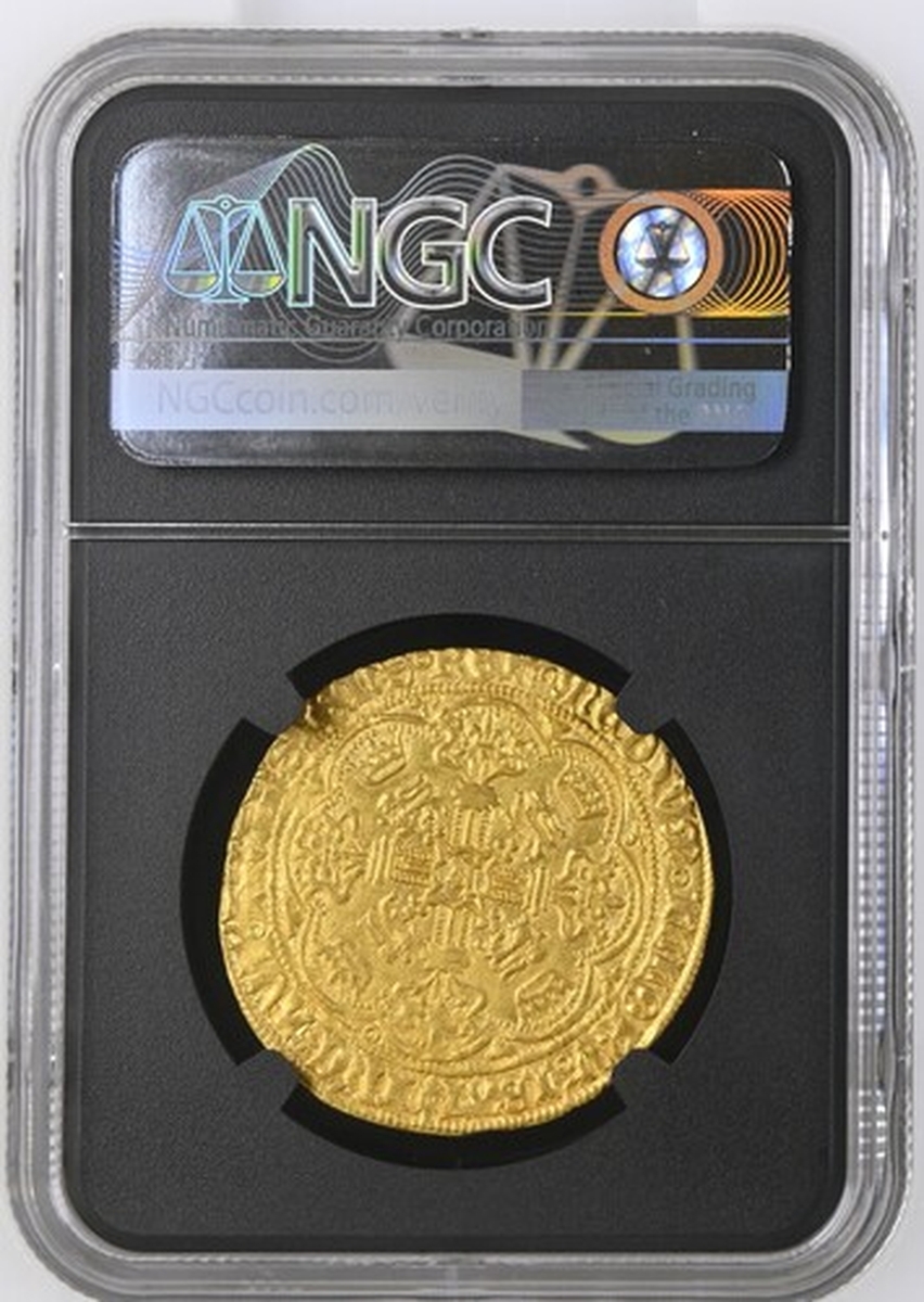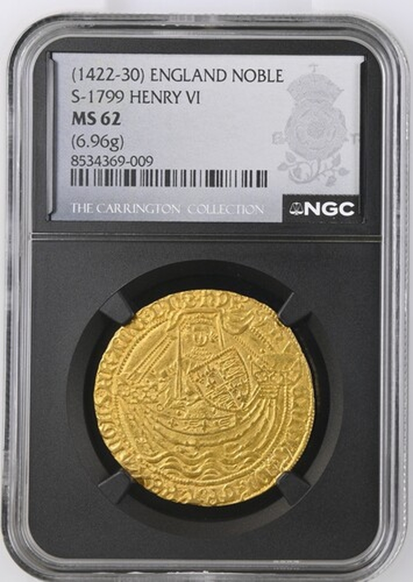 (x) NGC MS62 | Henry VI, First Reign (1422-1461), Annulet Issue, Noble, 1422-1427, Tower (London), h | ENRIC '(lys) DI . GRA '. REX . AnGL . Z ' FRAnC '(lys) DNS . hyB, trefoil stops, King standing in ship, holding sword and shield, annulet at right arm, ropes 2/1, ornaments 1-1-1, quatrefoils 3/3, rev. (m.m.) Ih'C * AVT '. TRAnSIEnS . PER . MEDIVM . ILLORV'. IBAT, annulet stops, floriate cross, annulet in first spandrel of second quarter otherwise trefoils in spandrels, 6.959g [107.36grns], 6h, i.m. lys (Schneider I, 274-290; North 1414; S.1799), a trace of ghosting to legends and some brightness, otherwise lustrous with an appealing cabinet honey-golden tone, practically extremely fine, and a superior example of this more familiar issue, in NGC Black 'Carrington' holder, graded MS62 (Cert. #8534369-009)