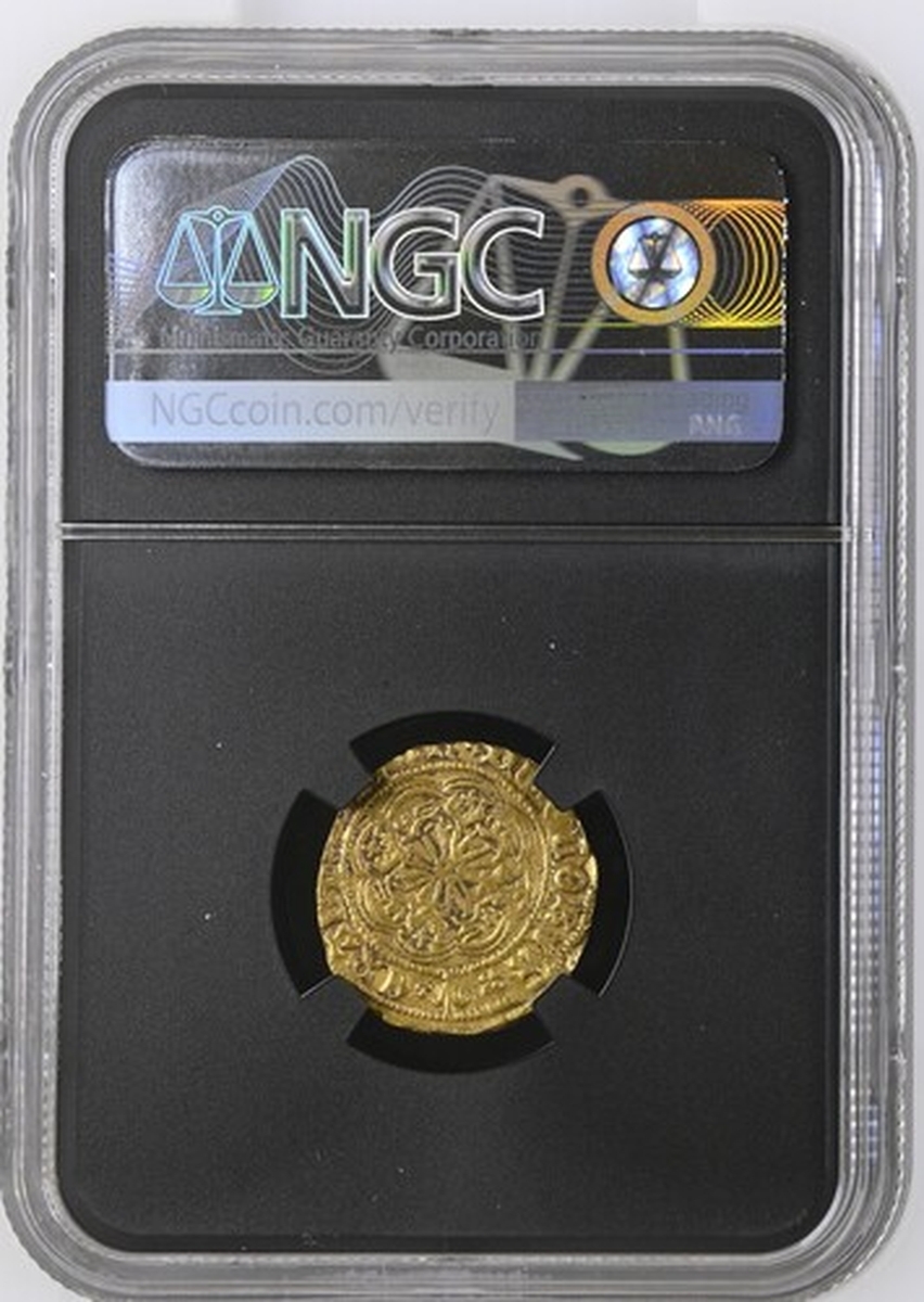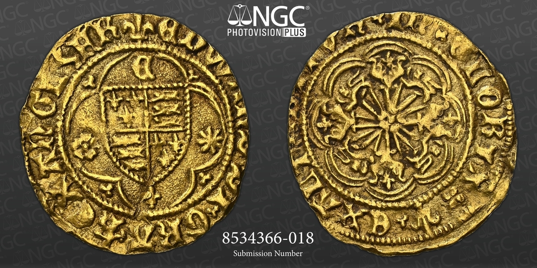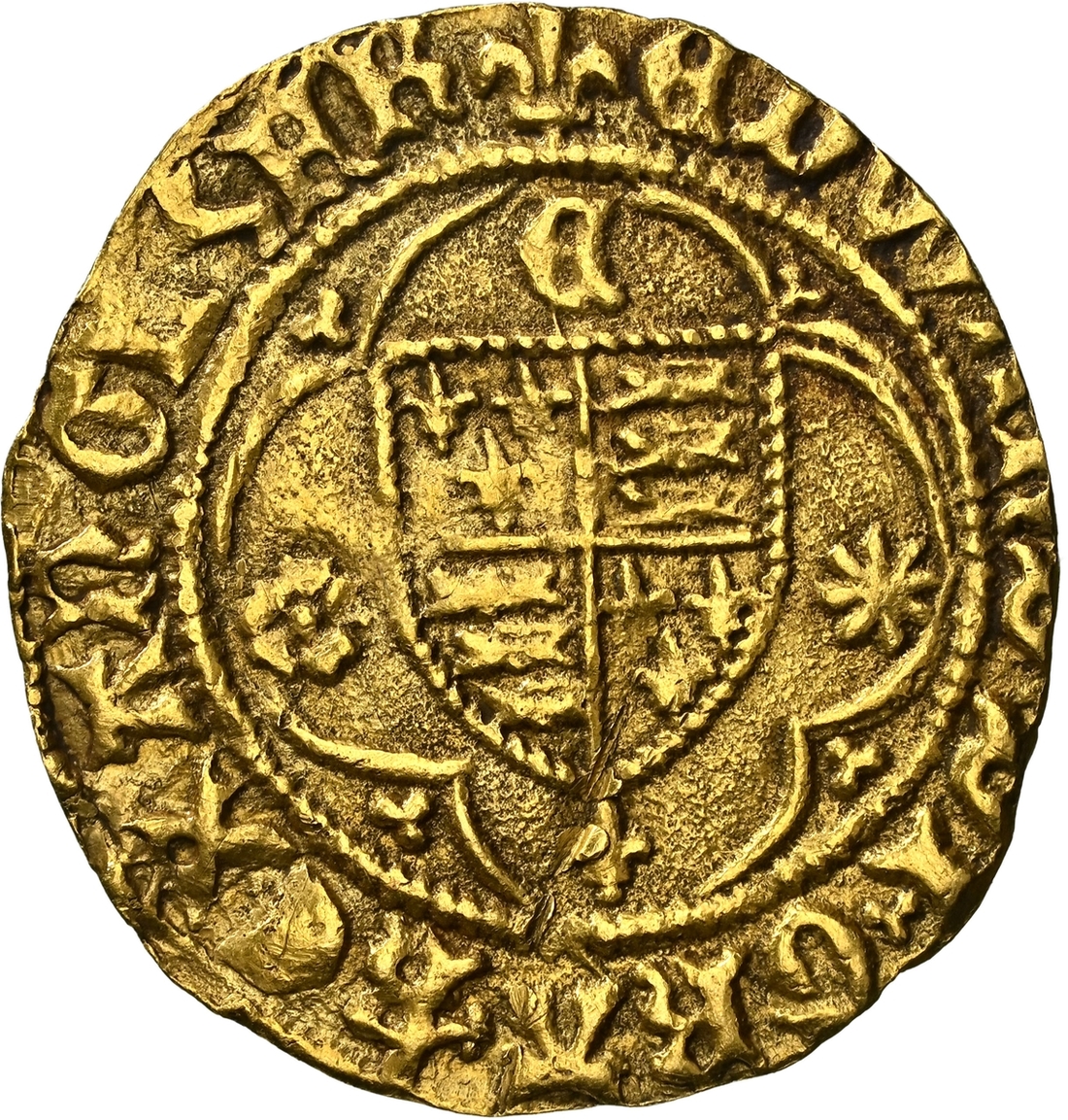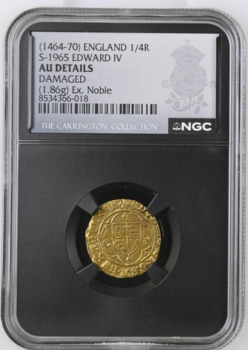 (x) NGC AU | Edward IV, First Reign (1461-1470), Quarter-Ryal, Tower (London) [or York], Group VII, (m.m.) EDWARD . DI . GRA ' REX ANGL Z FR, trefoil stops, E above Royal Shield in double tressure of eight arches, dividing rose and sun,all inside quatrefoil, trefoils in spandrels, rev. (m.m.) EXALTABITVR . IN . GLORIA, large trefoil stops, quatrefoil after GLORIA, floriate cross, leopards in angles, expanding sun at centre, all in double-octofoil, cusps and spandrels plain, 1.862g [28.68grns], 6h, m.m. lys (B&W 17; North 1560; S.1965), subtly creased and lightly clipped, otherwise uniformly struck up for this surprisingly scarce issue, with a soft cabinet tone, very fine or marginally bolder, in NGC Black 'Carrington' holder, graded Almost Uncirculated (Cert. #8534366-018)