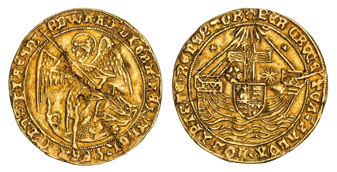 (x) Edward IV, First Reign (1461-1470), Angel, Type 1, 1464-1469, EDWARD .' DI . GRA : REX ANGL .' Z FRANC DnS hI BER, saltire stops, St Michael vanquishing Dragon, ropes 3/1, quatrefoils 3/3, rev. * PER CRVCEM TVA .' SALVA . nOS . XPISTE . REDEMTOR ', trefoil stops, ship surmounted by square-topped shield and mast dividing Rose and Sun, trefoils in fields, 5.012g [77.34grns], 10h, m.m. rose (Blunt & Whitton, Type V; Webb-Ware, English Gold Coinage: 1465-1485, p. 121, Pl. 2, no. 1, die 1 this coin [Type 1]; cf. Schneider I, 417-418; cf. Davis 309 = Brice = Montagu II, 592 = Sir John Evans = Lockett II, 1550 = Beresford-Jones 11; North 1561; S.1967), hairline striking cracks radiating through a crimped but full round flan, nevertheless with a delightful orange-peel and honey golden lustrous cabinet tone, struck details very fine, UNIQUE, and the first of this largely forgotten but excessively rare series to appear at auction in over 40 YEARS