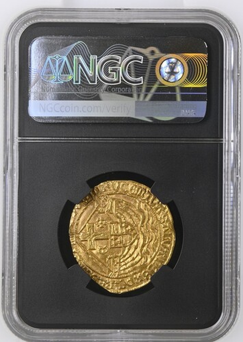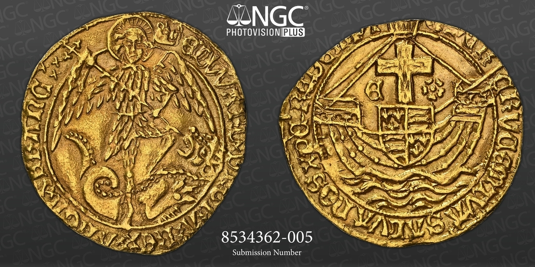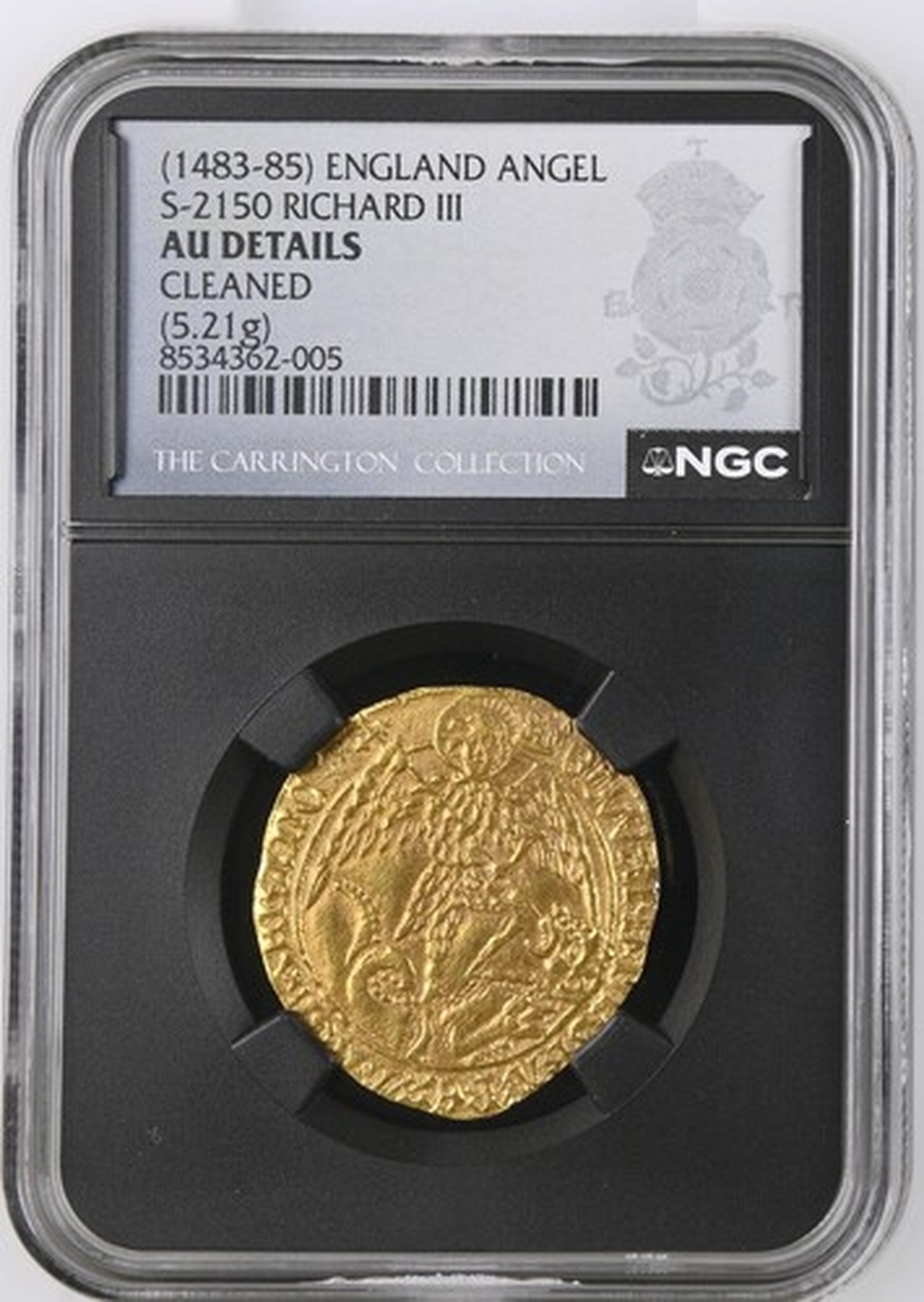 (x) NGC AU | Richard III, in the name of Edward IV or V (1483-1485), Gold Angel, (m.m.) EDWARD .' DI .' GRA : REX : AnGL . Z FRANC :., saltire stops, St. Michael vanquishing the Dragon, rev. (m.m.) PER | CRVCEM TVA ' SALVA nOS XPC ' REDEMPT ', ship surmounted by square-topped shield and mast dividing E and Rose, 5.19g [80.09grns], 9h, m.m. boar's head / dimidiated sun-and-rose (Lord Thurlow [1851], 365 = Evelyn Rashleigh [1909], 741 ['broken and repaired']; C E Blunt, "The Coinage of Edward V" [BNJ, 1937], p. 224, no. 2 & Plate, no. 4 same obverse die [Richard III]; Schneider I, 483; North 1670; S.2150), delicately removed from jewellery at reverse 12 o'clock, and with traces of clipping to an elongated and bright but handsomely retoned flan, superb and uniform for strike, a bolder very fine thus, and OF THE HIGHEST RARITY, but six specimens known of this transitional Pyx Mark / Regnal name combination; extraordinary, practically peerless and considered the finest known specimen, in NGC Black 'Carrington' holder, graded Almost Uncirculated ~ Cleaned (Cert. #8534362-005)
