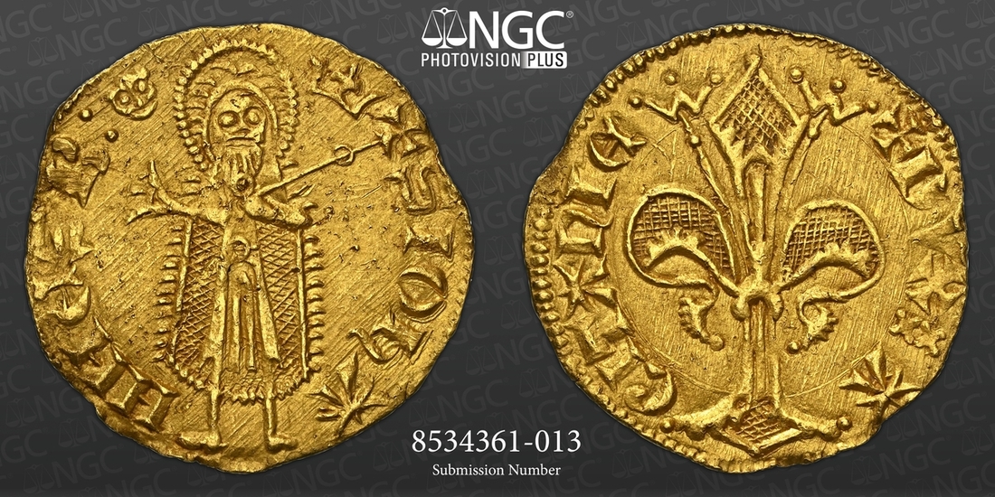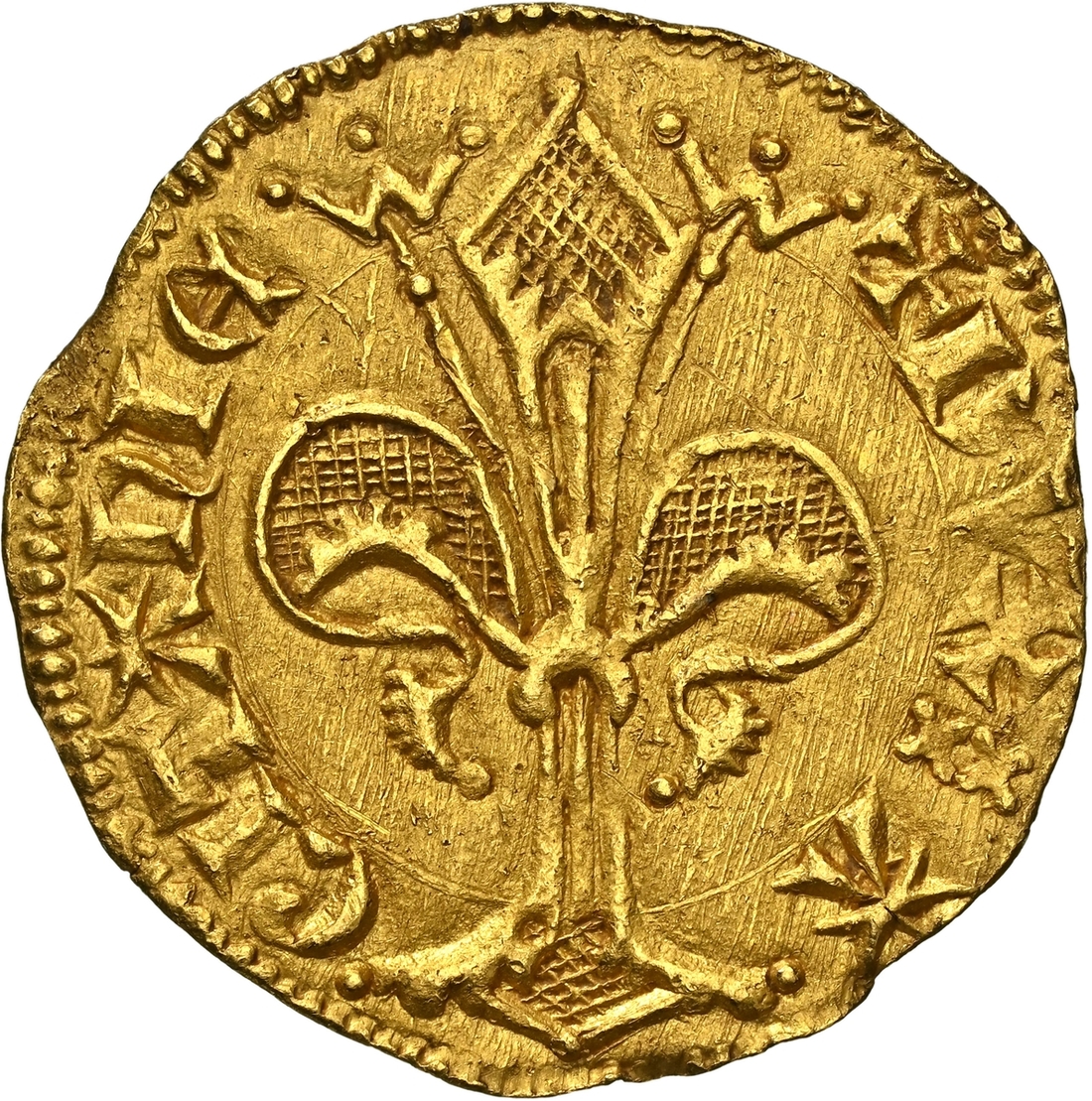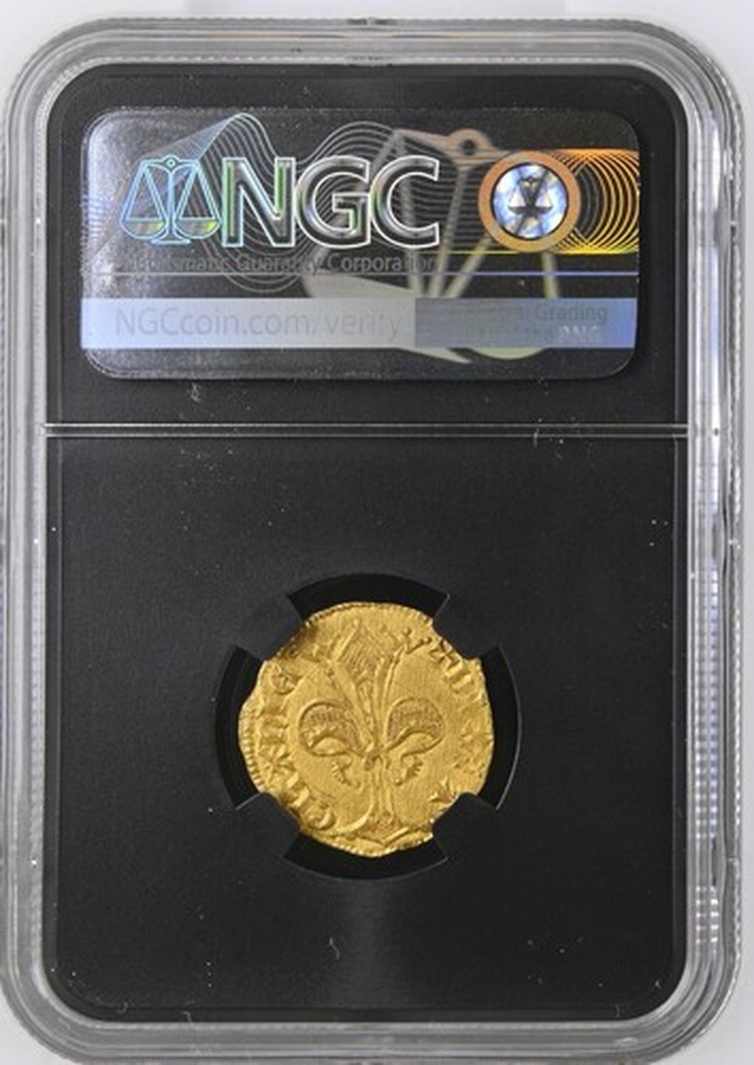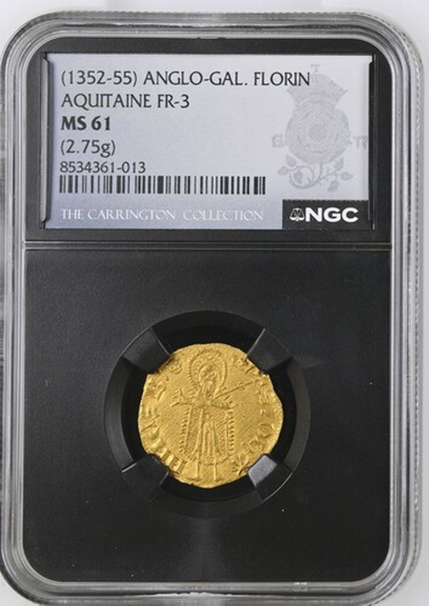 (x) NGC MS61 | Anglo-Gallic, Edward III (1327-1377), Florin d'Or, 1354-1355, Bordeaux, under Bernard de la Brète, (m.m.) S. IOh'A’NNUS B, Saint John the Baptist standing facing, rev. + DVX : A | QiTAniE, large fleur-de-lys, 2.738g [42.25grns], 12h, m.m. lion's head and crown / cross pattée (Schneider III, 6; Ainslie, Pl. I, 1; O'Hagan [1907], 650 same dies; Poey d'Avant 2832; Hewlett, pp. 44-45, no. 2 & Pl. III, I; Beresford-Jones 4/5; Elias 36d; S.8036), die striations in mint-fresh fields, handsomely lustrous and boldly struck up for this extraordinarily short-lived and commensurately rare 'failed' issue, virtually mint state, and OF THE HIGHEST RARITY, one of the most iconic and short-lived coins of the Anglo-Gallic series!, in NGC Black 'Carrington' holder, graded MS61 (Cert. #8534361-013)