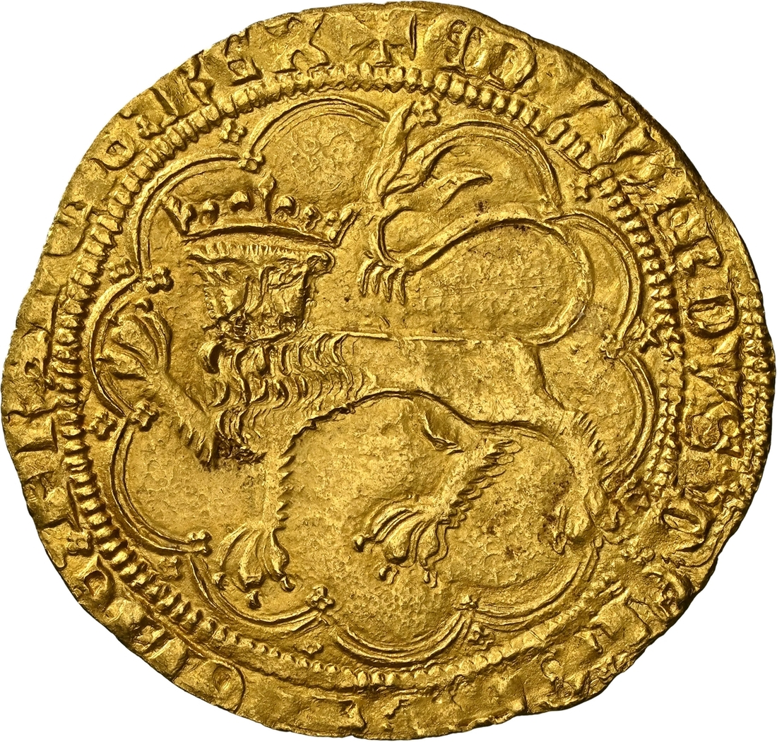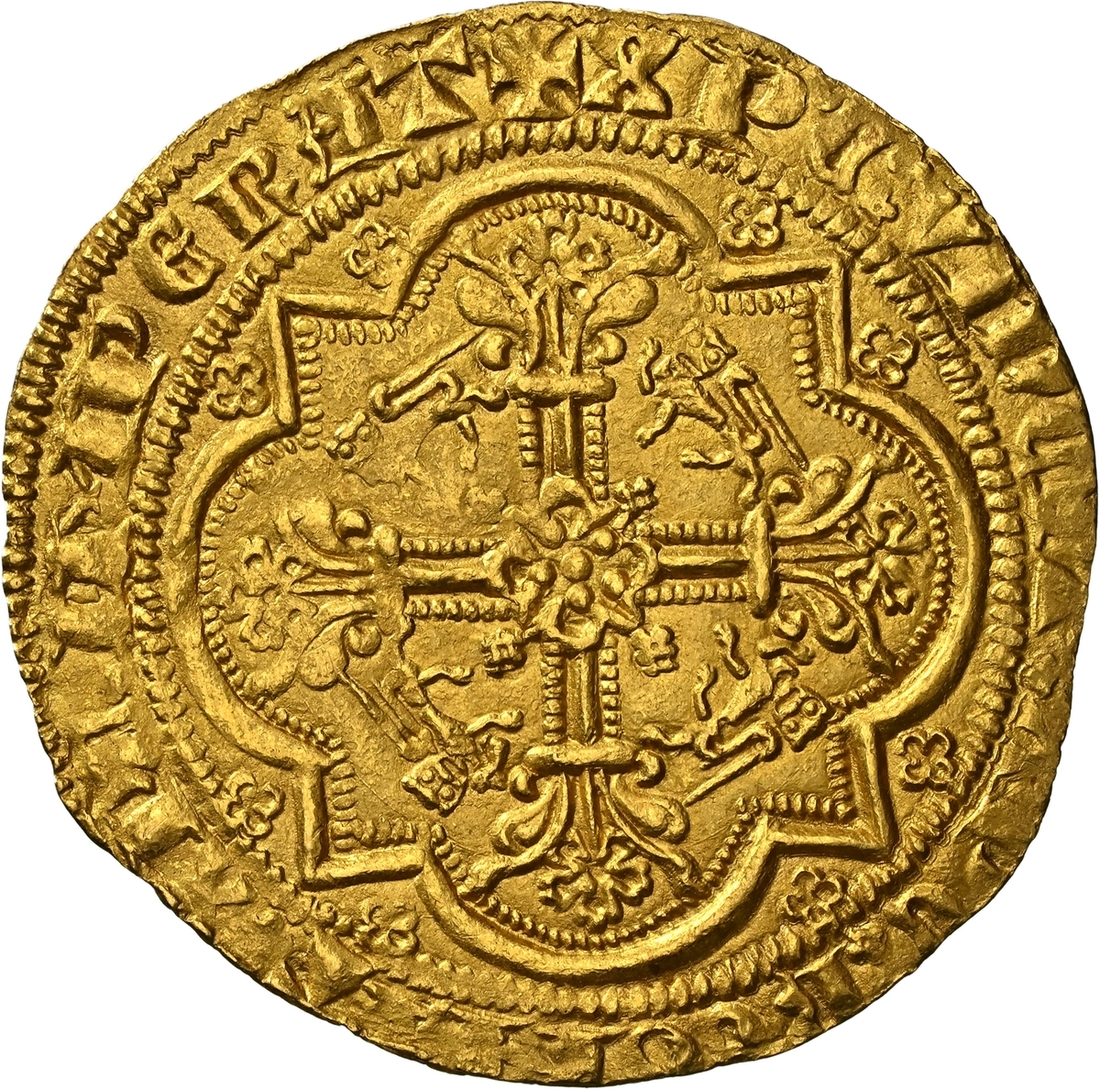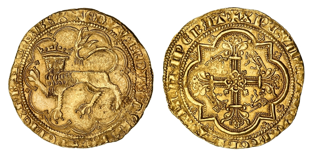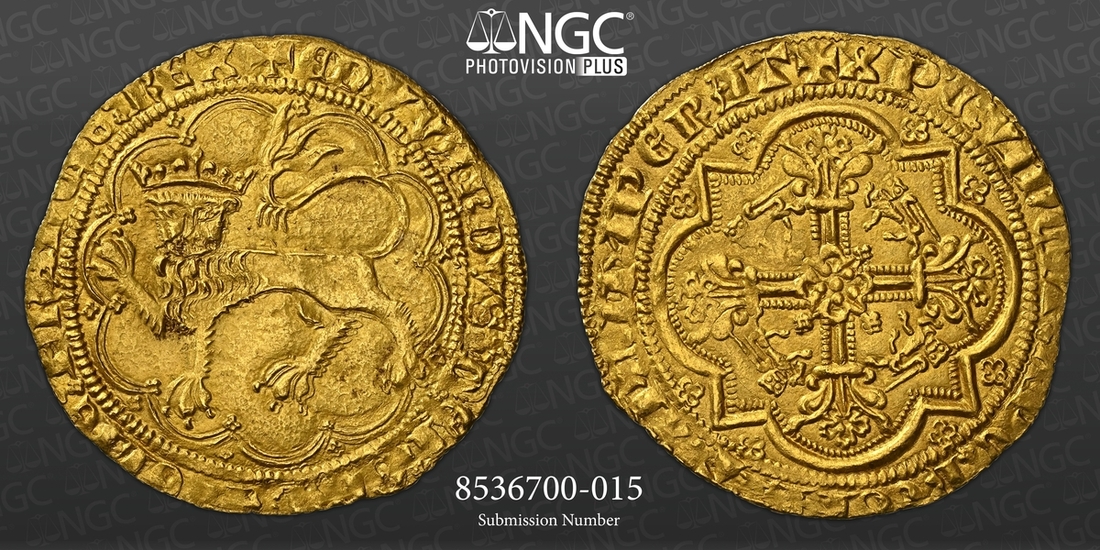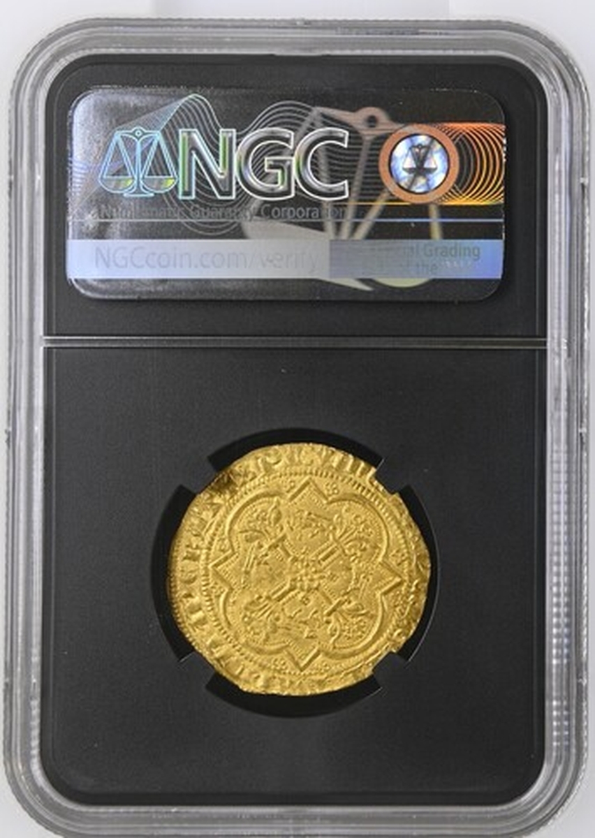 (x) NGC MS64 | *Top Pop* | Anglo-Gallic, Edward III (1327-1377), Third Issue, Leopard d'Or, + EDVVARDVS : DEI : GRA : ANGLIE : FRANCIE : REX, rosette stops, crowned leopard passant left, rev. + XP'C : VINCIT : XP'C : REGNAT : XP'C : IMPERAT, rosette stops, ornate cross fleury, beaded inner tressure, voided quatrefoils in spandrels, 3.625g [55.94grns], 11h, m.m. cross pattée (Schneider III, 14; Elias 39 variety; S.8039), lightly clipped and with slight doubling to obverse, nonetheless lustrous, a bolder very fine for strike, in NGC Black 'Carrington' holder, graded MS64 (Cert. #8536700-015) [*Single Finest Certified*]