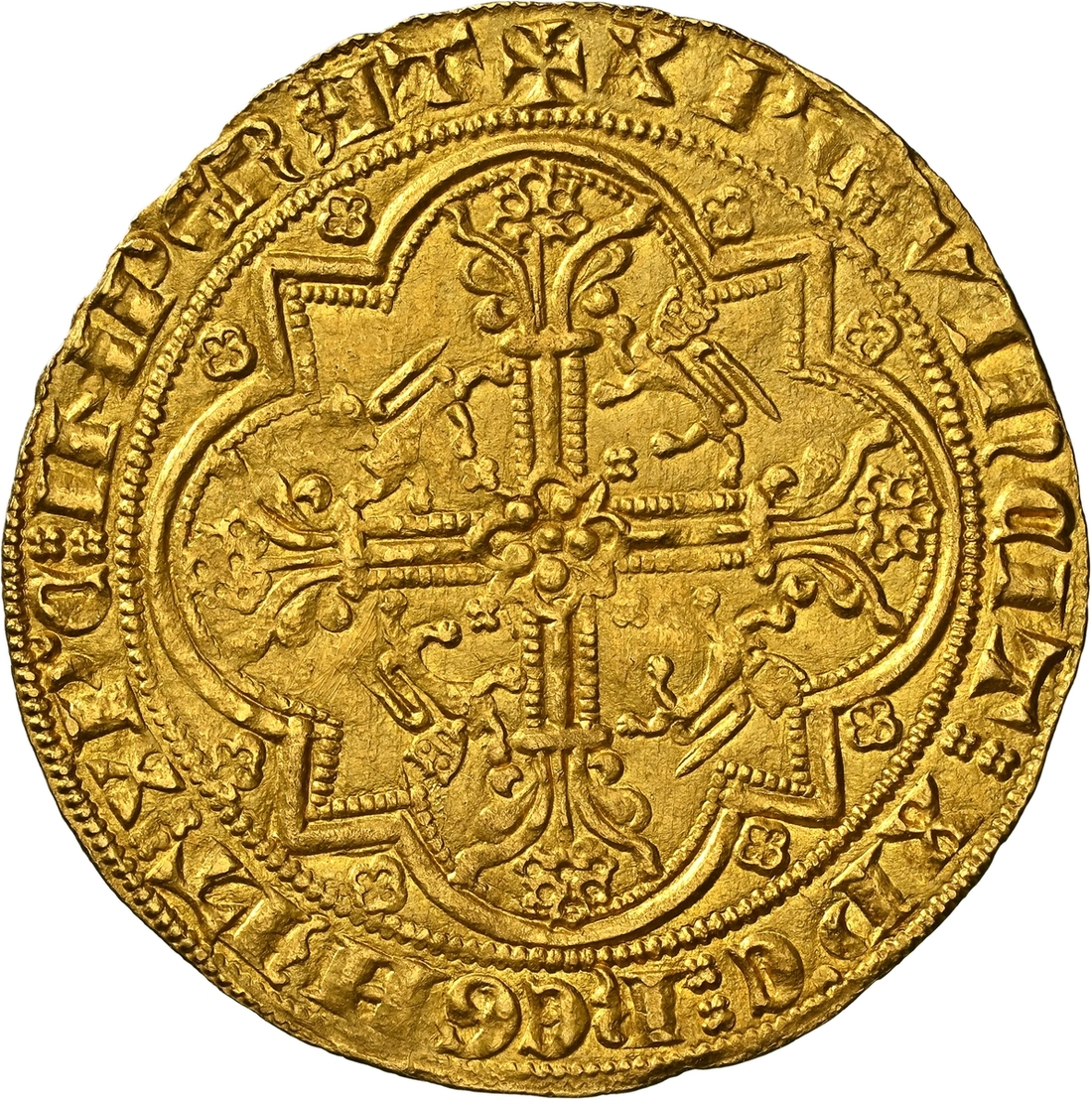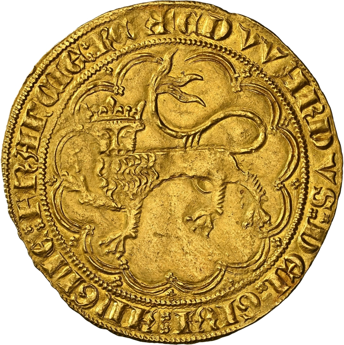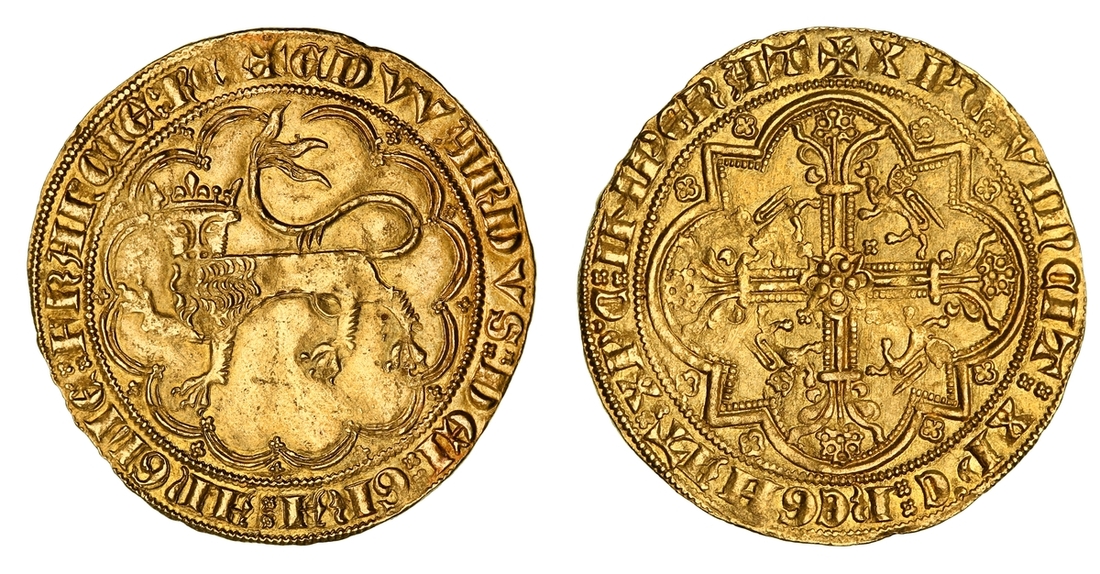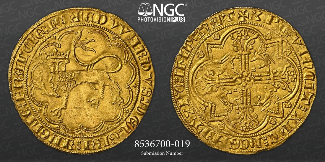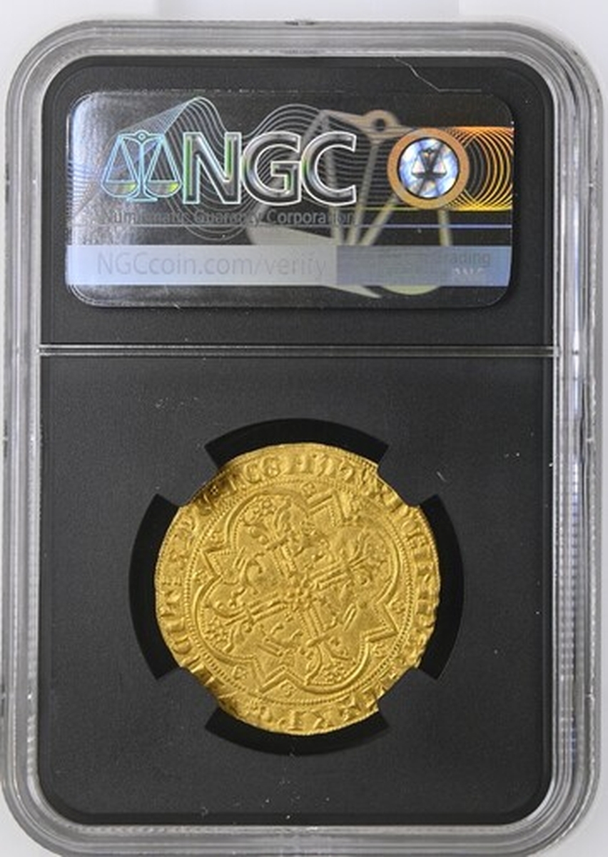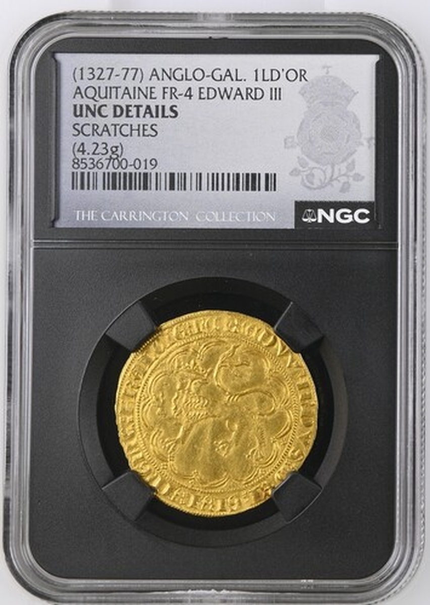 (x) NGC UNC | Anglo-Gallic, Edward III (1327-1377), Leopard d'Or, Bourdeaux, + EDWARDVS : DEI : GRA : AnGLIE : FRANCIE : REX, rosette stops, crowned leopard passant left, rev. + XPC : VINCIT : XPC : REGNAT : XPC : IMPERAT, ornate cross fleury, beaded inner tressure, voided quatrefoils in spandrels, 4.211g [64.98grns], 6h, m.m. cross pattée (Schneider III, 8; Elias 38a variety), some tiny planchet flawing, nonetheless a pleasing uniform strike to a neat full flan with much original lustre, almost extremely fine, in NGC Black 'Carrington' holder, graded Uncirculated (Cert. #8536700-019)